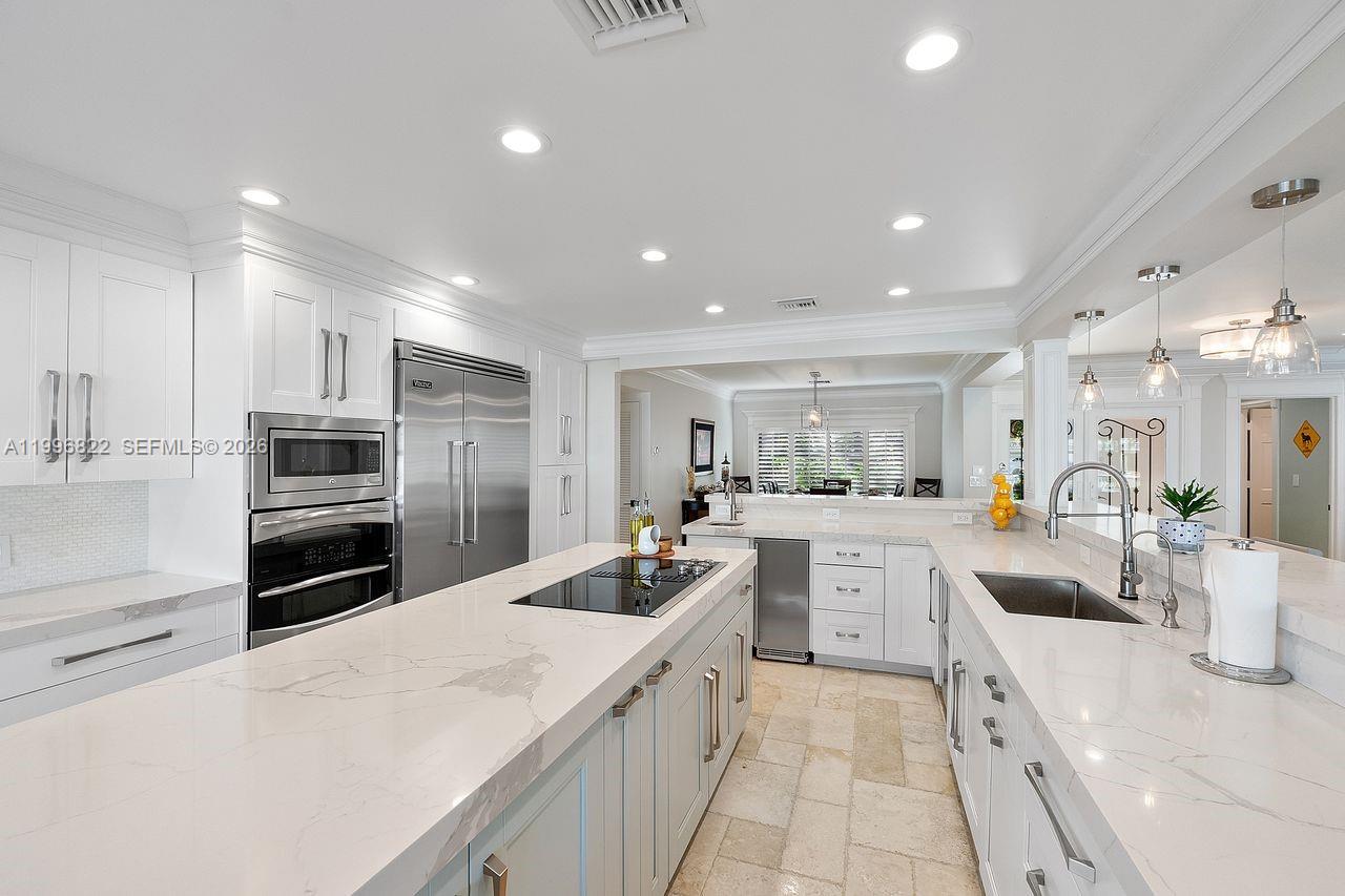 Rare opportunity to own a beautifully renovated deepwater estate home on prestigious Lake Placid in Lighthouse Point. The residence offers 80' of water frontage & direct 7 minute ocean access w/no fixed bridges, a true boater’s dream. Spanning 4, 100+SF under air, this exceptional 5-bedroom (2 primary suites) + office, 5. 5-bath pool home blends elegance & comfort with tumbled travertine flooring, an open family room with real fireplace & built-ins, a designer chef’s kitchen featuring quartz countertops, island seating, beverage refrigerator, ice maker, & extensive custom cabinetry. Cable railing staircase opens to loft area. Expansive 2nd fl primary suite is a private retreat with dual en-suite bathrooms, spa tub, walk-in closets, flex office/den & a balcony overlooking the waterway. Multiple additional bedrooms offer en-suite baths and flexible living options, including a junior suite with direct patio access. Enjoy South Florida living at its finest with a resort-style backyard featuring a saltwater pool with waterfall, covered patio, lush tropical landscaping, and outdoor shower. The new concrete dock is equipped with batter piles, two boat lifts (27, 000lb & 7, 000lb), 60-amp service, and is perfectly positioned for ultra-quick boating access—only 7 minutes to the ocean. Additional features include impact windows and doors, newer roof (2020), 2 AC systems, 2 tankless water heaters, surveillance & security system, epoxy garage floors & circular driveway for 8+ cars.