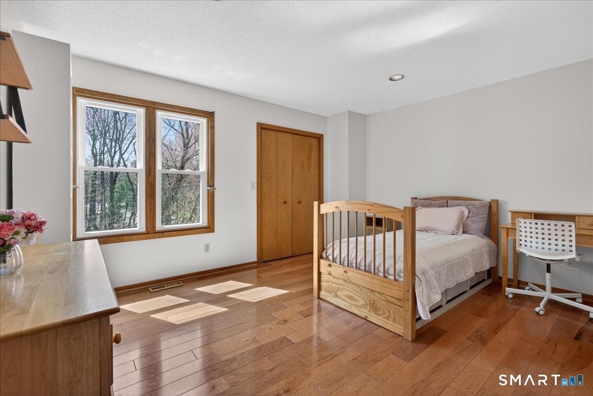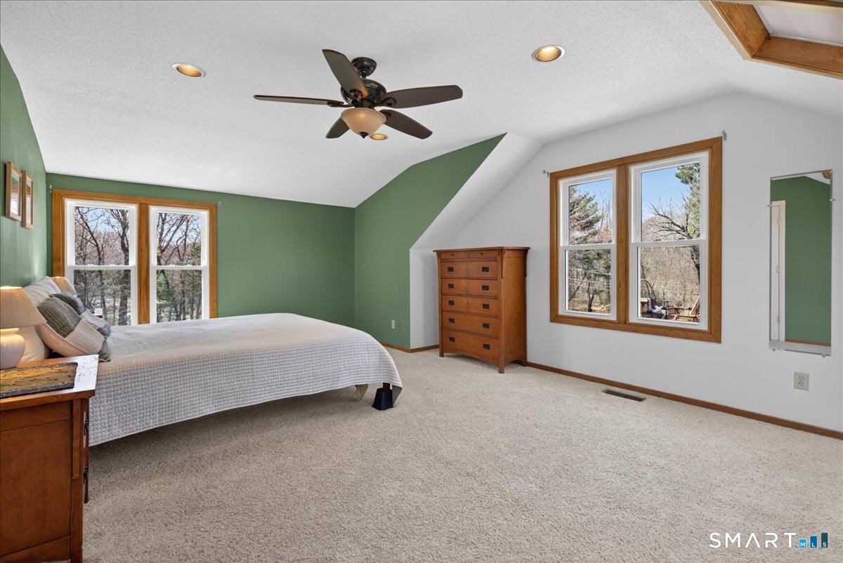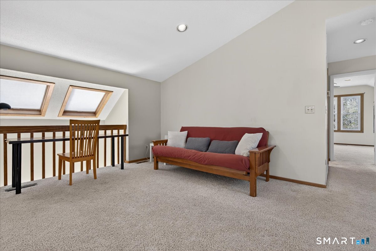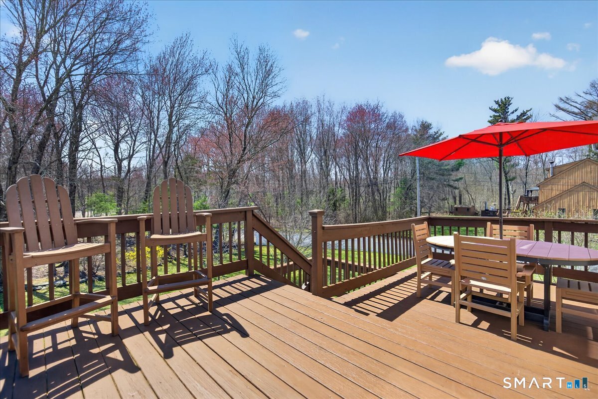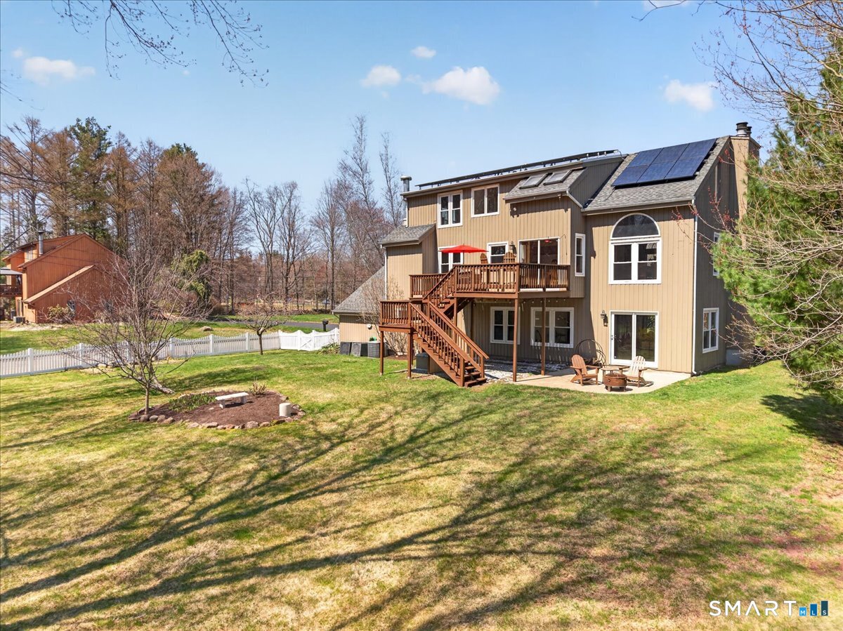 It doesn't get better than this extraordinary, sun-filled contemporary home, privately set off the road on a beautiful lot in the sought-after West Woods area. From the moment you step inside, the dramatic open staircase and soaring ceilings create an immediate sense of style and space. The stunning great room features oversized arched windows and gas fireplace, flowing seamlessly into the spacious dining room with a large picture window overlooking the landscaped yard. The expansive eat-in kitchen offers granite countertops, double ovens, a generous pantry, & direct access to an oversized deck, perfect for entertaining. The main level also includes two good size bedrooms and an updated full bath. Upstairs, you'll find a show-stopping loft ideal for a home office, along with a private primary bedroom suite featuring a walk-in closet, and a spa-like bath with a separate shower. The walk-out lower level adds incredible flexibility with a large family room with fireplace, full-size windows, walk out to the yard, and an additional bedroom or office and a full bath. Additional highlights include a two-car garage leading to a spacious mudroom/laundry area, pre-paid solar lease, newer windows, updated roof & furnace, garage doors, and fresh exterior paint. Gas heat and central air complete the package. Conveniently located just minutes to Quinnipiac University, Sleeping Giant, the Farmington Canal, major highways, and shopping. Highest and Best offers due Monday 4/20 at 11: 59 PM EST