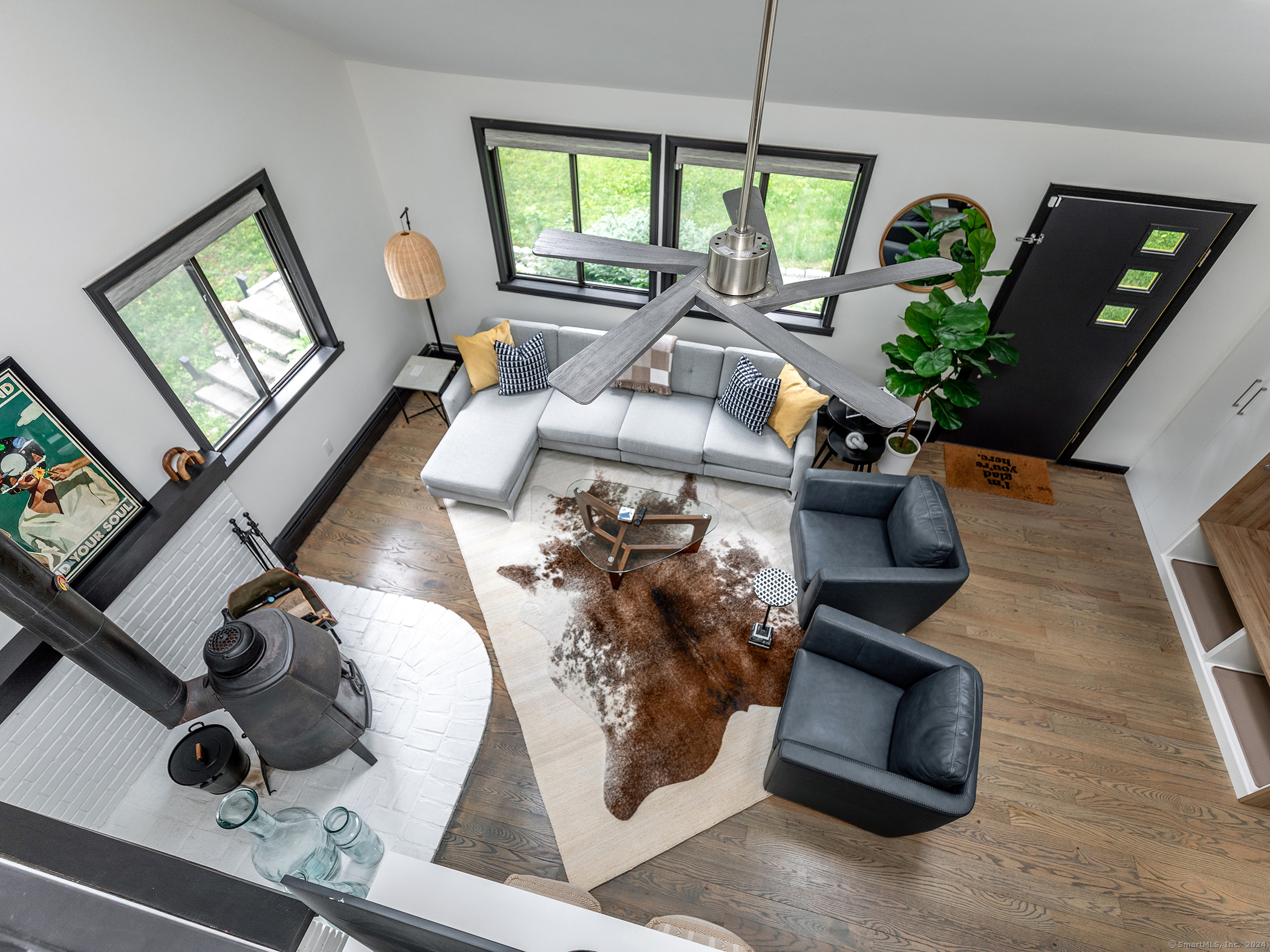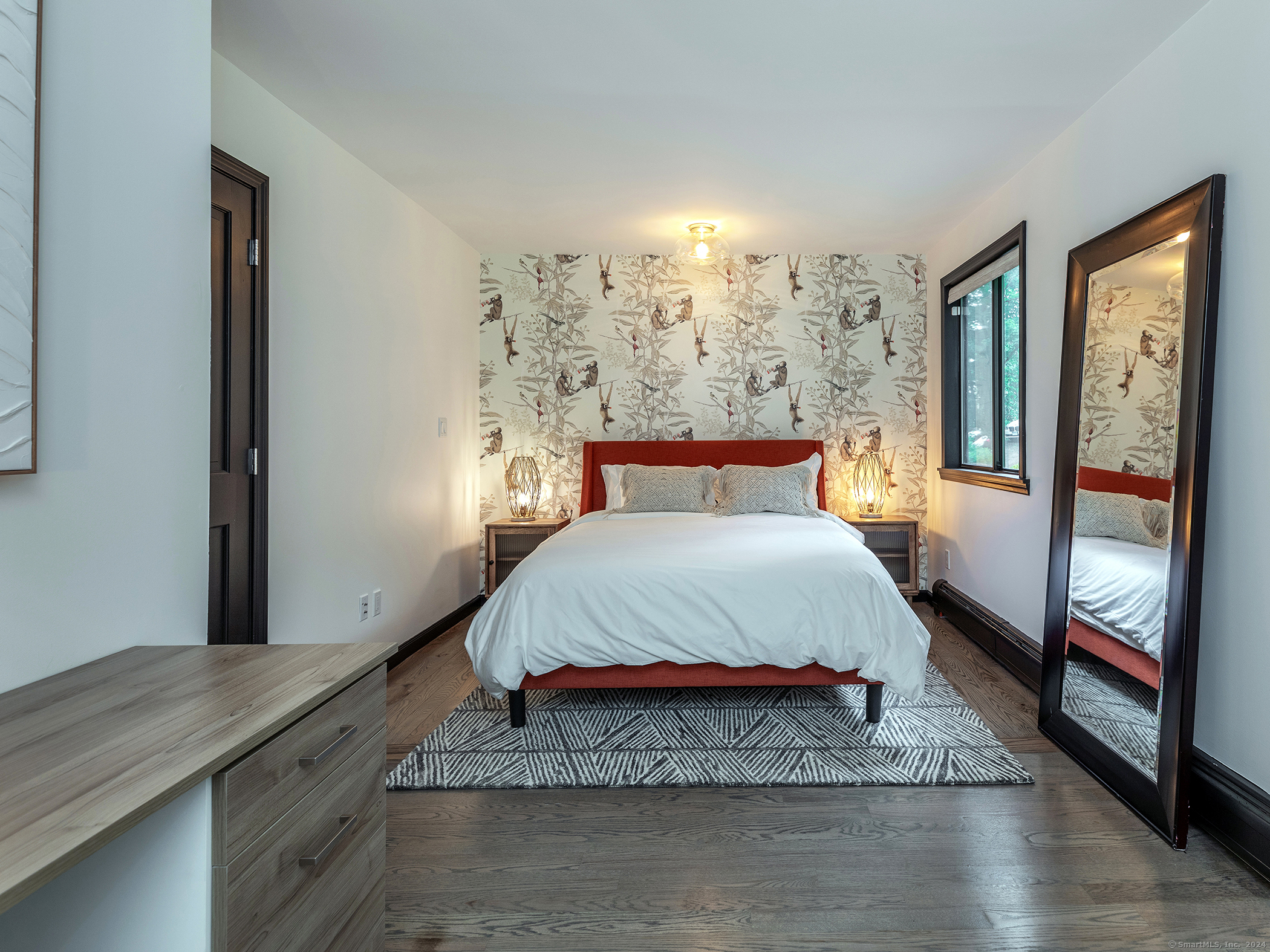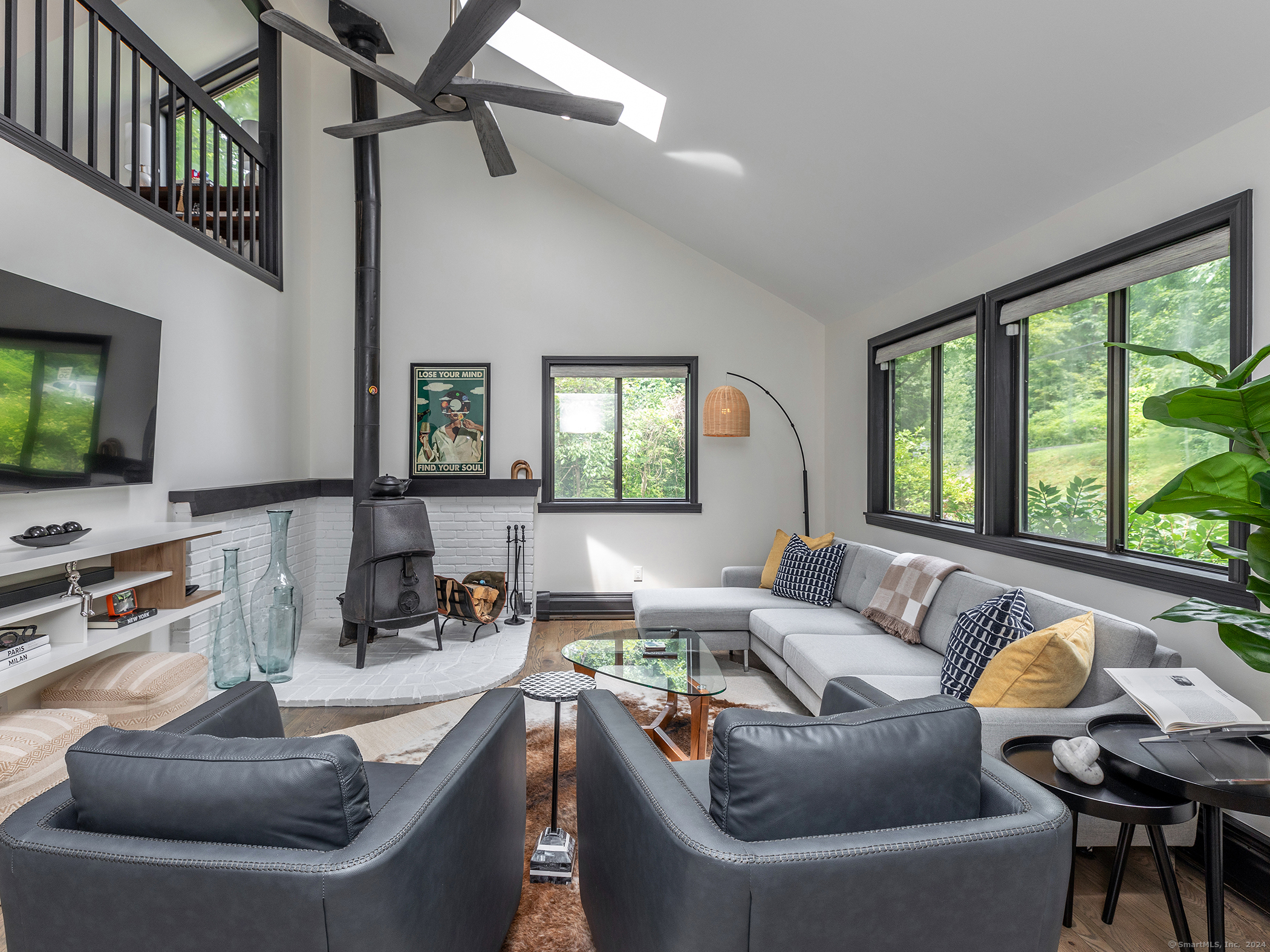 Stylish and well appointed 3 bedroom 2 and 1/2 bath contemporary cape surrounded by nature. Set back on a scenic road, this home offers bright and airy spaces including dramatic 16ft ceilings in the living room with wood burning stove. Large, modern kitchen with brand new island with seating and convenient access to outdoor deck for entertaining. Primary bedroom with ensuite 1/2 bath, additional guest room and full hallway bathroom on the main level. Well maintained hardwood floors. 2nd floor loft for relaxing or separate office space. Lower level can be used as a comfortable guest suite and has a bonus living space with kitchenette, media room with movie projector, bedroom and full bath. Separate private entrance and walk out to spacious backyard with firepit. Close to Kent, New Preston and Washington for shopping and dining. Good proximity to hiking trails. 90 min to NYC. Furnishings available.