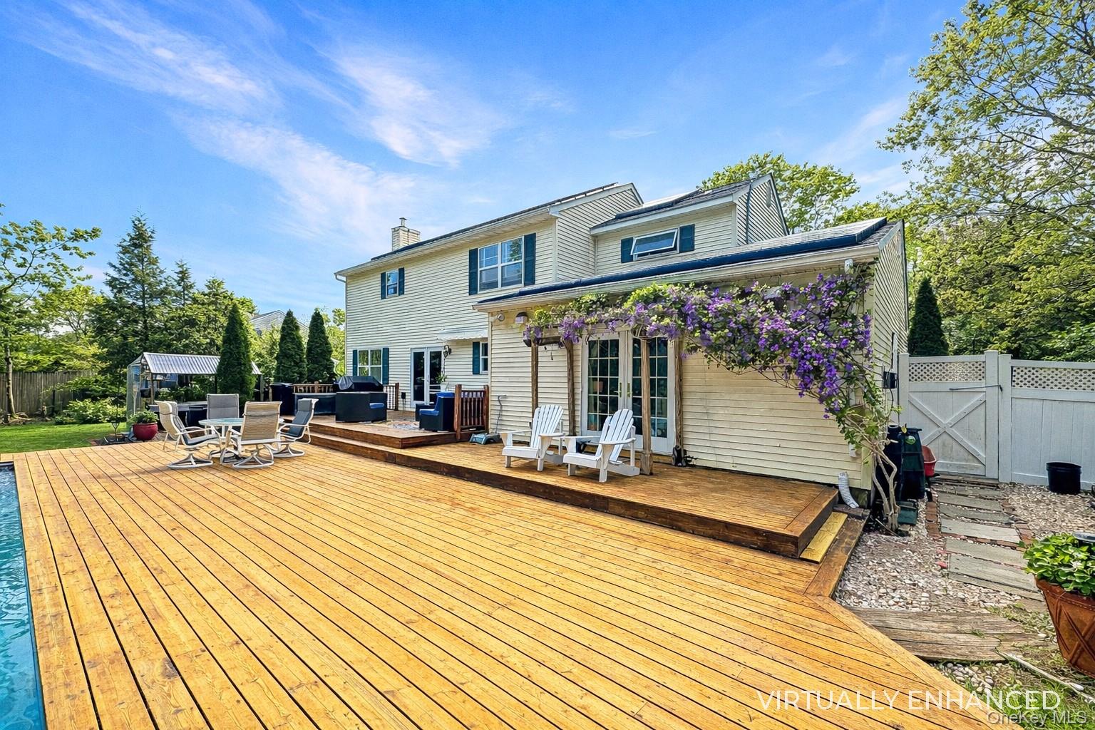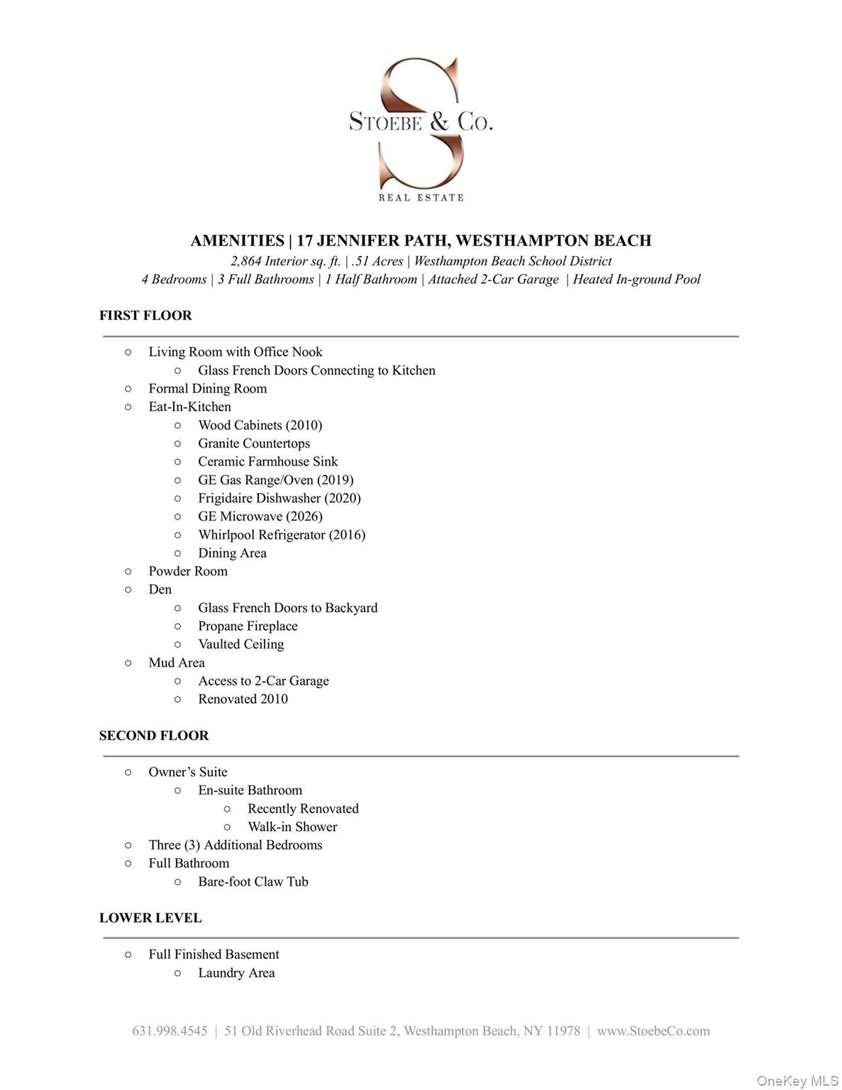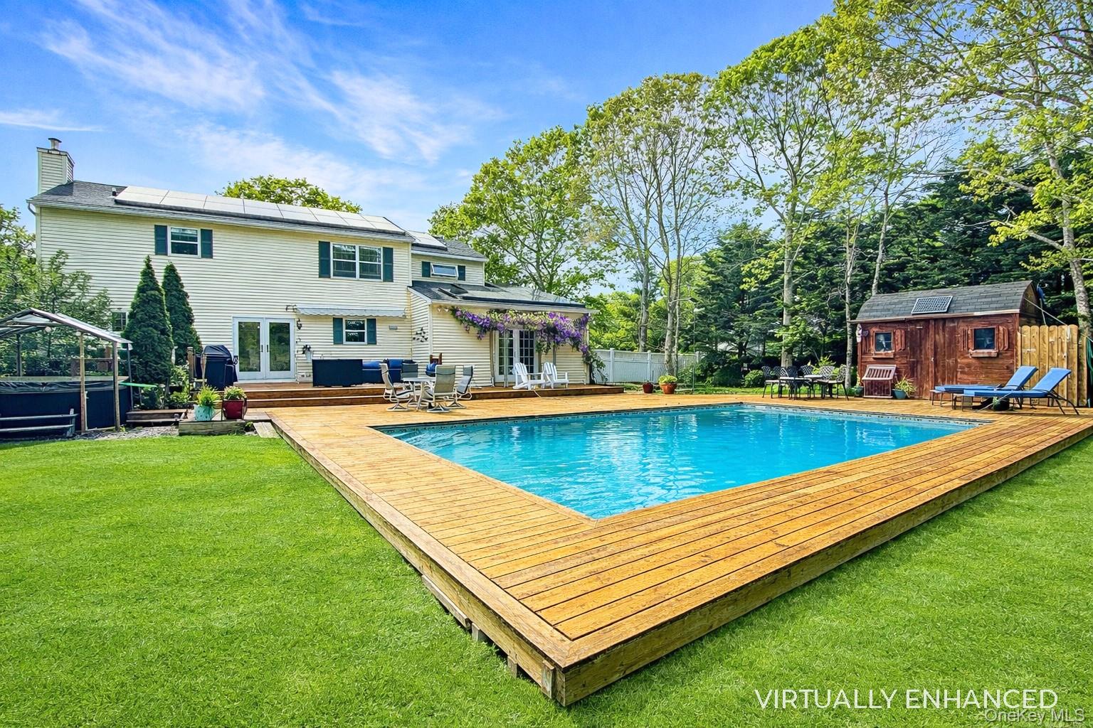 Tucked away at the end of a peaceful cul-de-sac on Jennifer Path, this maintained home on a half-acre lot offers the perfect opportunity to plant roots in Westhampton Beach. The inviting rocking-chair front porch sets the tone for the interior space within. The main level is defined by its classic layout and warm hardwood flooring. This floor features a dedicated living room with a gas fireplace, a formal dining room perfect for hosting your guests, and a convenient half bath. The kitchen includes a casual eat-in area adjacent to a dining space with glass french doors, while the den serves as a spacious retreat with its soaring vaulted ceiling, second gas fireplace, and second set of glass French doors leading to the backyard deck. A convenient mudroom area also provides seamless interior access to the two-car garage. The second level is home to all four bedrooms, including a vaulted ceiling master suite with a recently updated private bath and an additional full hallway bathroom. For added versatility, the partially finished lower level includes its own outside entrance, third full bathroom, and a dedicated laundry area. Outside, the half-acre property transforms into a private sanctuary. Enjoy an expansive cedar deck with a new awning, relaxing hot tub, storage shed, and a sparkling heated in-ground pool featuring a brand-new 2025 heater. With a new roof and solar panels installed in 2020, this energy-efficient home is ideally situated in the Westhampton Beach School District, just six minutes from the LIRR and moments from the Westhampton Beach Village Main Street, boutiques, farm stands, and world-class beaches that define the area. Residents enjoy low taxes ($6, 037. 56) and access to Southampton Town beaches, with the additional exclusive option to buy into the Westhampton Beach Village beaches. Whether you are seeking a summer getaway, an investment opportunity, or a year-round residence, 17 Jennifer Path is your invitation to secure your place in the Hamptons. *Home being sold as is. *