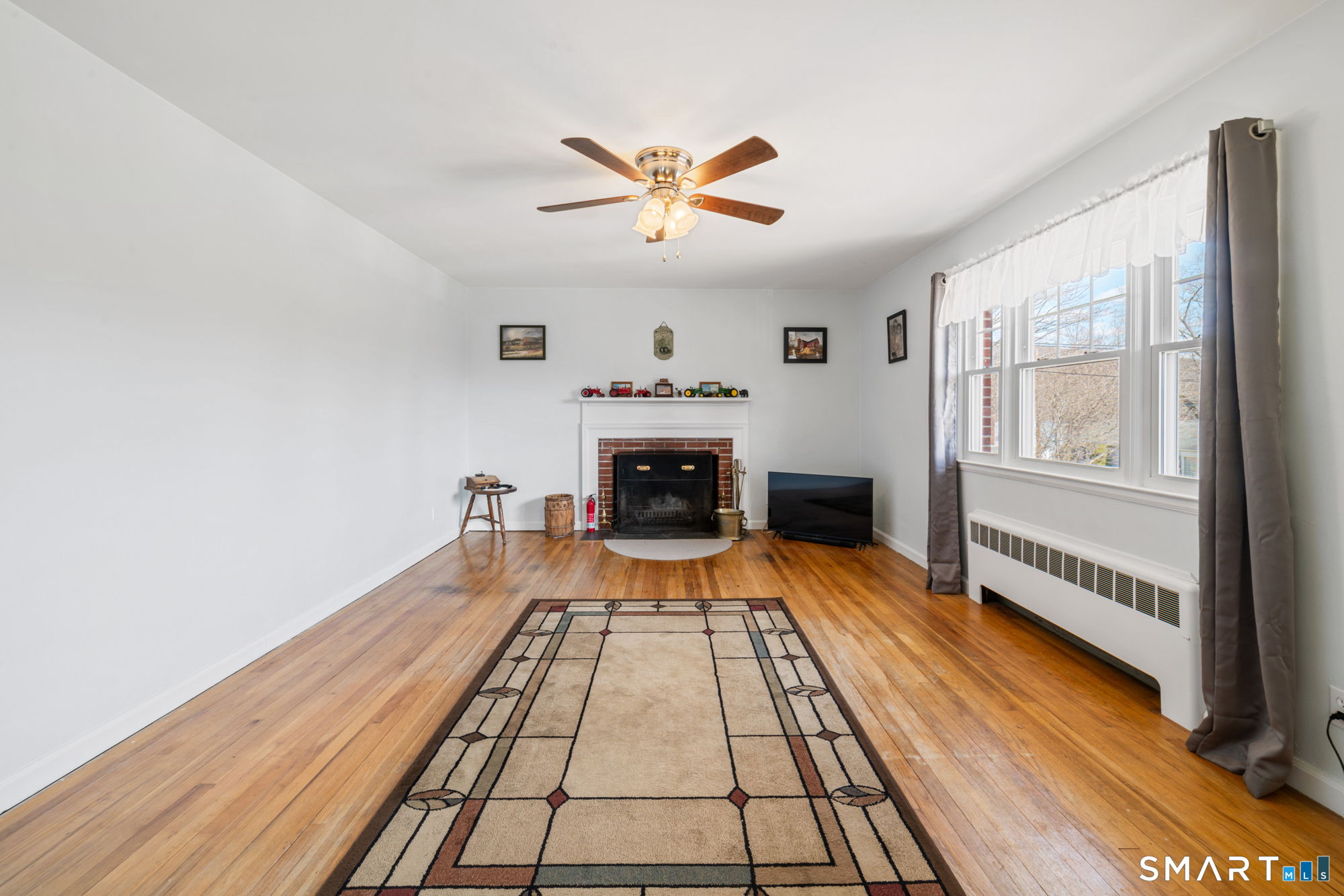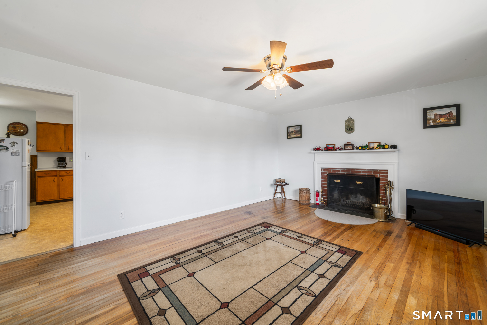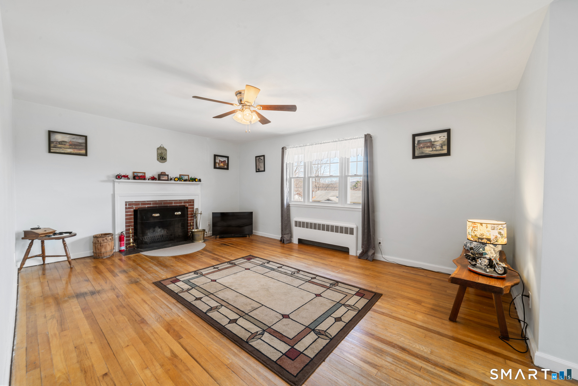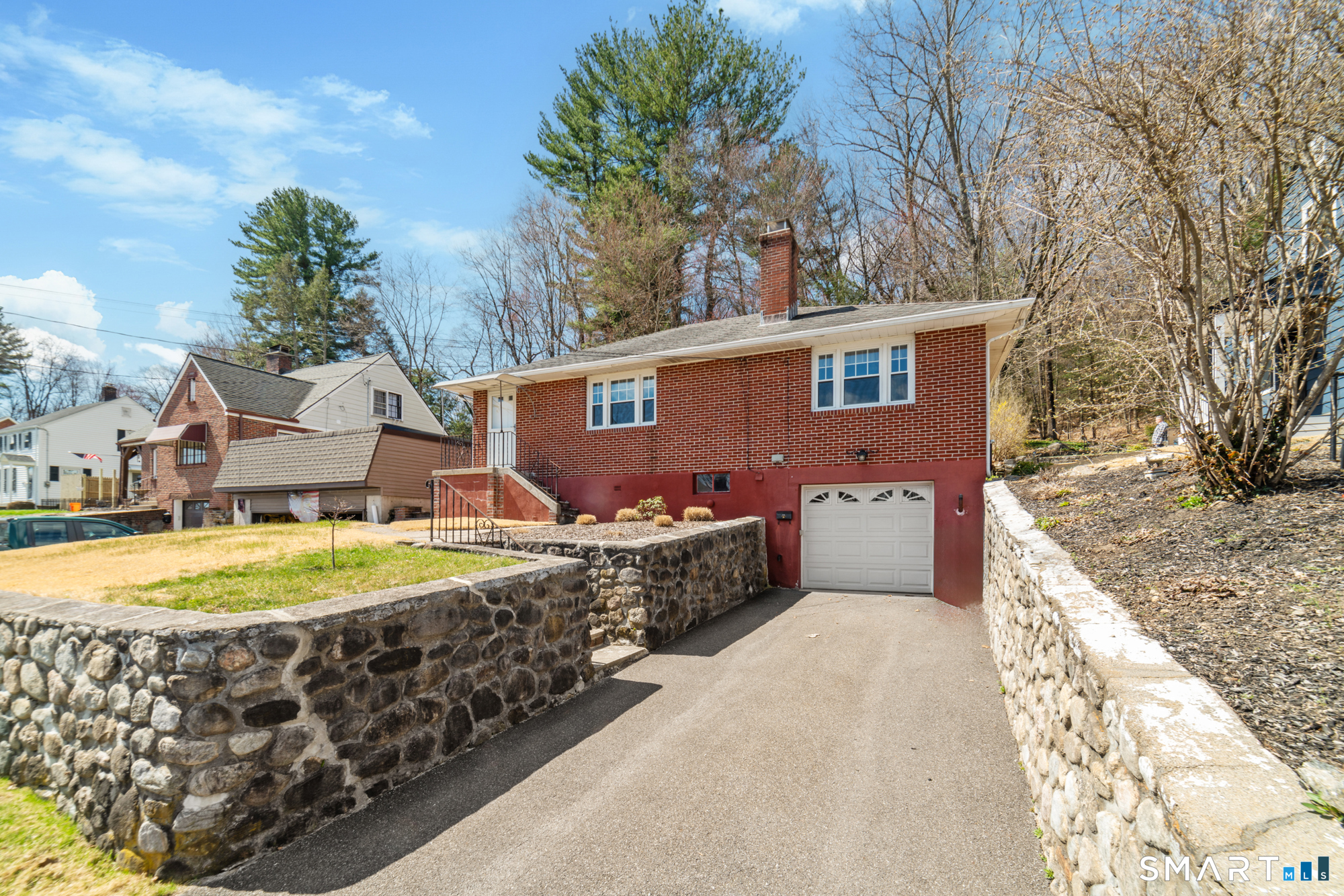 Welcome home to this charming brick ranch, where classic character meets thoughtful updates and flexible living space. Set behind a timeless stone wall that beautifully borders the front yard and driveway, this home offers inviting curb appeal and a sense of privacy from the moment you arrive. A one-car garage tucked beneath the home adds both convenience and functionality, especially during New England's changing seasons. Step inside through the tiled front entryway, a practical and welcoming space that transitions seamlessly into the heart of the home. The sun-filled living room features gleaming hardwood floors, a cozy fireplace perfect for relaxing evenings, and a large picture window that floods the space with natural light. A ceiling fan enhances comfort year-round, creating an ideal setting for both everyday living and entertaining. The home offers two well-proportioned bedrooms, each complete with hardwood flooring and ceiling fans, providing comfort, style, and continuity throughout the main level. The eat-in kitchen boasts an open floor plan, allowing for easy flow and connection between cooking, dining, and gathering spaces-perfect for today's lifestyle. Downstairs, the finished basement expands your living area with a versatile recreation room, featuring wall-to-wall carpeting, baseboard heat, and a brand-new dropped ceiling. Whether used as a media room, home office, or play space, this level offers endless possibilities. Additional highlights include a cedar closet for storage and a root cellar, adding both charm and practicality. Recent updates provide peace of mind and added value, including Harvey replacement windows, new exterior doors, and a newer water heater. Blending solid construction, modern improvements, and inviting spaces both inside and out, this well-maintained ranch is ready to welcome its next owner.
