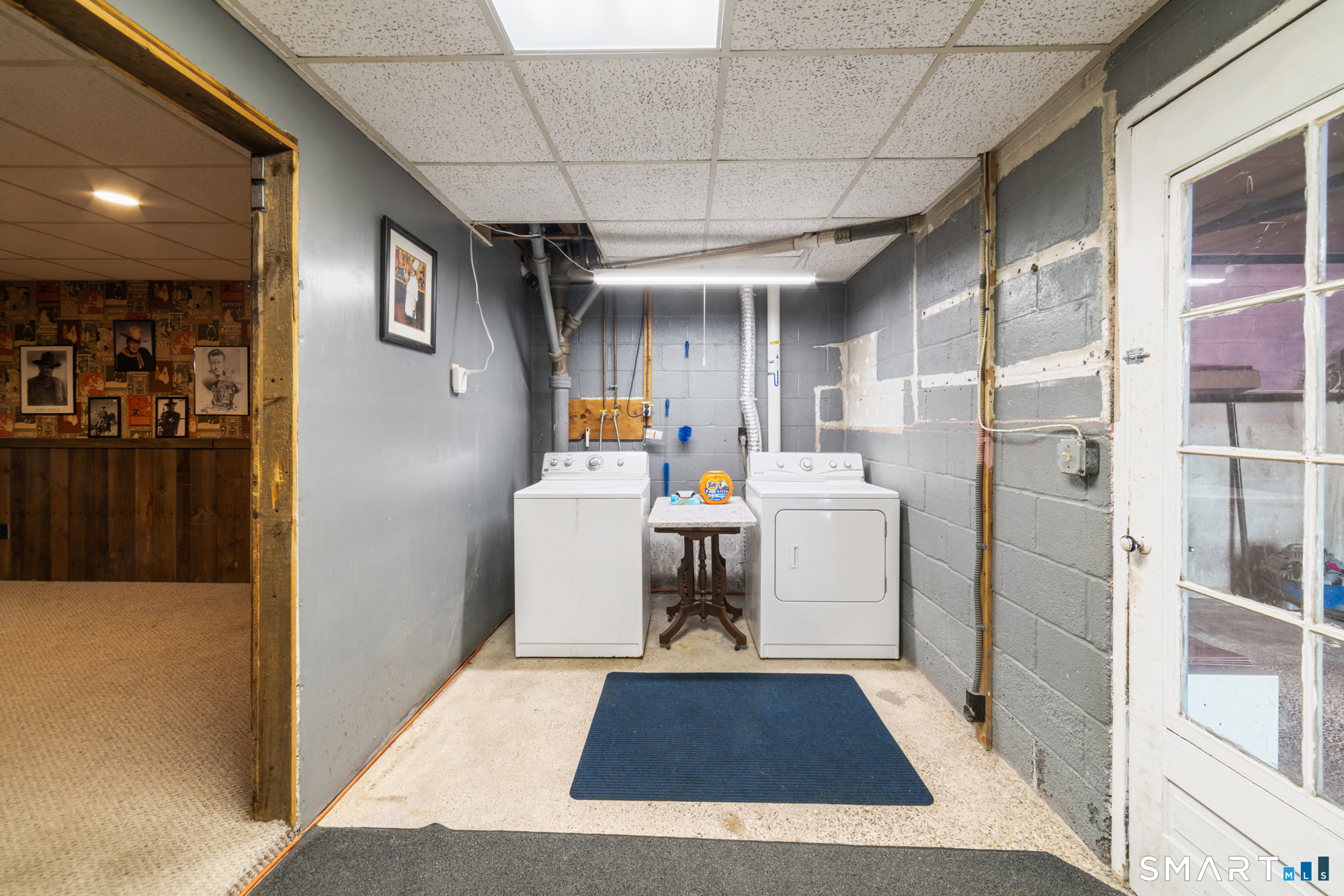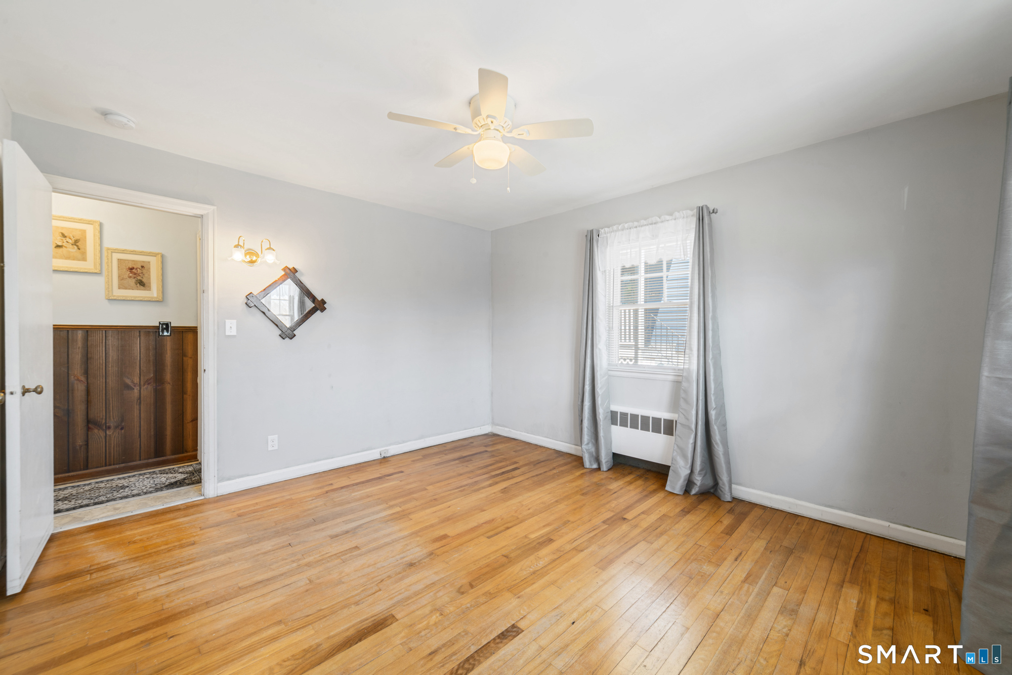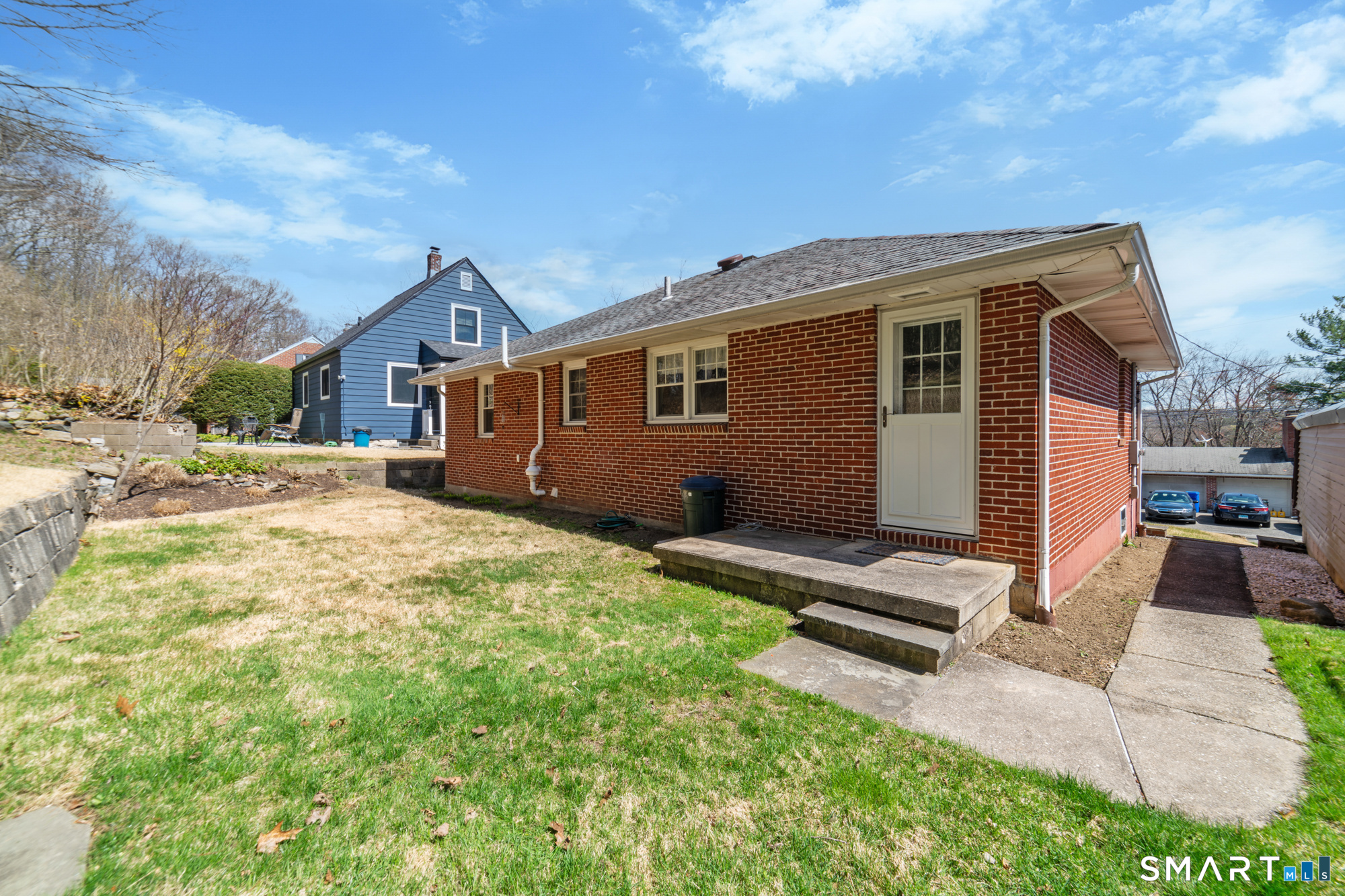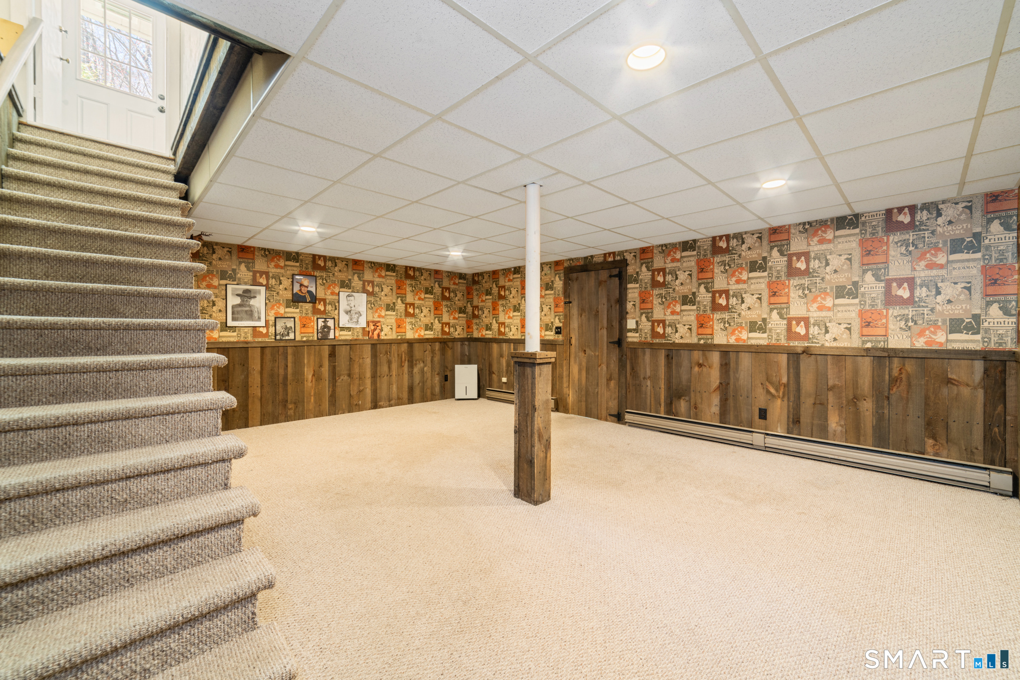 Welcome home to this charming brick ranch, where classic character meets thoughtful updates and flexible living space. Set behind a timeless stone wall that beautifully borders the front yard and driveway, this home offers inviting curb appeal and a sense of privacy from the moment you arrive. A one-car garage tucked beneath the home adds both convenience and functionality, especially during New England's changing seasons. Step inside through the tiled front entryway, a practical and welcoming space that transitions seamlessly into the heart of the home. The sun-filled living room features gleaming hardwood floors, a cozy fireplace perfect for relaxing evenings, and a large picture window that floods the space with natural light. A ceiling fan enhances comfort year-round, creating an ideal setting for both everyday living and entertaining. The home offers two well-proportioned bedrooms, each complete with hardwood flooring and ceiling fans, providing comfort, style, and continuity throughout the main level. The eat-in kitchen boasts an open floor plan, allowing for easy flow and connection between cooking, dining, and gathering spaces-perfect for today's lifestyle. Downstairs, the finished basement expands your living area with a versatile recreation room, featuring wall-to-wall carpeting, baseboard heat, and a brand-new dropped ceiling. Whether used as a media room, home office, or play space, this level offers endless possibilities. Additional highlights include a cedar closet for storage and a root cellar, adding both charm and practicality. Recent updates provide peace of mind and added value, including Harvey replacement windows, new exterior doors, and a newer water heater. Blending solid construction, modern improvements, and inviting spaces both inside and out, this well-maintained ranch is ready to welcome its next owner.