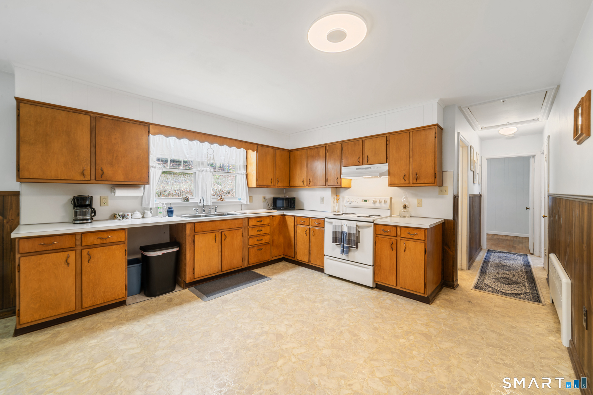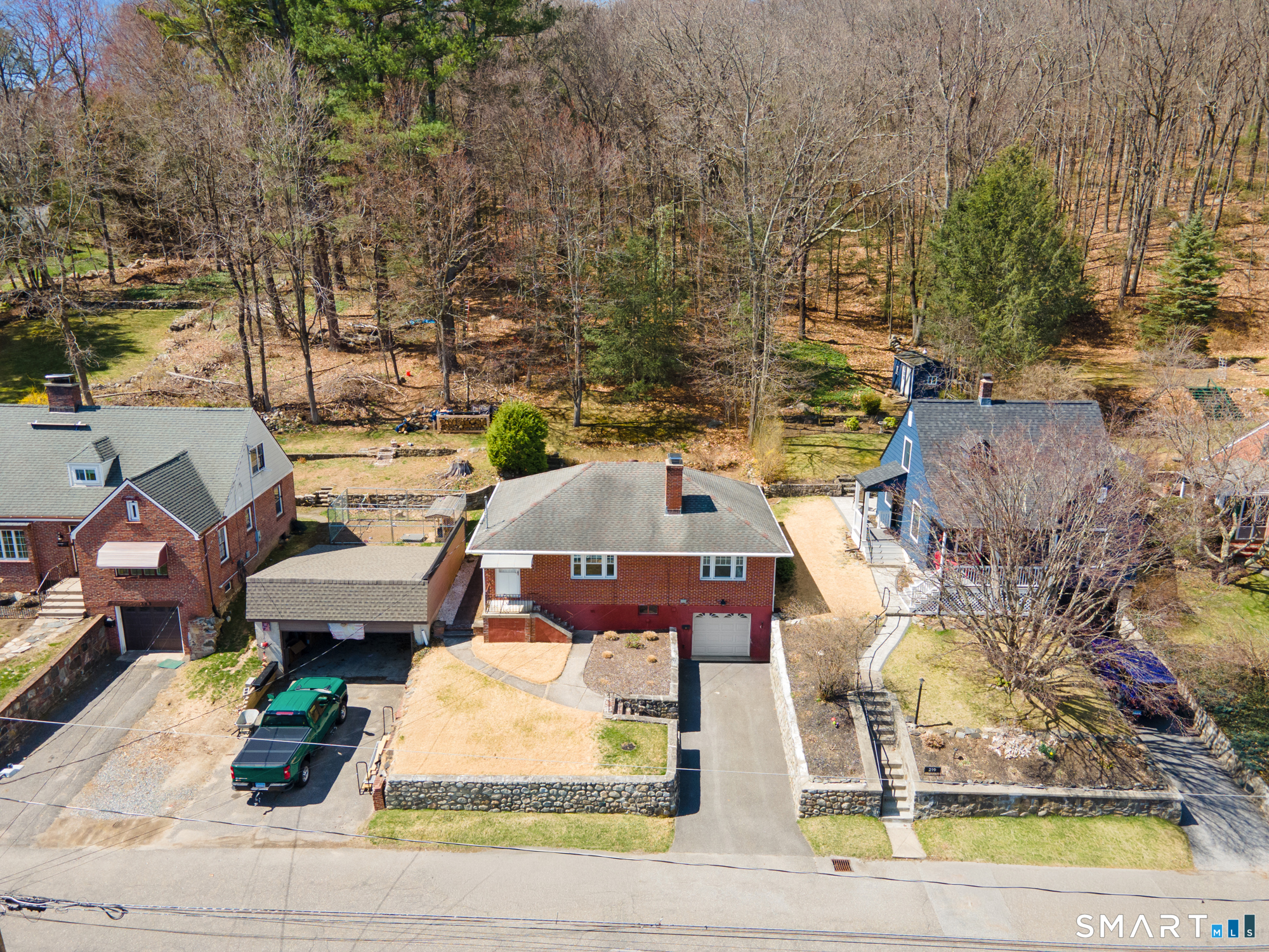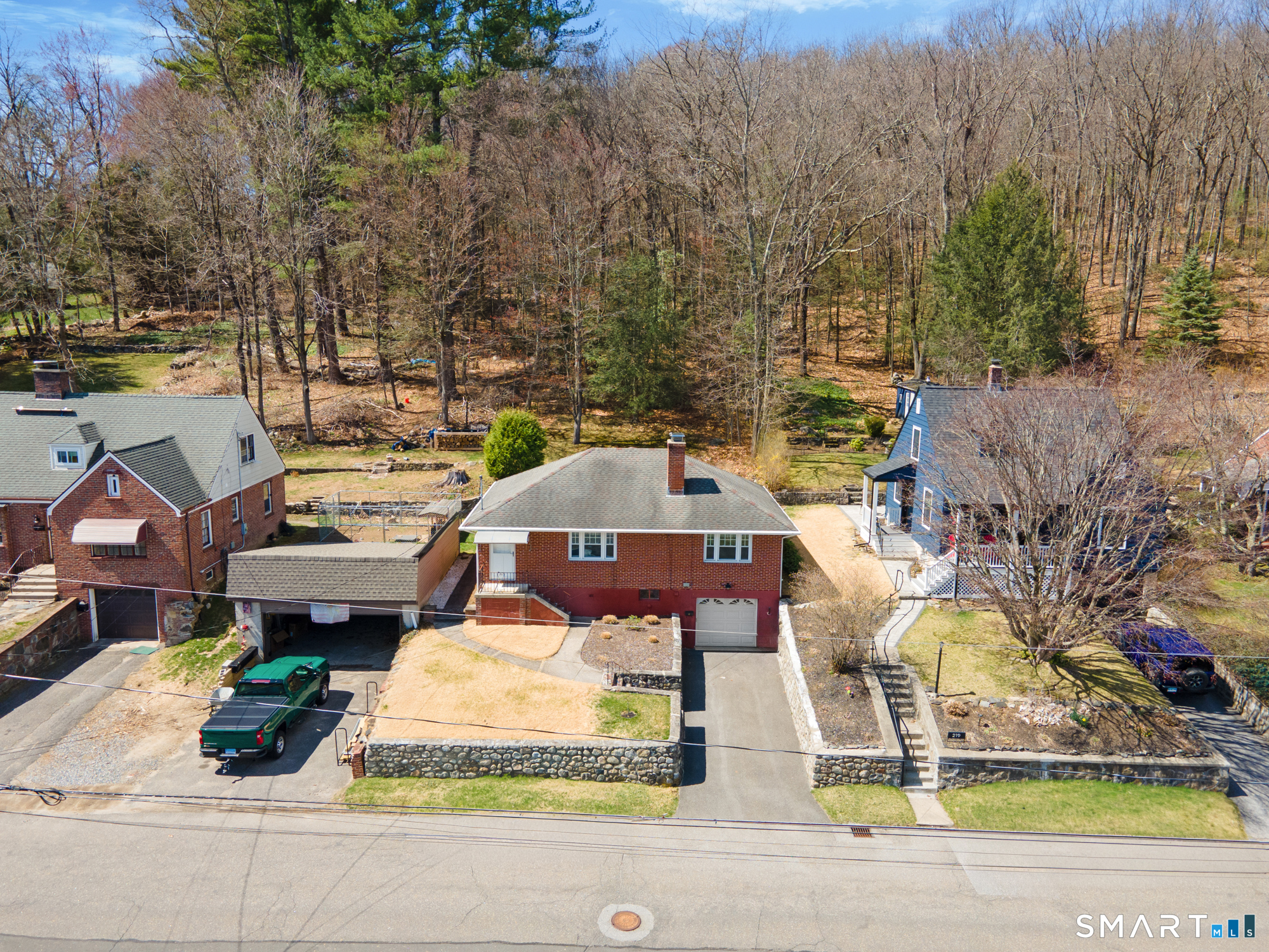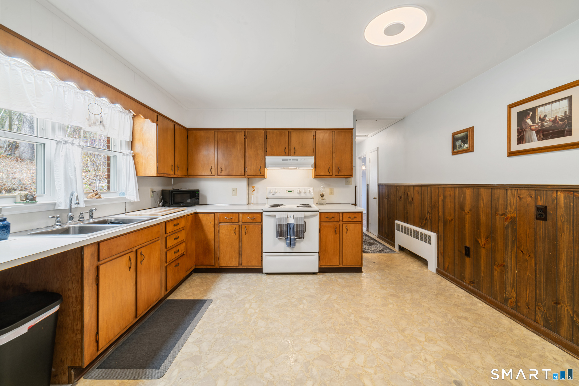 Welcome home to this charming brick ranch, where classic character meets thoughtful updates and flexible living space. Set behind a timeless stone wall that beautifully borders the front yard and driveway, this home offers inviting curb appeal and a sense of privacy from the moment you arrive. A one-car garage tucked beneath the home adds both convenience and functionality, especially during New England's changing seasons. Step inside through the tiled front entryway, a practical and welcoming space that transitions seamlessly into the heart of the home. The sun-filled living room features gleaming hardwood floors, a cozy fireplace perfect for relaxing evenings, and a large picture window that floods the space with natural light. A ceiling fan enhances comfort year-round, creating an ideal setting for both everyday living and entertaining. The home offers two well-proportioned bedrooms, each complete with hardwood flooring and ceiling fans, providing comfort, style, and continuity throughout the main level. The eat-in kitchen boasts an open floor plan, allowing for easy flow and connection between cooking, dining, and gathering spaces-perfect for today's lifestyle. Downstairs, the finished basement expands your living area with a versatile recreation room, featuring wall-to-wall carpeting, baseboard heat, and a brand-new dropped ceiling. Whether used as a media room, home office, or play space, this level offers endless possibilities. Additional highlights include a cedar closet for storage and a root cellar, adding both charm and practicality. Recent updates provide peace of mind and added value, including Harvey replacement windows, new exterior doors, and a newer water heater. Blending solid construction, modern improvements, and inviting spaces both inside and out, this well-maintained ranch is ready to welcome its next owner.