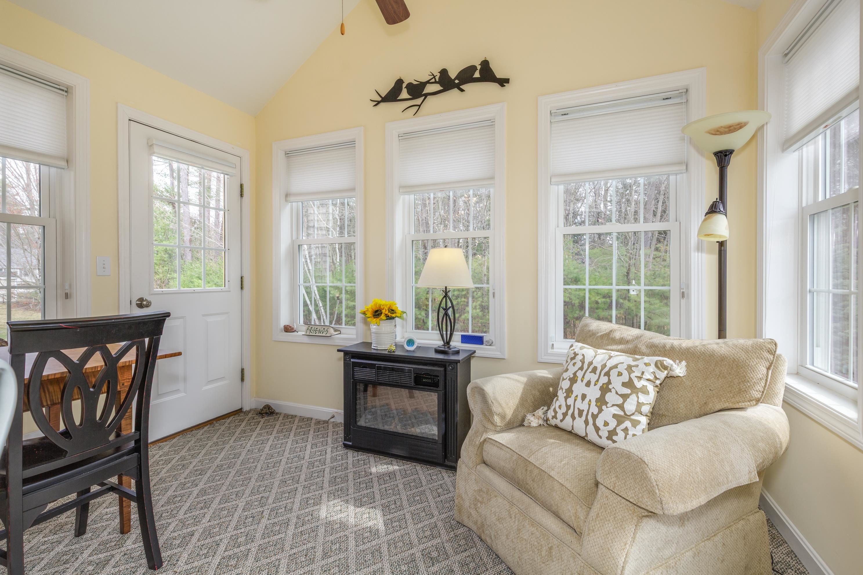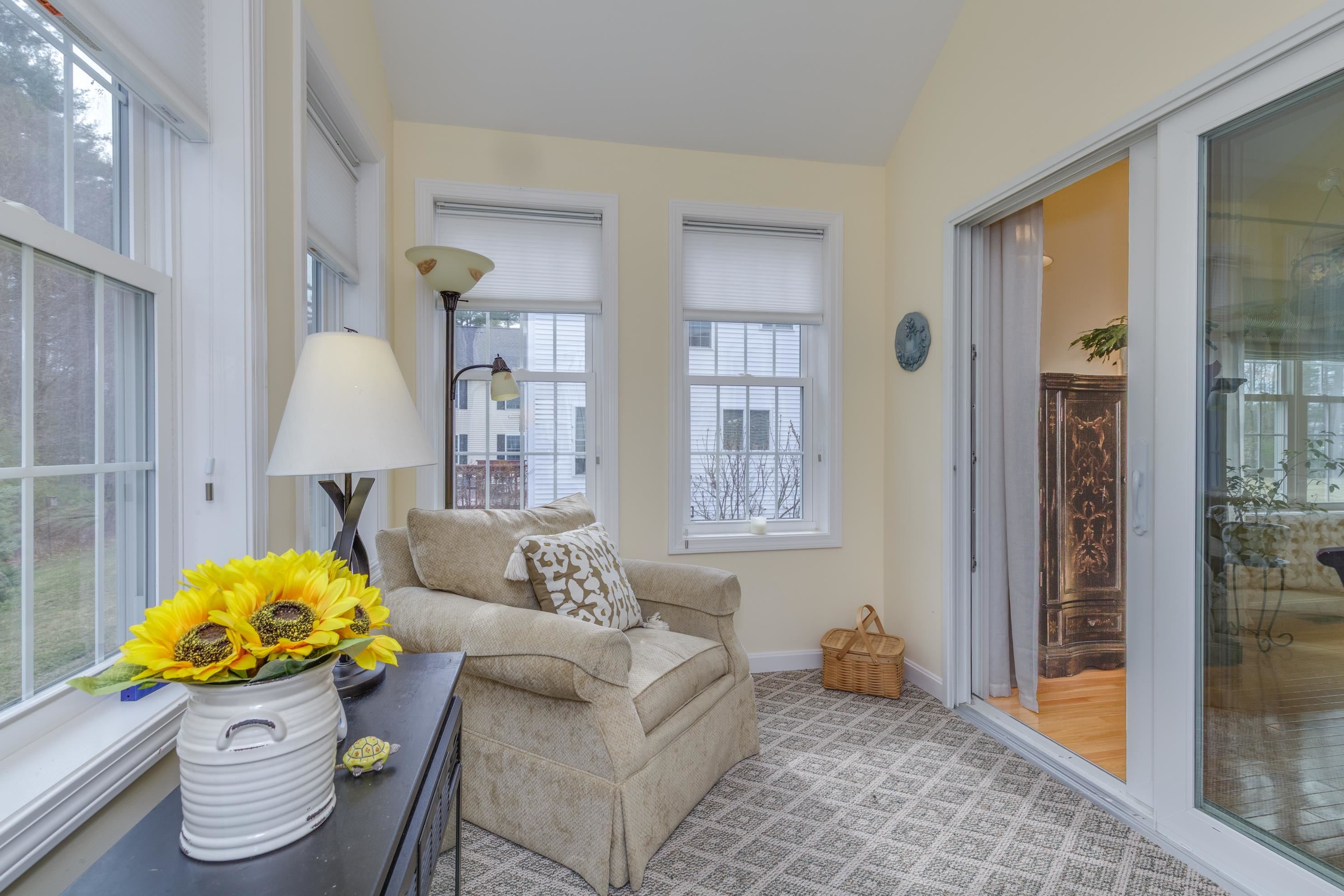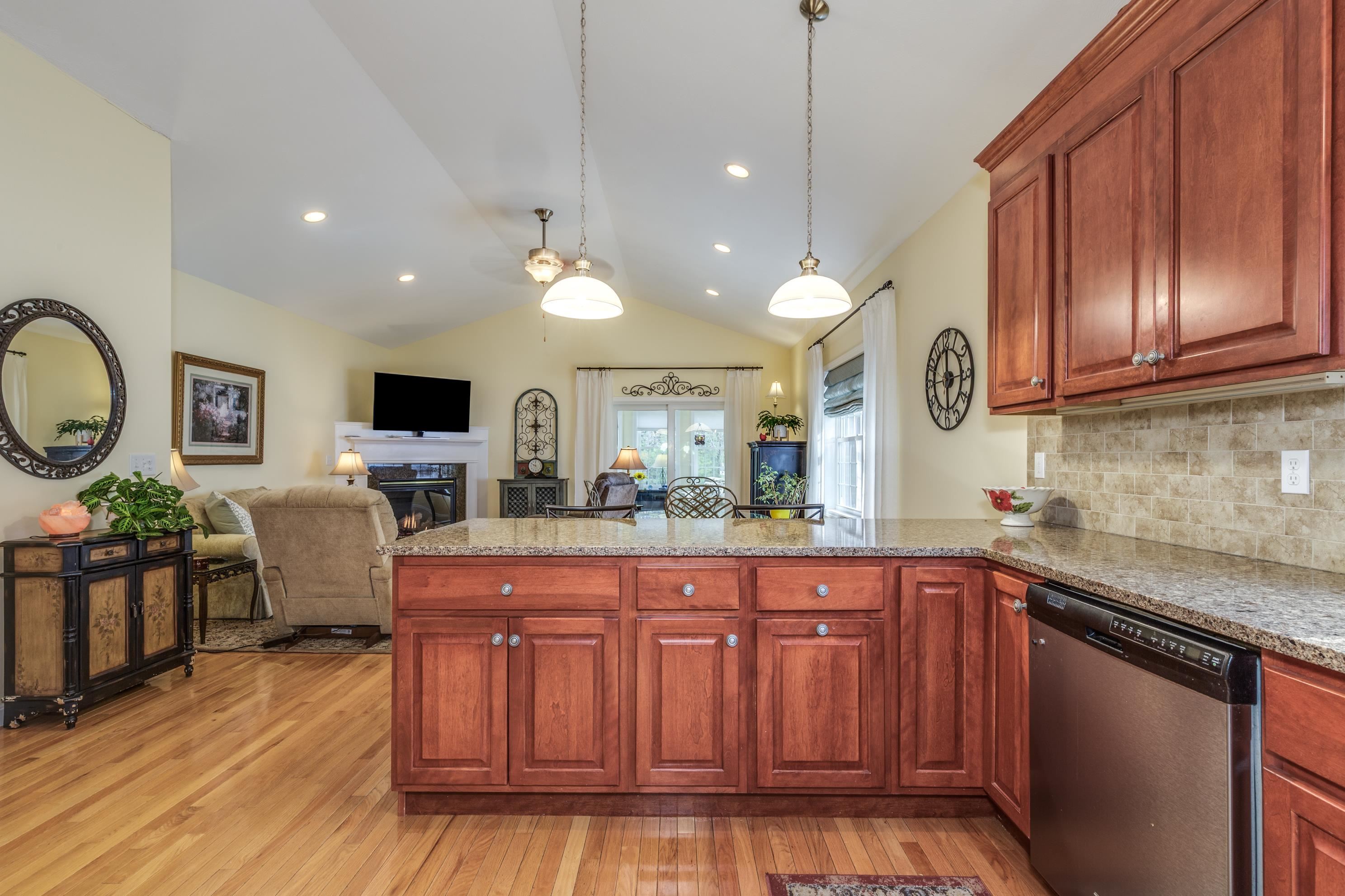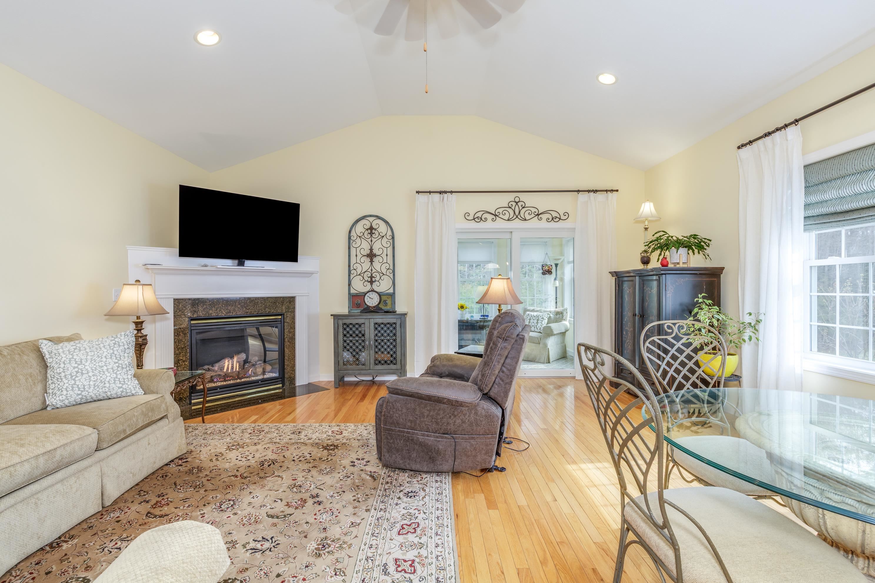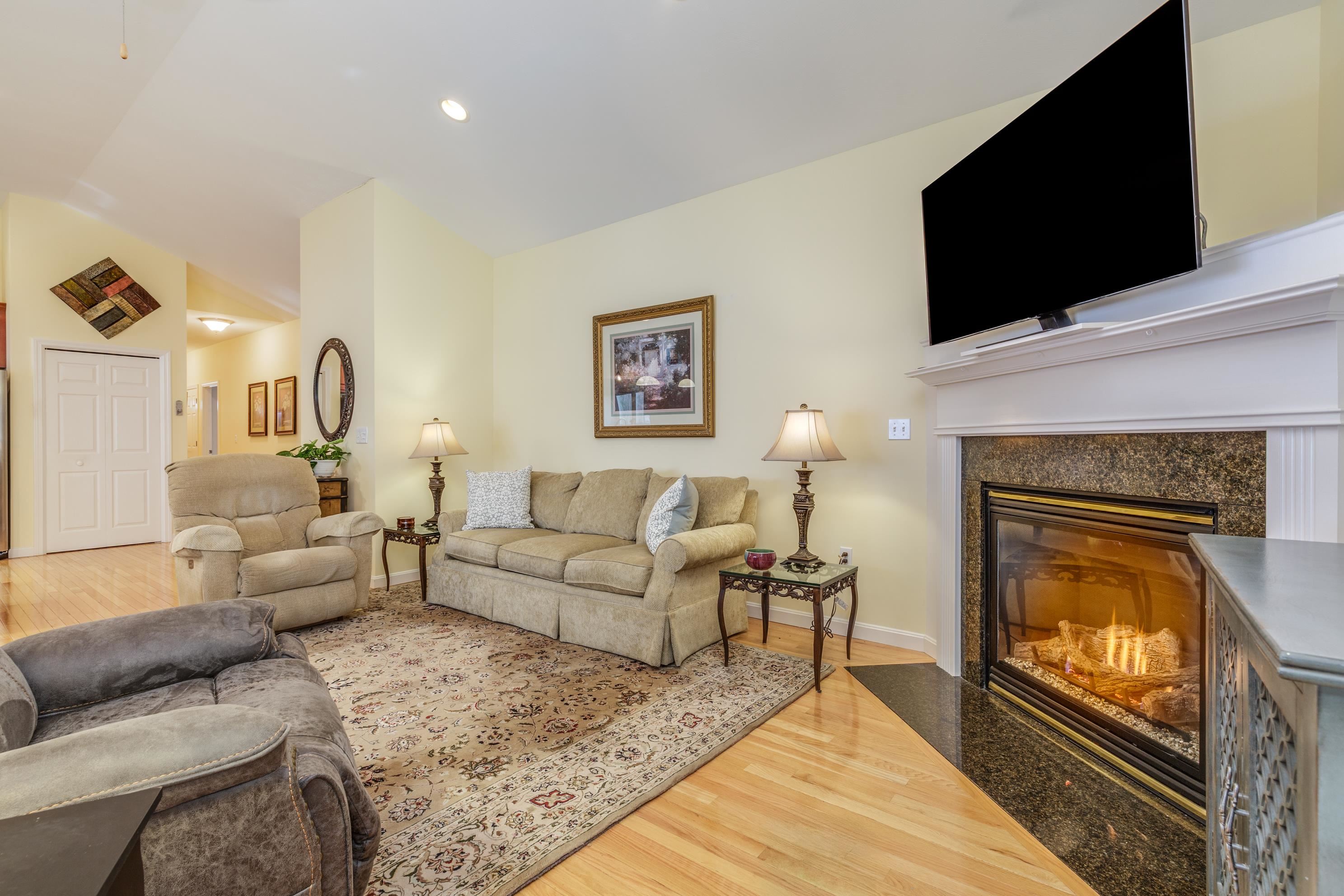 A perfect home to enjoy without the maintenance! Impeccably maintained and offering easy one level living with all the bells and whistles. From the soaring ceilings to the gorgeous custom kitchen featuring rich cinnamon colored cabinetry, granite counters, stainless steel appliances, and a spacious walk in pantry, every detail has been thoughtfully designed. Beautiful hardwood floors, a cozy gas fireplace, central AC, crown molding, and transom windows throughout provide warmth and abundant natural light. The primary suite offers the convenience of first floor laundry, while custom drapery and a whole-house generator add comfort and peace of mind. Relax year round in the inviting four season sunroom that opens to a large patio and fenced yard for privacy, accented by a row of flourishing lilacs. The finished lower level features a spacious family room with pool table, perfect for entertaining. Enjoy a low maintenance lifestyle with association maintained grounds, pleasant sidewalks, and nearby trails. Ideally located within walking distance to Beaver Meadow Golf Course and the Merrimack River for fishing. Efficient natural gas heat and city services complete this exceptional offering.