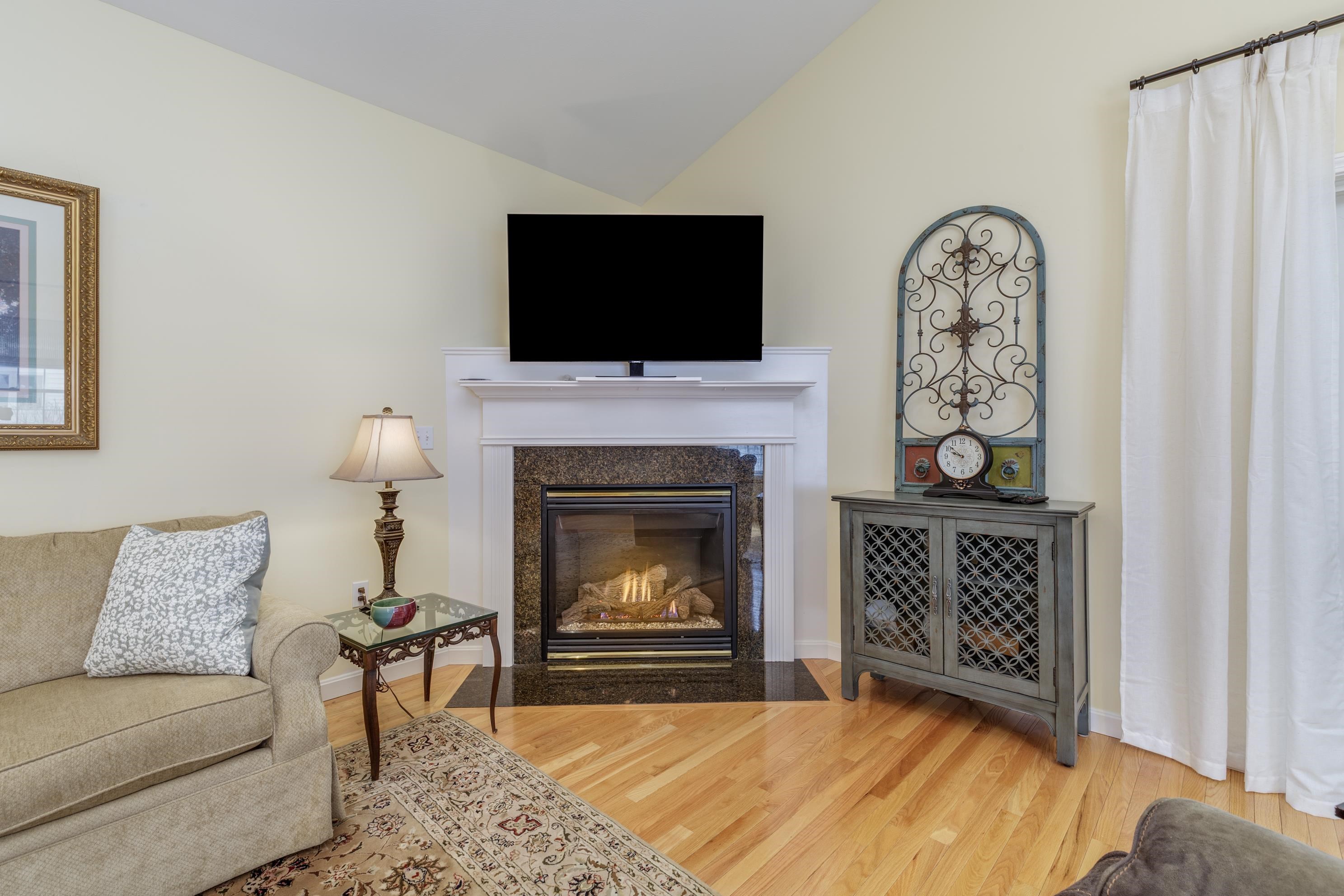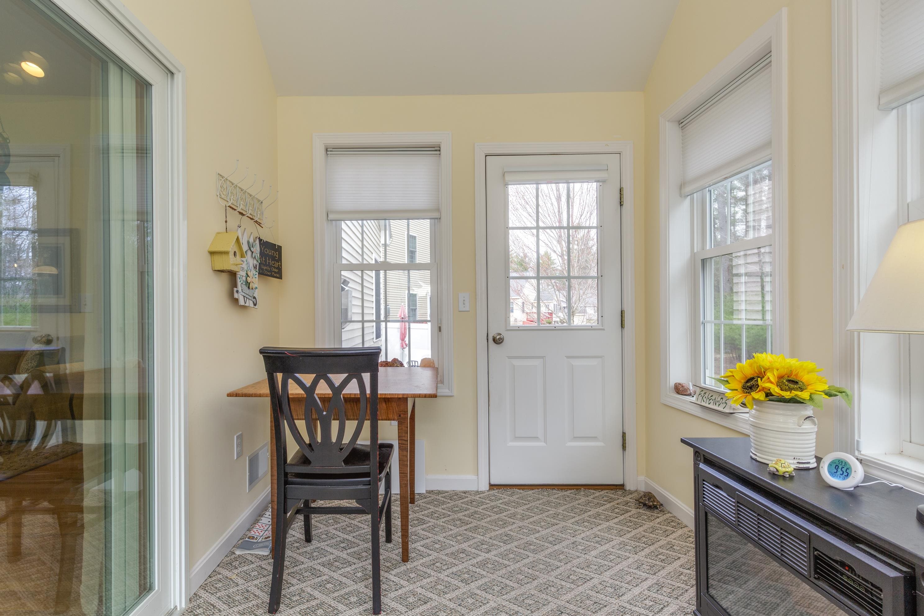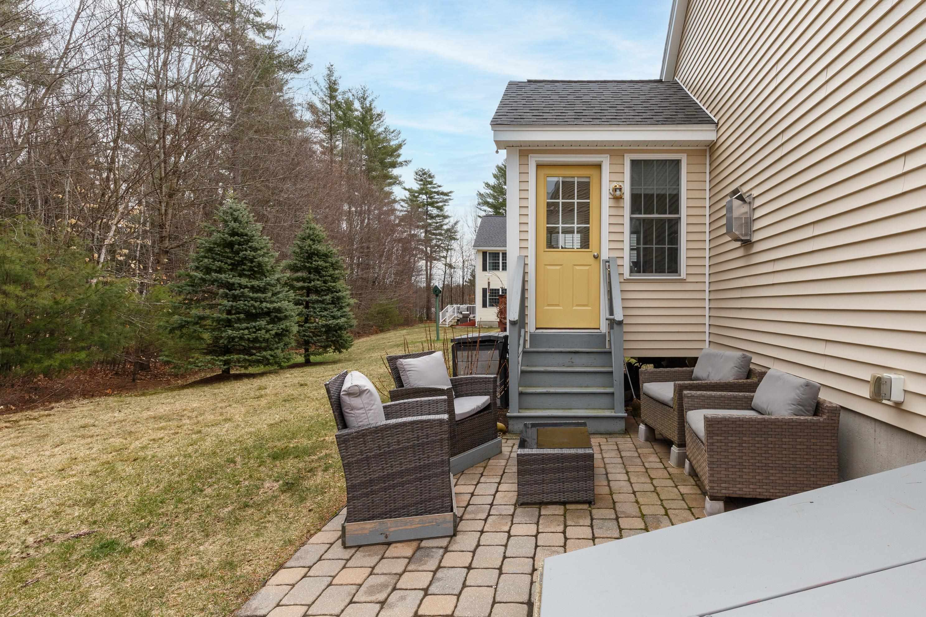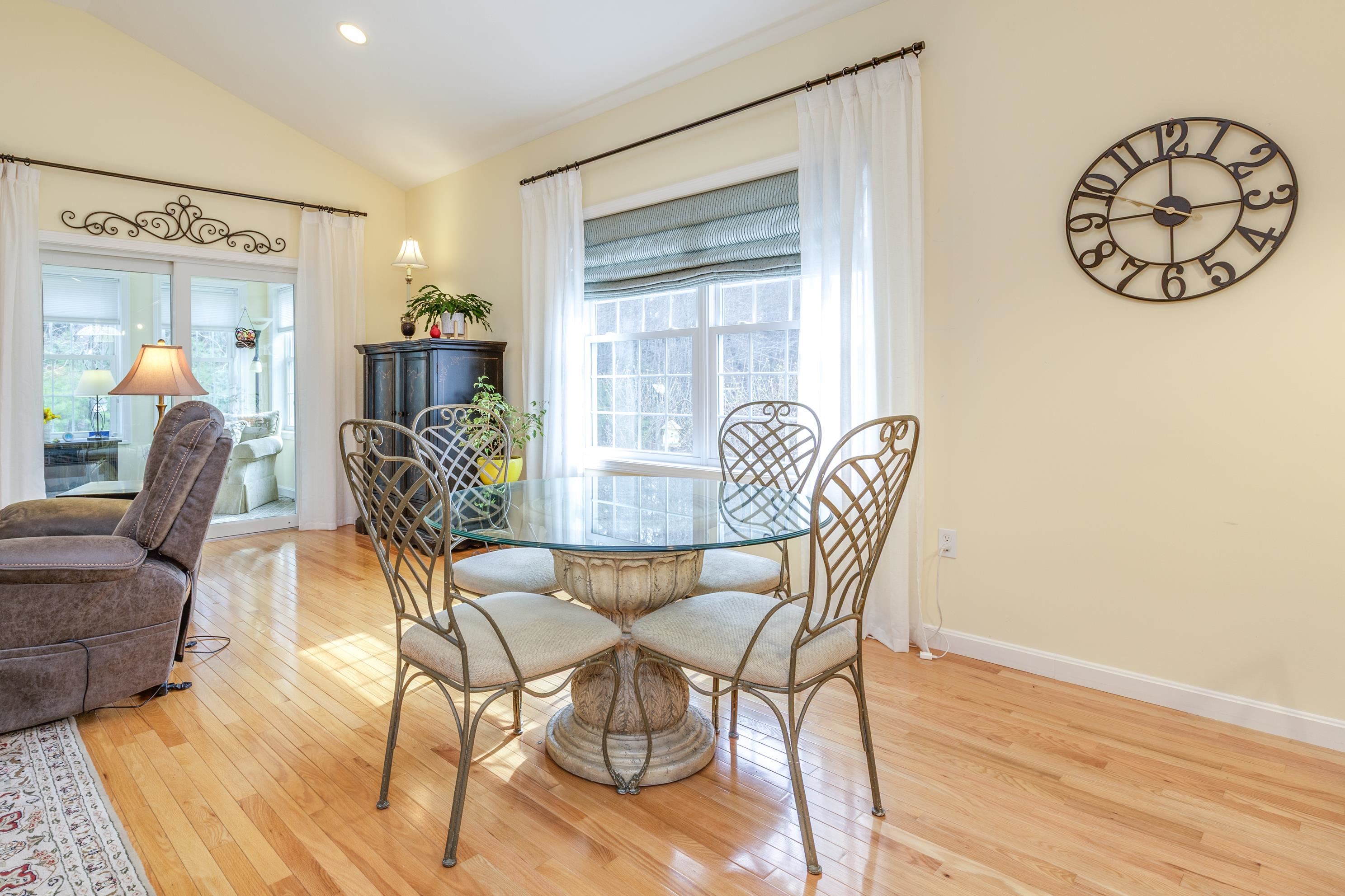 A perfect home to enjoy without the maintenance! Impeccably maintained and offering easy one level living with all the bells and whistles. From the soaring ceilings to the gorgeous custom kitchen featuring rich cinnamon colored cabinetry, granite counters, stainless steel appliances, and a spacious walk in pantry, every detail has been thoughtfully designed. Beautiful hardwood floors, a cozy gas fireplace, central AC, crown molding, and transom windows throughout provide warmth and abundant natural light. The primary suite offers the convenience of first floor laundry, while custom drapery and a whole-house generator add comfort and peace of mind. Relax year round in the inviting four season sunroom that opens to a large patio and fenced yard for privacy, accented by a row of flourishing lilacs. The finished lower level features a spacious family room with pool table, perfect for entertaining. Enjoy a low maintenance lifestyle with association maintained grounds, pleasant sidewalks, and nearby trails. Ideally located within walking distance to Beaver Meadow Golf Course and the Merrimack River for fishing. Efficient natural gas heat and city services complete this exceptional offering.