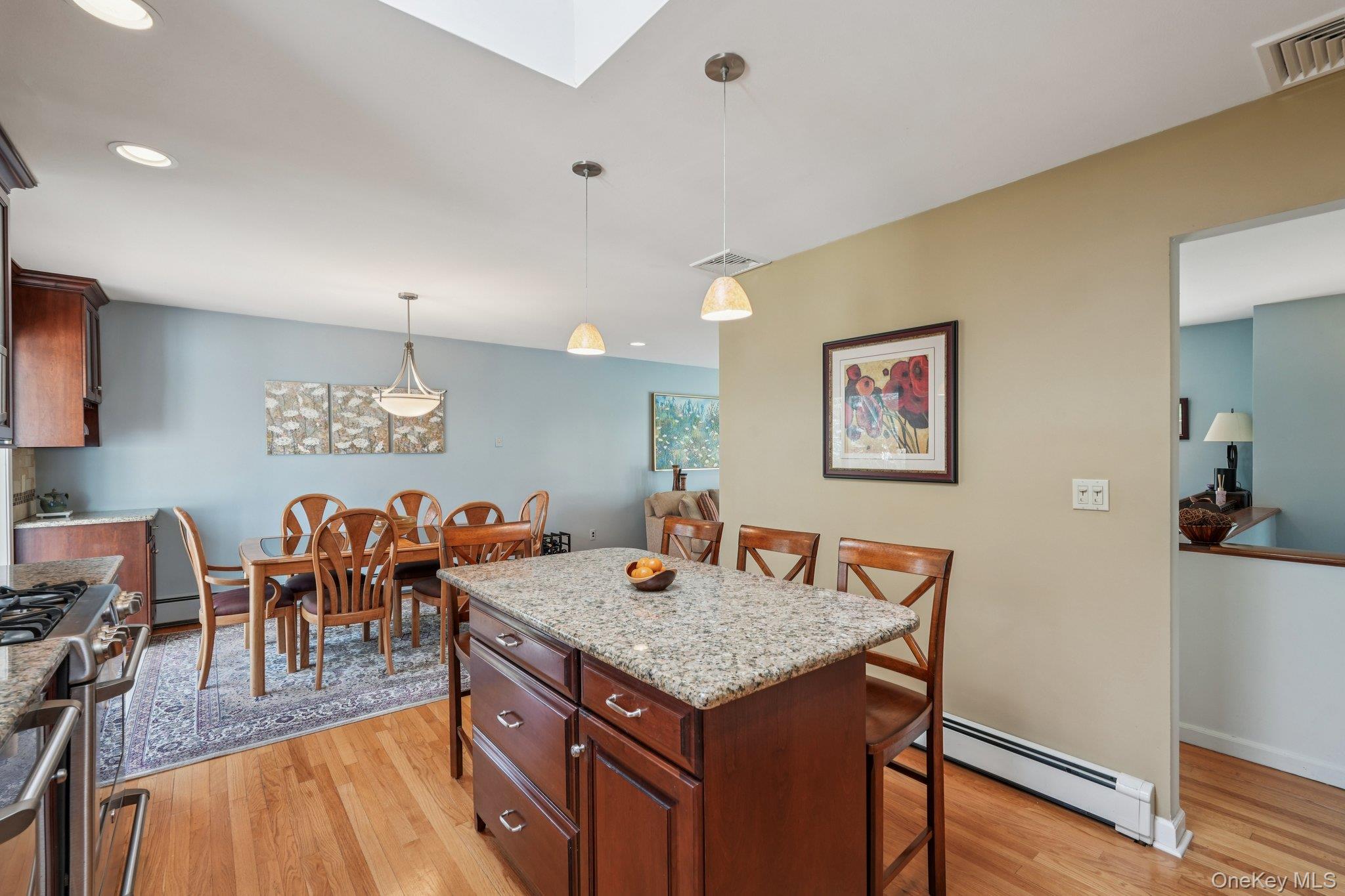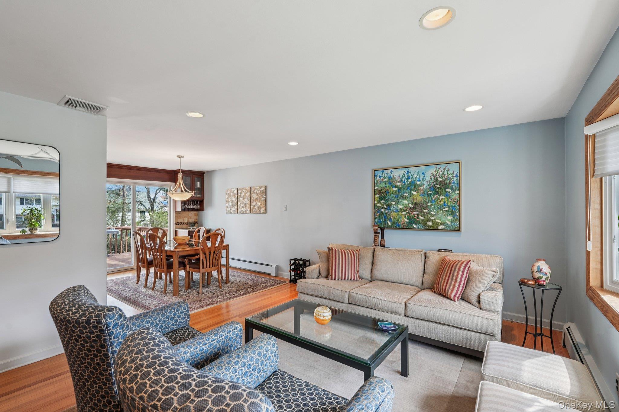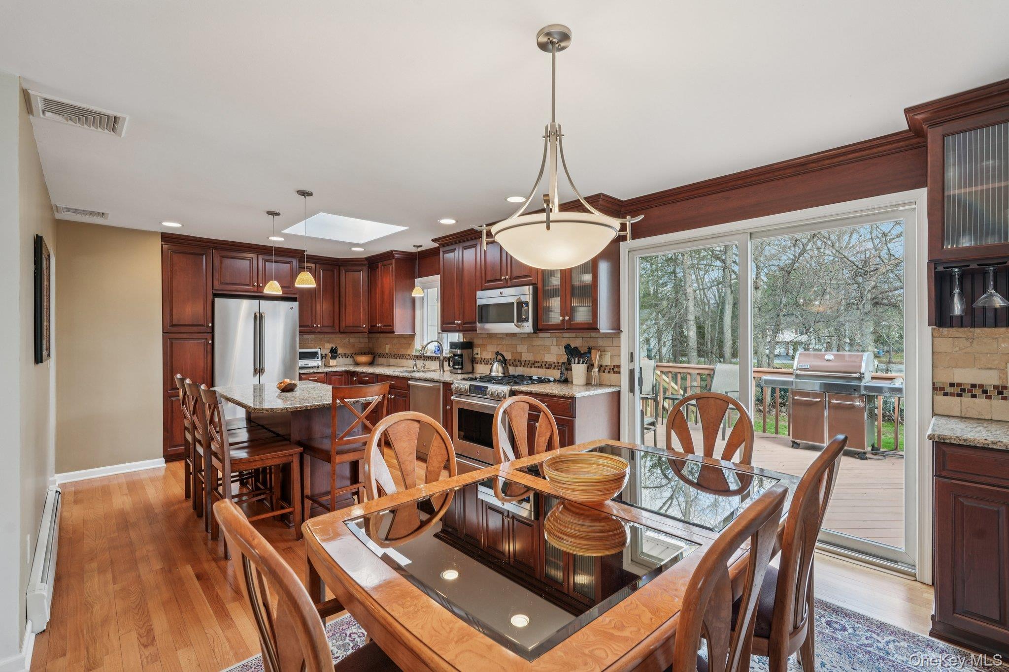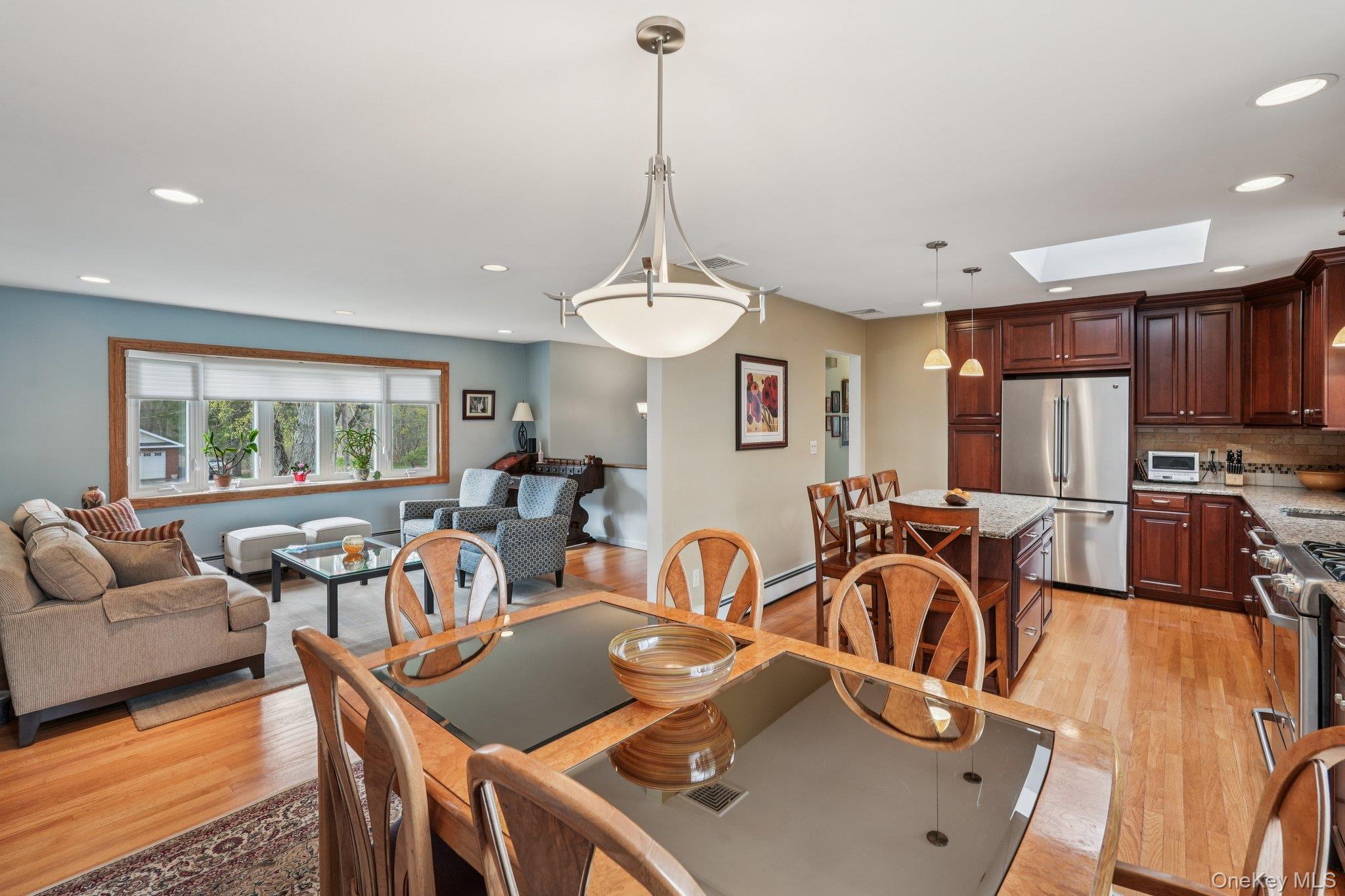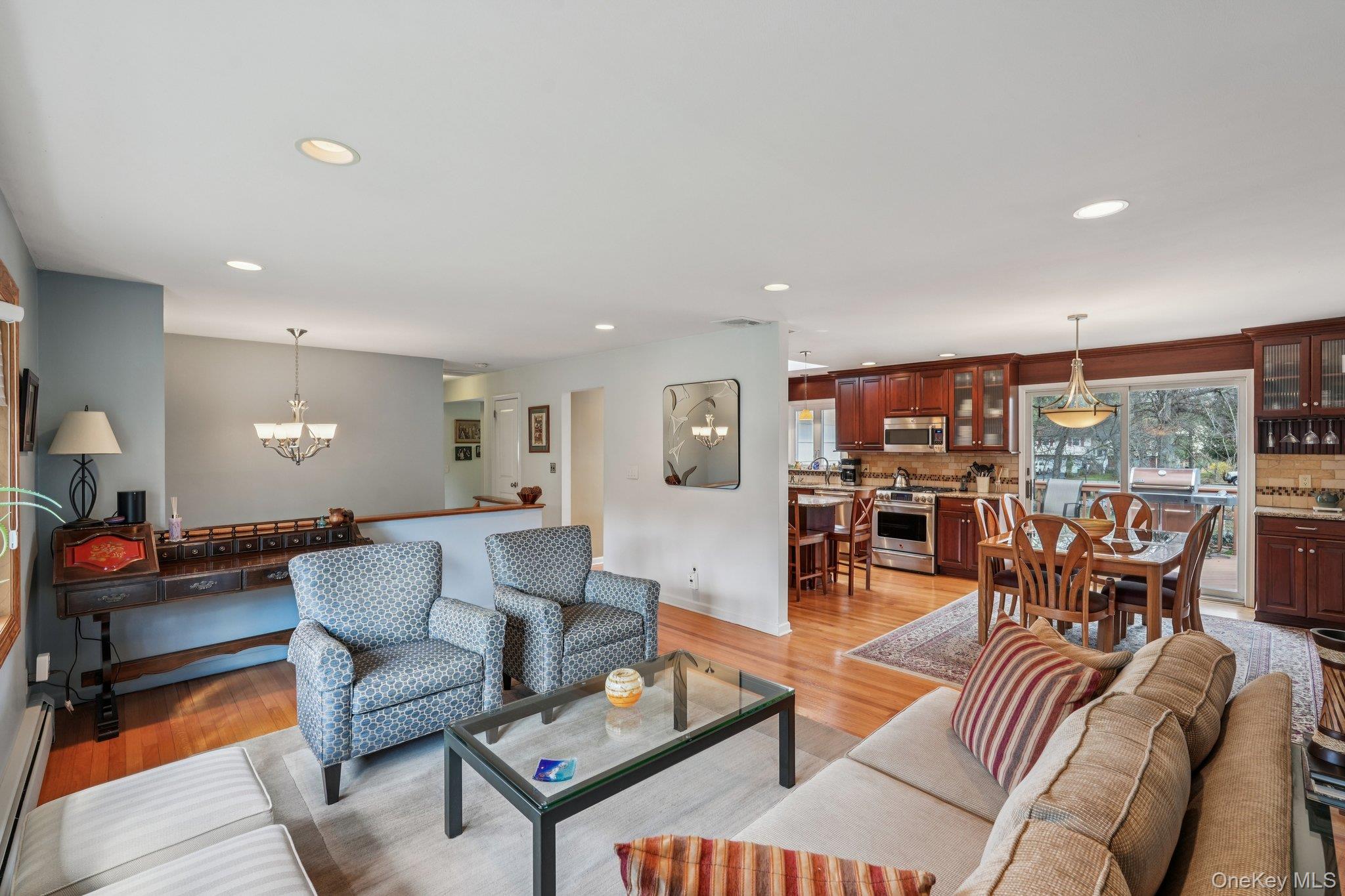 Nanuet, NY! With its highly sought-after award-winning schools, this stunningly renovated and expanded raised ranch checks off all the boxes: SUPERB COMMUTER LOCATION, GREAT NEIGHBORHOOD ON A QUIET STREET, AFFORDABLE and MOVE-IN READY! Boasting almost 2300 sq ft, this 4 bedroom 2. 5 bath home features a high end renovated designer eat-in kitchen with custom cherry cabinets and tons of storage, GE suite of stainless steel appliances, granite counters and an island that seats 4. The kitchen cabinets extend into the open dining room tastefully joining the 2 rooms for effortless entertaining. The formal living room showcases gorgeous hardwood floors that extend throughout most of the main level. Not to be missed is the primary ensuite addition with its own private hallway leading to an oversized bedroom with seating area, custom walk-in closet and private full bath with Jacuzzi tub. 3 additional bedrooms and a gorgeously updated hallway bath complete the main floor. The lower level, with another renovated bath, features a large family room/flex space with a wood burning stove and sliding glass doors leading to a pavered patio and lovely, level backyard. 2 car garage, central air. Entire HVAC system replaced ’20, Roof Approx 10-15 years old, HWH ’22. Minutes to the PIP, NYS Thruway and Nanuet train station. THIS IS A TURN KEY HOME, NOTHING TO DO BUT MOVE IN!