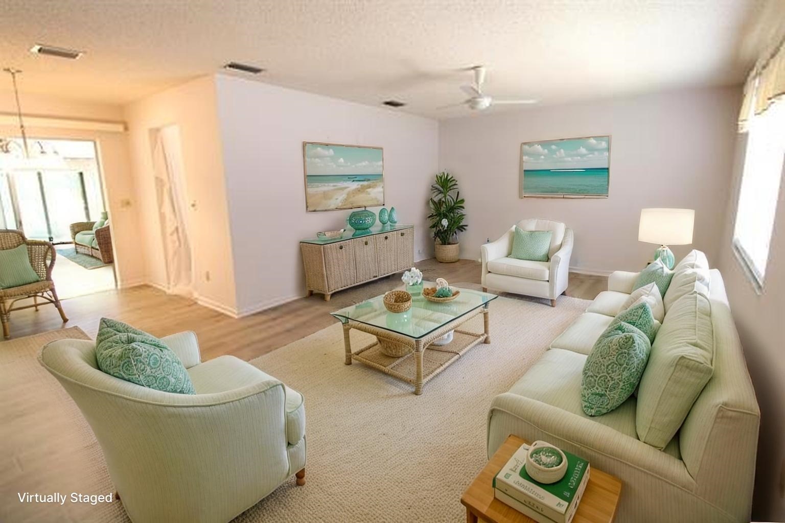 2 Bedroom 1. 5 bath concrete block home in St. Augustine Shores! This home features handsome laminate flooring and large living room with a separate dining area. You will spend lots of time in the rear Florida room that is full of natural light and a great view of the large backyard. Other features include a 1 car garage with shelving and a rear entry door, storage shed, new A/C in 2025 and newer windows. Saint Augustine Shores has low HOA fees and nice amenities including children's playground, fishing pier, and clubhouse with pool. This home is a great starter or retirement home at an affordable price!