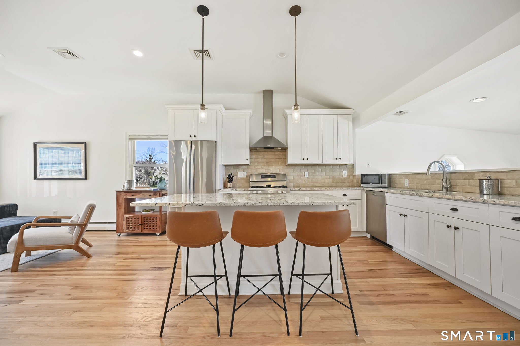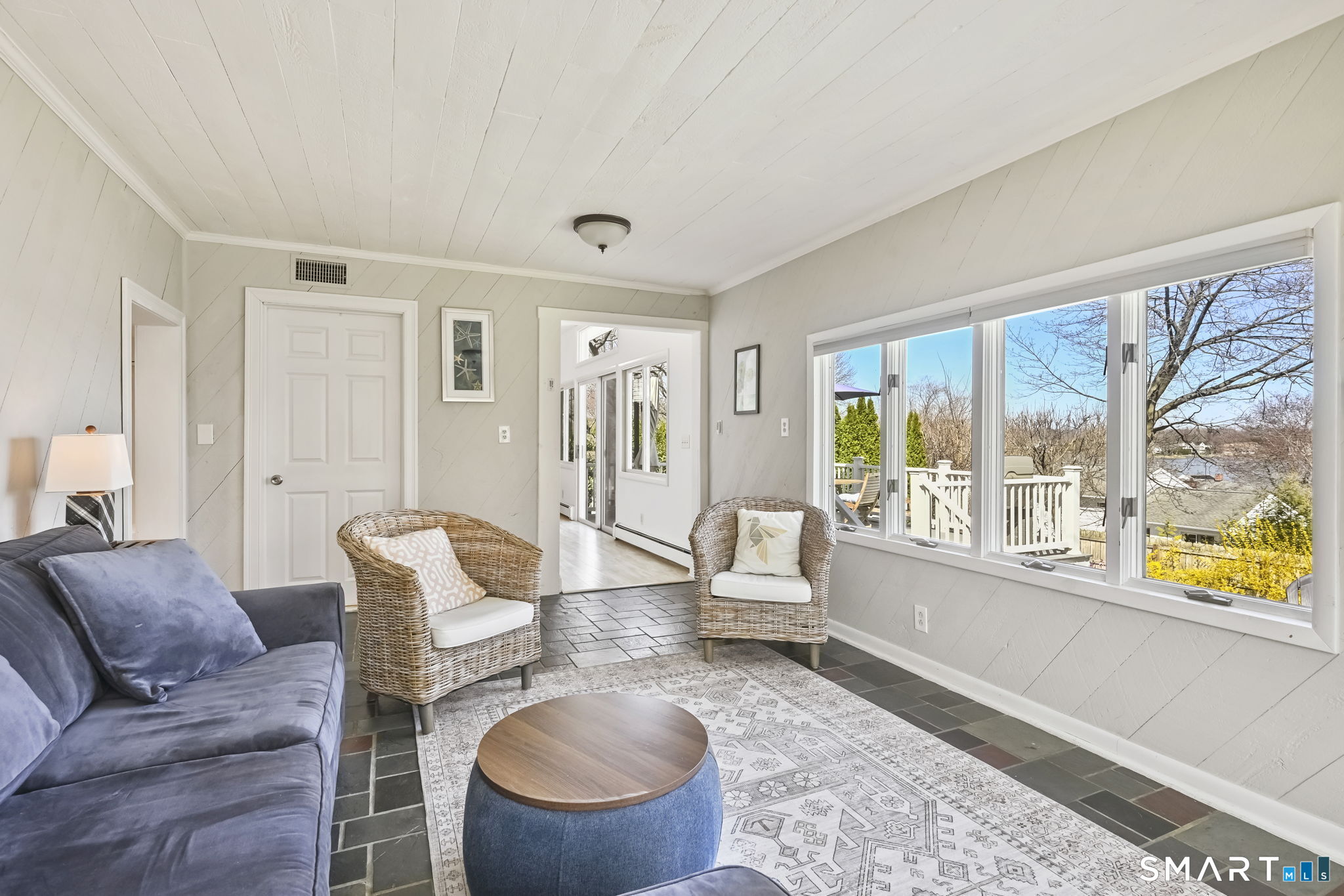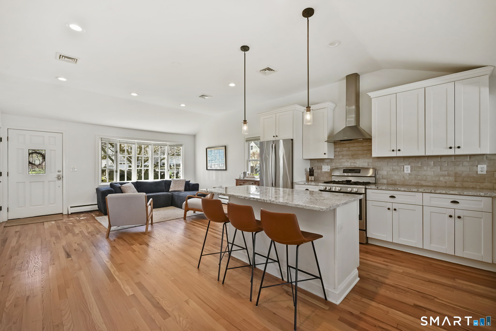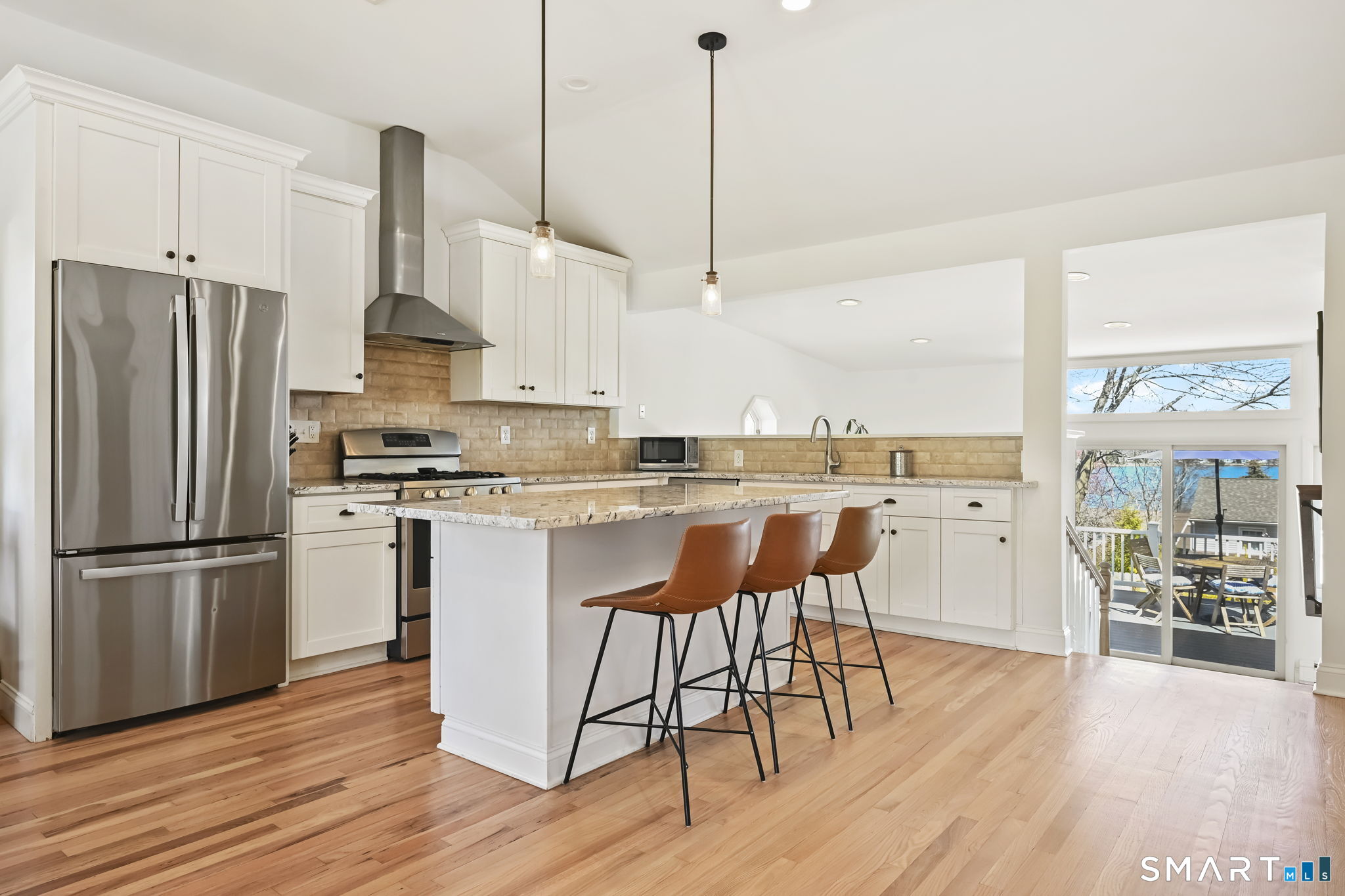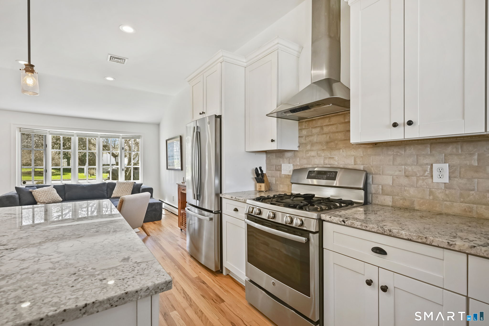 UPDATED, GORGEOUS HOME WITH WATER VIEWS! ENJOY BEAUTIFUL SUNRISES OVER THE WATER EVERY MORNING! EXPERIENCE COASTAL LIVING IN STAMFORD'S HIGHLY DESIRABLE COVE ISLAND PARK COMMUNITY! Ideally located just a few blocks from the beach, this stunning, sun-filled open-flow home offers 3 bedrooms, with a flexible family room/4th bedroom option with full bath, perfect for guests or in-law. Most recent updates include a new dishwasher, refrigerator, washer/dryer in 2023, new patio with blue stone, new walkway and front stoop with blue stone and concrete all in 2024, interior freshly painted and epoxy floor in garage in 2026. Live like you're on vacation all year long! Enjoy kayaking, multi-use trails, boating, or just relax at the beach at Cove Island Park, and there's also ice skating at the Terry Connors Ice Rink! Visit SoundWaters Coastal Education Center which also has summer programs! Commuters delight with convenience to downtown Stamford, Metro-North train station, major highways. Just minutes to Chelsea Piers, Stamford's downtown restaurants, shopping, and entertainment.