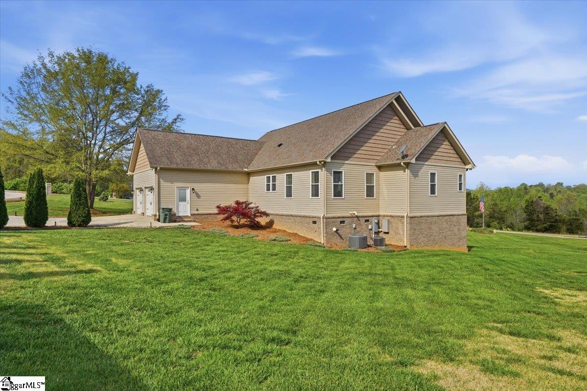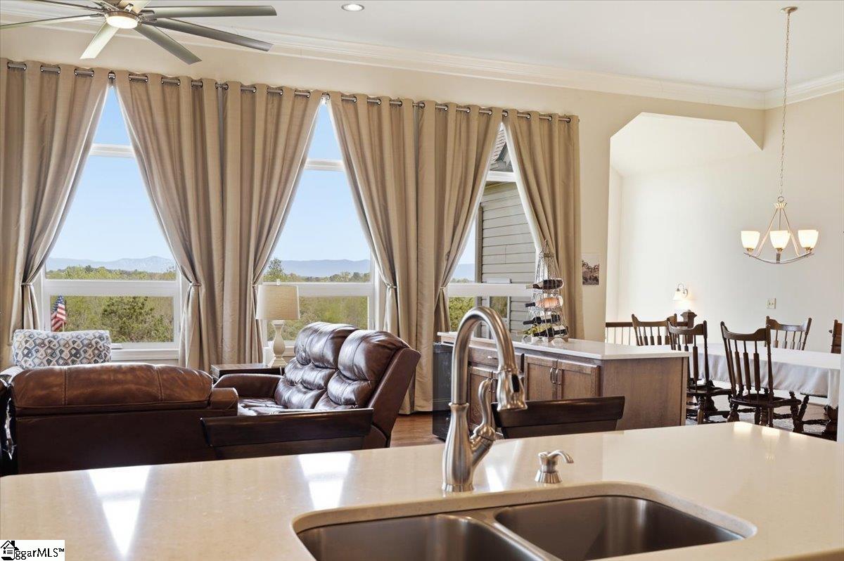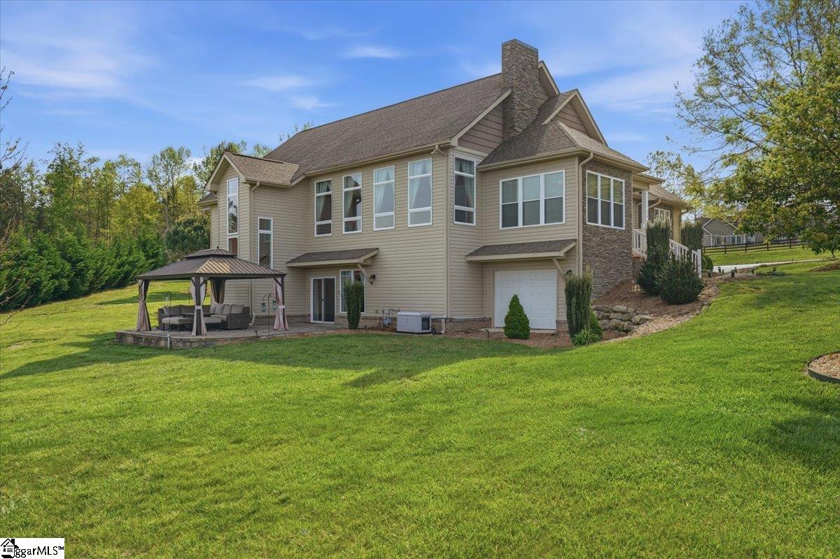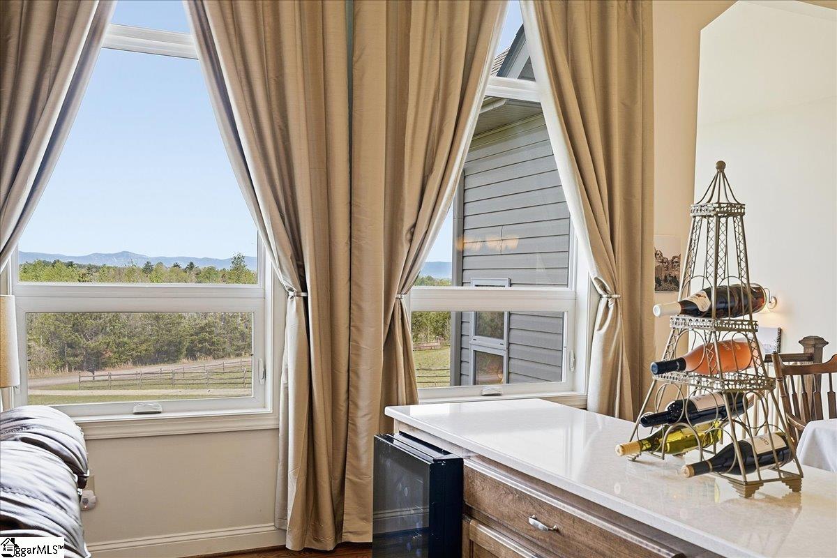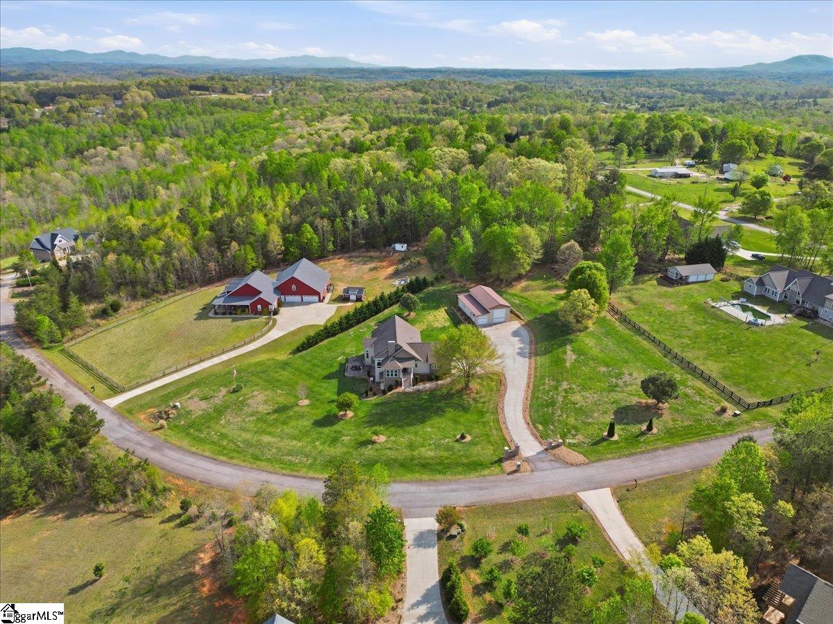 Modern convenience meets serene mountain living in this exceptional custom-built home built in 2016, set on 2 private acres with breathtaking views of Table Rock, Caesar’s Head, and Pinnacle Mountain, all just 25 minutes from downtown Greenville. Upon entry, you’re welcomed into a stunning open-concept living space where soaring ceilings and dramatic floor-to-ceiling windows frame sweeping mountain vistas. Natural light pours in, creating a bright, airy atmosphere that seamlessly blends indoor and outdoor living. Rich hardwood floors extend throughout the main living areas, adding warmth and sophistication. The kitchen is perfectly positioned to capture the views, with the sink overlooking the living room windows, and opens effortlessly to the main living and dining spaces. Thoughtfully designed for both everyday living and entertaining, it features quartz countertops, a spacious island with seating, soft-close cabinetry, a gas range with a custom hood, double ovens, and an oversized walk-in pantry. The main level includes dual primary suites, ideal for multi-generational living or hosting guests in comfort, each offering a generously appointed en-suite bath and expansive walk-in closet—creating two private, tranquil escapes within the home. The sunroom extends from the main living area, offering a sophisticated flex space ideal for a home office or quiet retreat—all while taking in the surrounding scenery. As you descend to the lower level, you’ll be treated to mountain views framed by the stairway windows. The lower level is designed for both privacy and versatility, featuring an additional living area that opens to a beautifully paved patio and gazebo, an ideal setting to relax and enjoy the mountain backdrop while grilling or gathering around the fire pit. Two additional bedrooms and a full bathroom provide comfortable accommodations for guests or family. An additional finished dedicated workshop or storage room connects to over 1, 000 square feet of unfinished storage space. A third garage bay attached to the workshop offers convenient space for a golf cart, mower, or additional equipment. For those who value both adventure and functionality, the impressive 30x50 detached garage is built to accommodate a 45’’ RV with full hookups, including electrical, water, and black water drainage. A second bay provides additional space for a boat, trailer, or workshop for tinkering. Additional highlights include a whole-house generator and a private 100-yard golf practice hole, bringing a touch of resort-style living to your own backyard. This home has been pre-inspected, with repairs already completed, offering peace of mind and move-in-ready confidence. Private, peaceful, and surrounded by natural beauty, this home is designed to enjoy the best of outdoor living in the Upstate.
