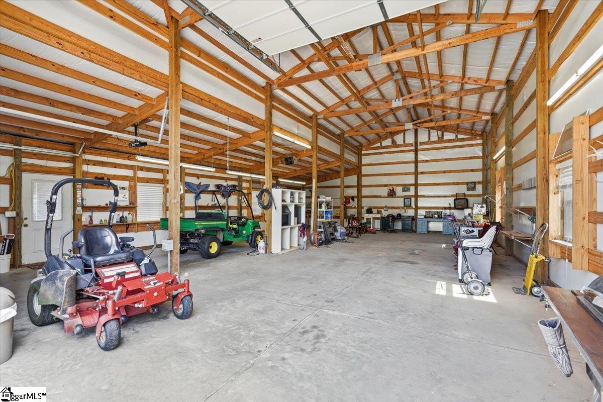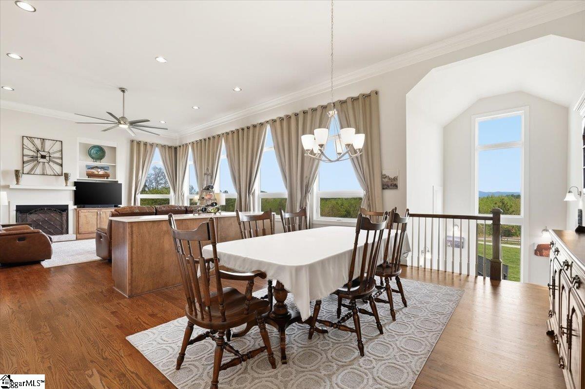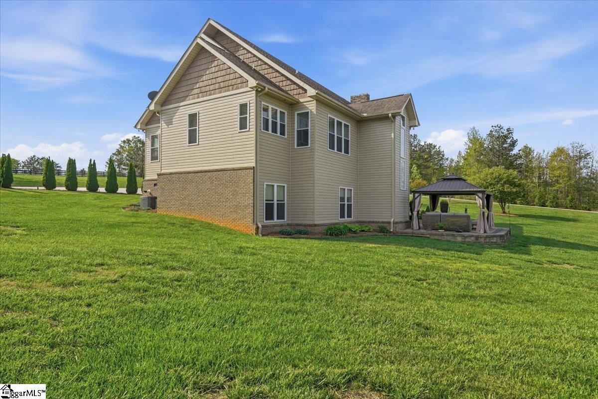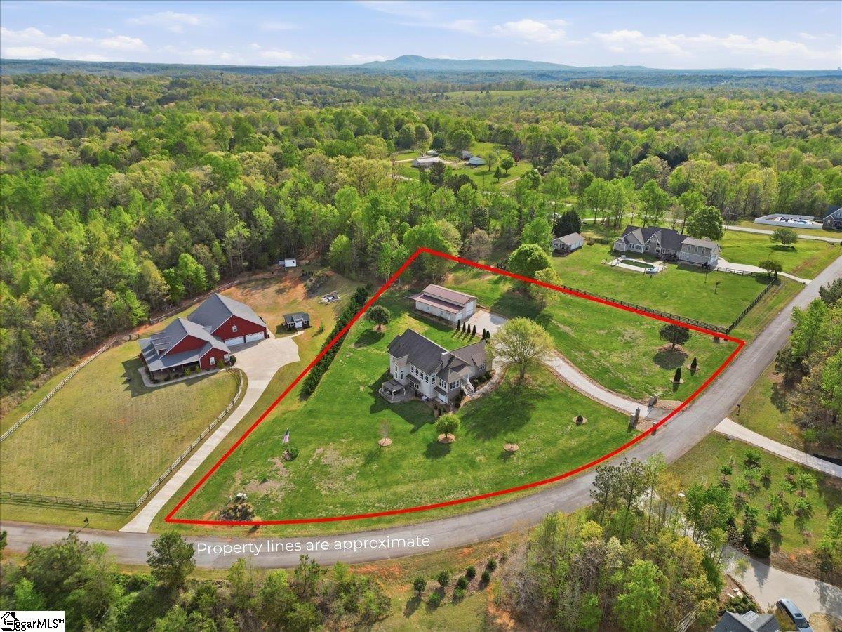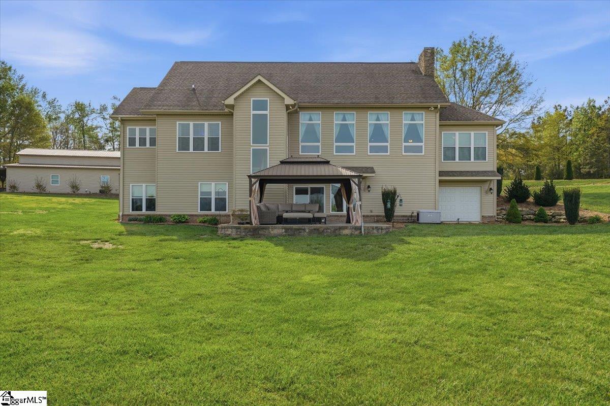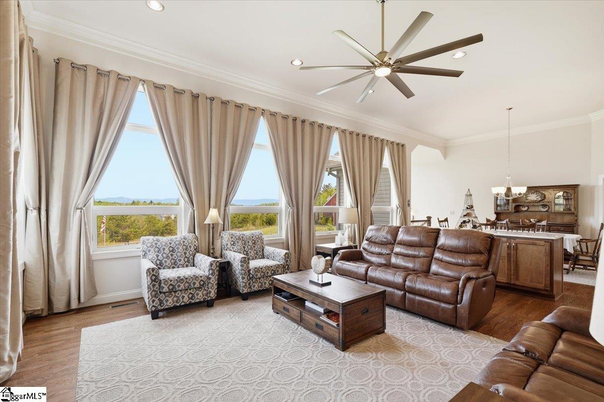 Modern convenience meets serene mountain living in this exceptional custom-built home built in 2016, set on 2 private acres with breathtaking views of Table Rock, Caesar’s Head, and Pinnacle Mountain, all just 25 minutes from downtown Greenville. Upon entry, you’re welcomed into a stunning open-concept living space where soaring ceilings and dramatic floor-to-ceiling windows frame sweeping mountain vistas. Natural light pours in, creating a bright, airy atmosphere that seamlessly blends indoor and outdoor living. Rich hardwood floors extend throughout the main living areas, adding warmth and sophistication. The kitchen is perfectly positioned to capture the views, with the sink overlooking the living room windows, and opens effortlessly to the main living and dining spaces. Thoughtfully designed for both everyday living and entertaining, it features quartz countertops, a spacious island with seating, soft-close cabinetry, a gas range with a custom hood, double ovens, and an oversized walk-in pantry. The main level includes dual primary suites, ideal for multi-generational living or hosting guests in comfort, each offering a generously appointed en-suite bath and expansive walk-in closet—creating two private, tranquil escapes within the home. The sunroom extends from the main living area, offering a sophisticated flex space ideal for a home office or quiet retreat—all while taking in the surrounding scenery. As you descend to the lower level, you’ll be treated to mountain views framed by the stairway windows. The lower level is designed for both privacy and versatility, featuring an additional living area that opens to a beautifully paved patio and gazebo, an ideal setting to relax and enjoy the mountain backdrop while grilling or gathering around the fire pit. Two additional bedrooms and a full bathroom provide comfortable accommodations for guests or family. An additional finished dedicated workshop or storage room connects to over 1, 000 square feet of unfinished storage space. A third garage bay attached to the workshop offers convenient space for a golf cart, mower, or additional equipment. For those who value both adventure and functionality, the impressive 30x50 detached garage is built to accommodate a 45’’ RV with full hookups, including electrical, water, and black water drainage. A second bay provides additional space for a boat, trailer, or workshop for tinkering. Additional highlights include a whole-house generator and a private 100-yard golf practice hole, bringing a touch of resort-style living to your own backyard. This home has been pre-inspected, with repairs already completed, offering peace of mind and move-in-ready confidence. Private, peaceful, and surrounded by natural beauty, this home is designed to enjoy the best of outdoor living in the Upstate.
