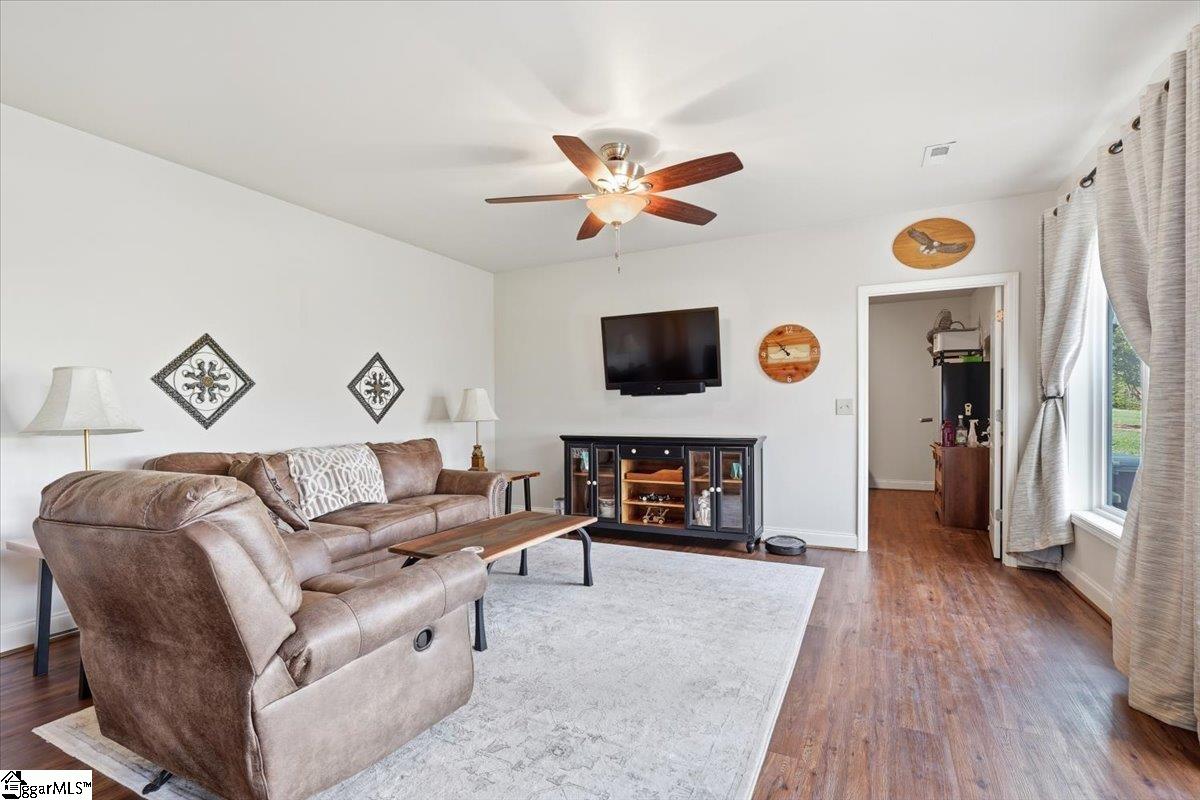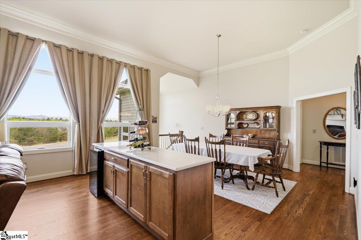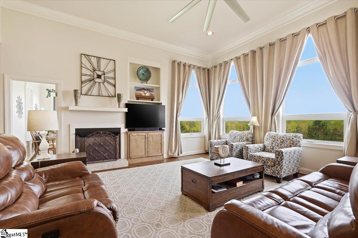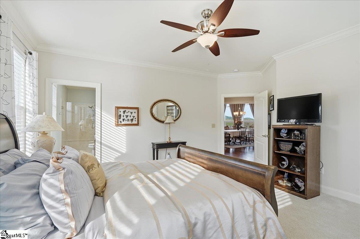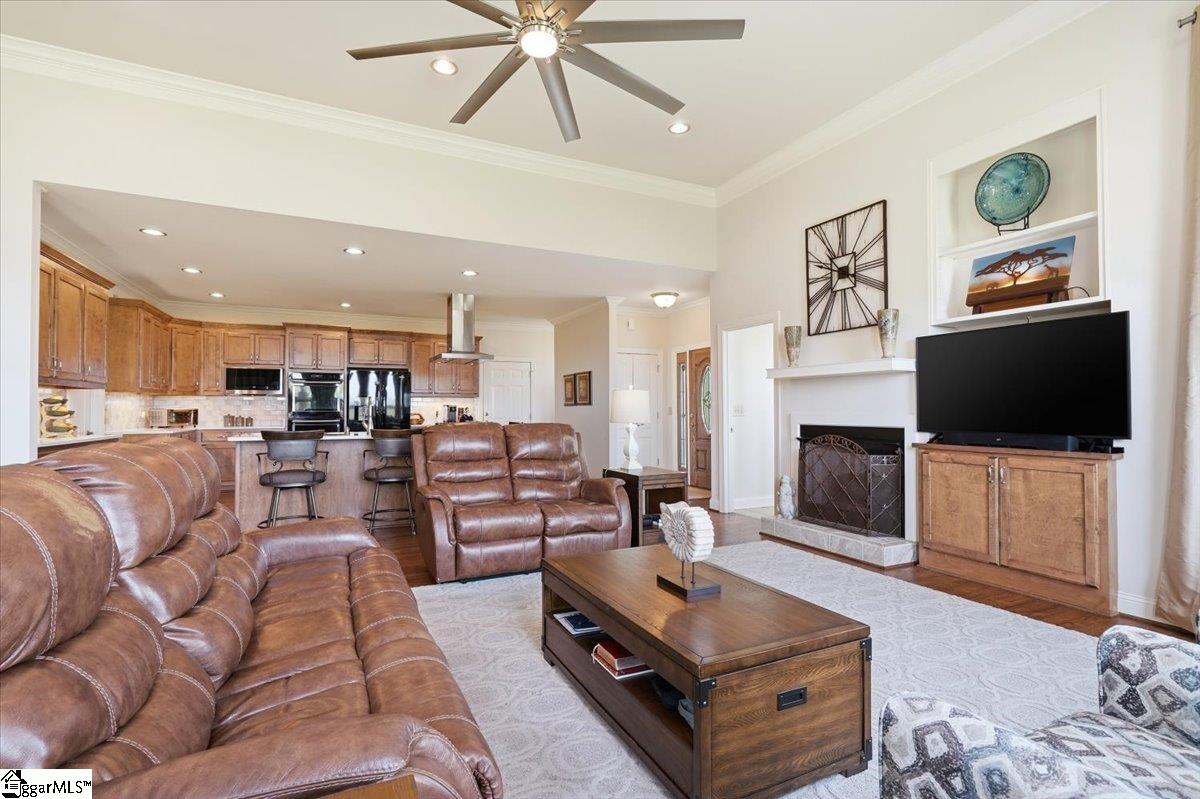 Modern convenience meets serene mountain living in this exceptional custom-built home built in 2016, set on 2 private acres with breathtaking views of Table Rock, Caesar’s Head, and Pinnacle Mountain, all just 25 minutes from downtown Greenville. Upon entry, you’re welcomed into a stunning open-concept living space where soaring ceilings and dramatic floor-to-ceiling windows frame sweeping mountain vistas. Natural light pours in, creating a bright, airy atmosphere that seamlessly blends indoor and outdoor living. Rich hardwood floors extend throughout the main living areas, adding warmth and sophistication. The kitchen is perfectly positioned to capture the views, with the sink overlooking the living room windows, and opens effortlessly to the main living and dining spaces. Thoughtfully designed for both everyday living and entertaining, it features quartz countertops, a spacious island with seating, soft-close cabinetry, a gas range with a custom hood, double ovens, and an oversized walk-in pantry. The main level includes dual primary suites, ideal for multi-generational living or hosting guests in comfort, each offering a generously appointed en-suite bath and expansive walk-in closet—creating two private, tranquil escapes within the home. The sunroom extends from the main living area, offering a sophisticated flex space ideal for a home office or quiet retreat—all while taking in the surrounding scenery. As you descend to the lower level, you’ll be treated to mountain views framed by the stairway windows. The lower level is designed for both privacy and versatility, featuring an additional living area that opens to a beautifully paved patio and gazebo, an ideal setting to relax and enjoy the mountain backdrop while grilling or gathering around the fire pit. Two additional bedrooms and a full bathroom provide comfortable accommodations for guests or family. An additional finished dedicated workshop or storage room connects to over 1, 000 square feet of unfinished storage space. A third garage bay attached to the workshop offers convenient space for a golf cart, mower, or additional equipment. For those who value both adventure and functionality, the impressive 30x50 detached garage is built to accommodate a 45’’ RV with full hookups, including electrical, water, and black water drainage. A second bay provides additional space for a boat, trailer, or workshop for tinkering. Additional highlights include a whole-house generator and a private 100-yard golf practice hole, bringing a touch of resort-style living to your own backyard. This home has been pre-inspected, with repairs already completed, offering peace of mind and move-in-ready confidence. Private, peaceful, and surrounded by natural beauty, this home is designed to enjoy the best of outdoor living in the Upstate.