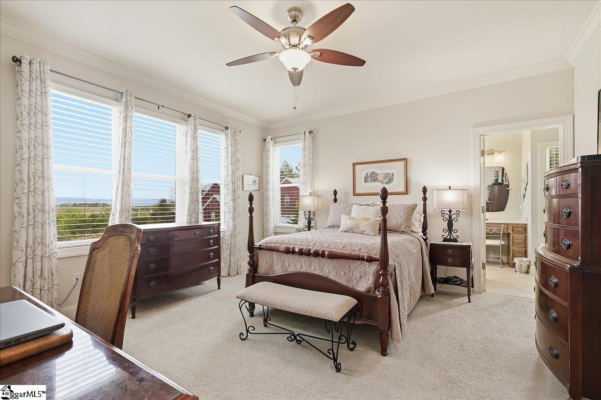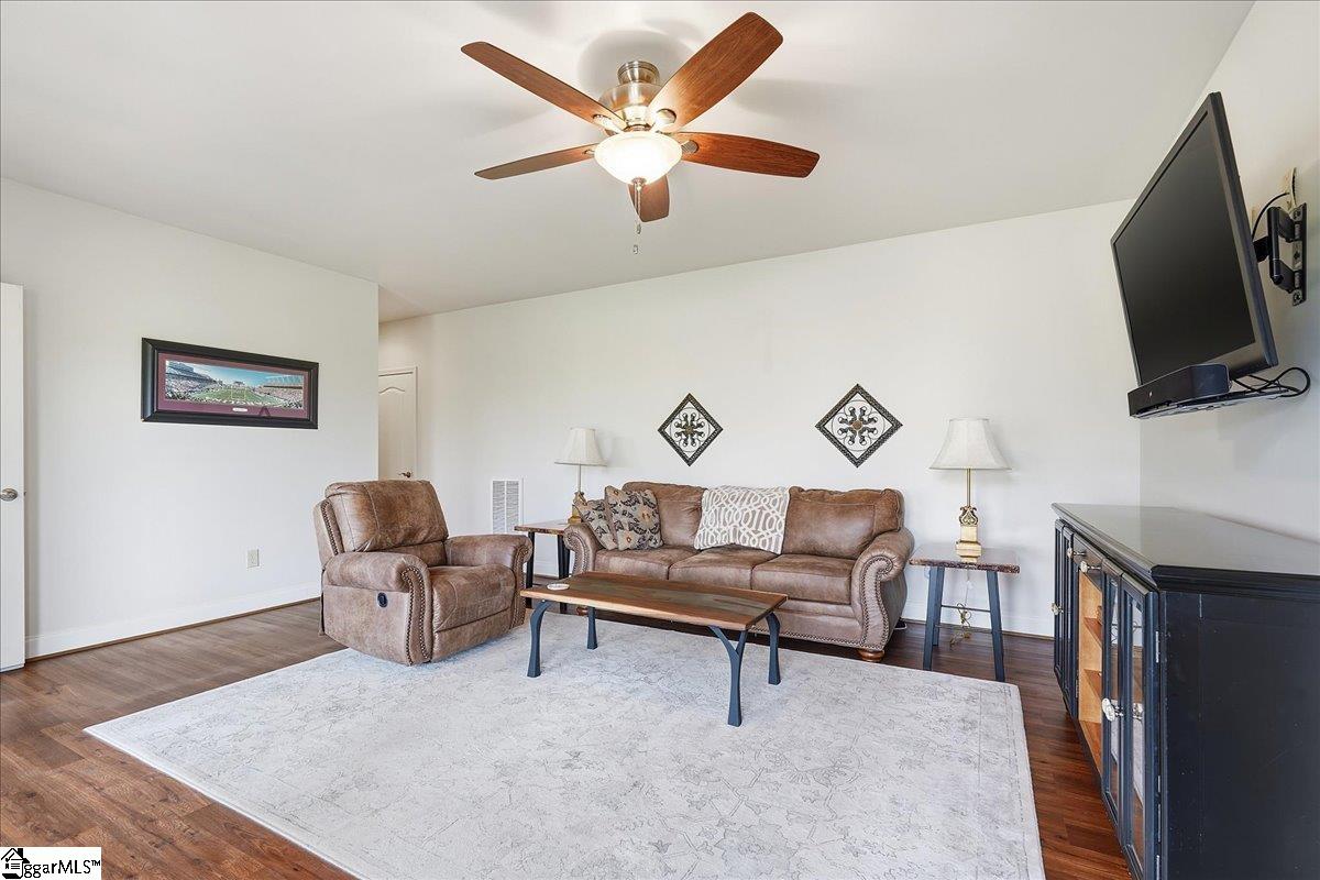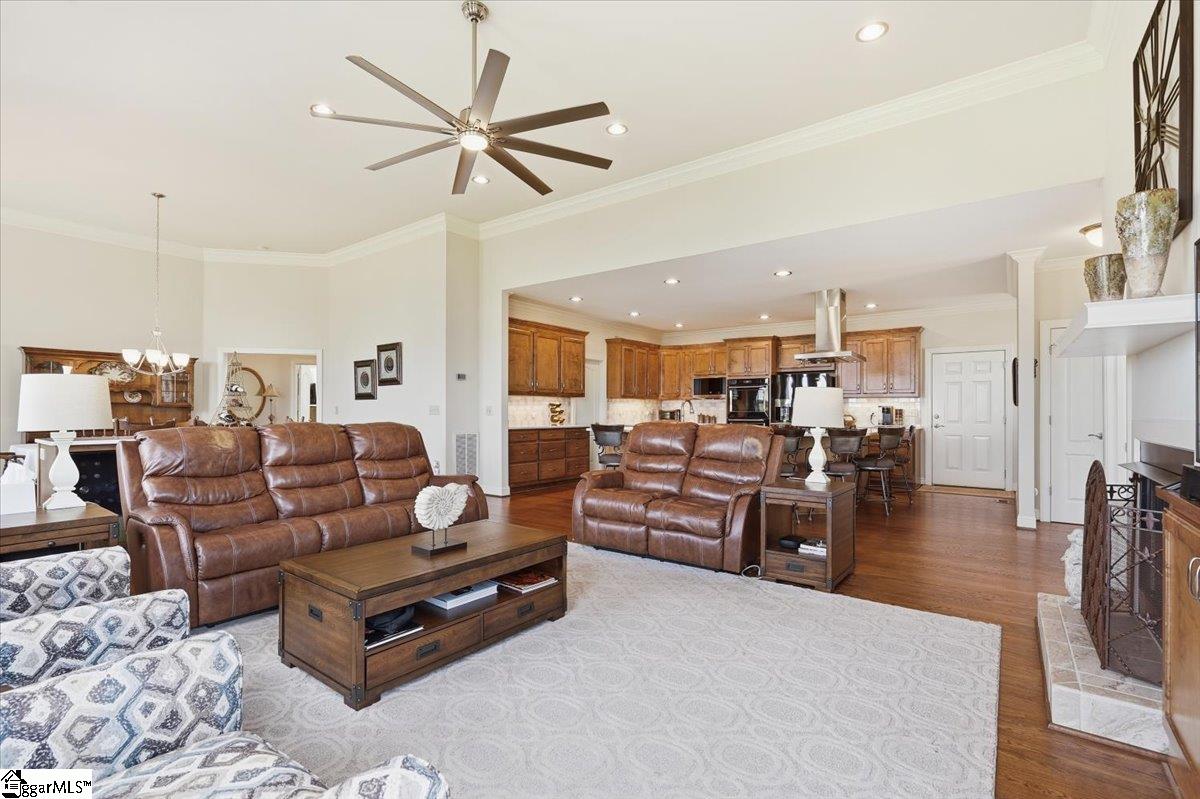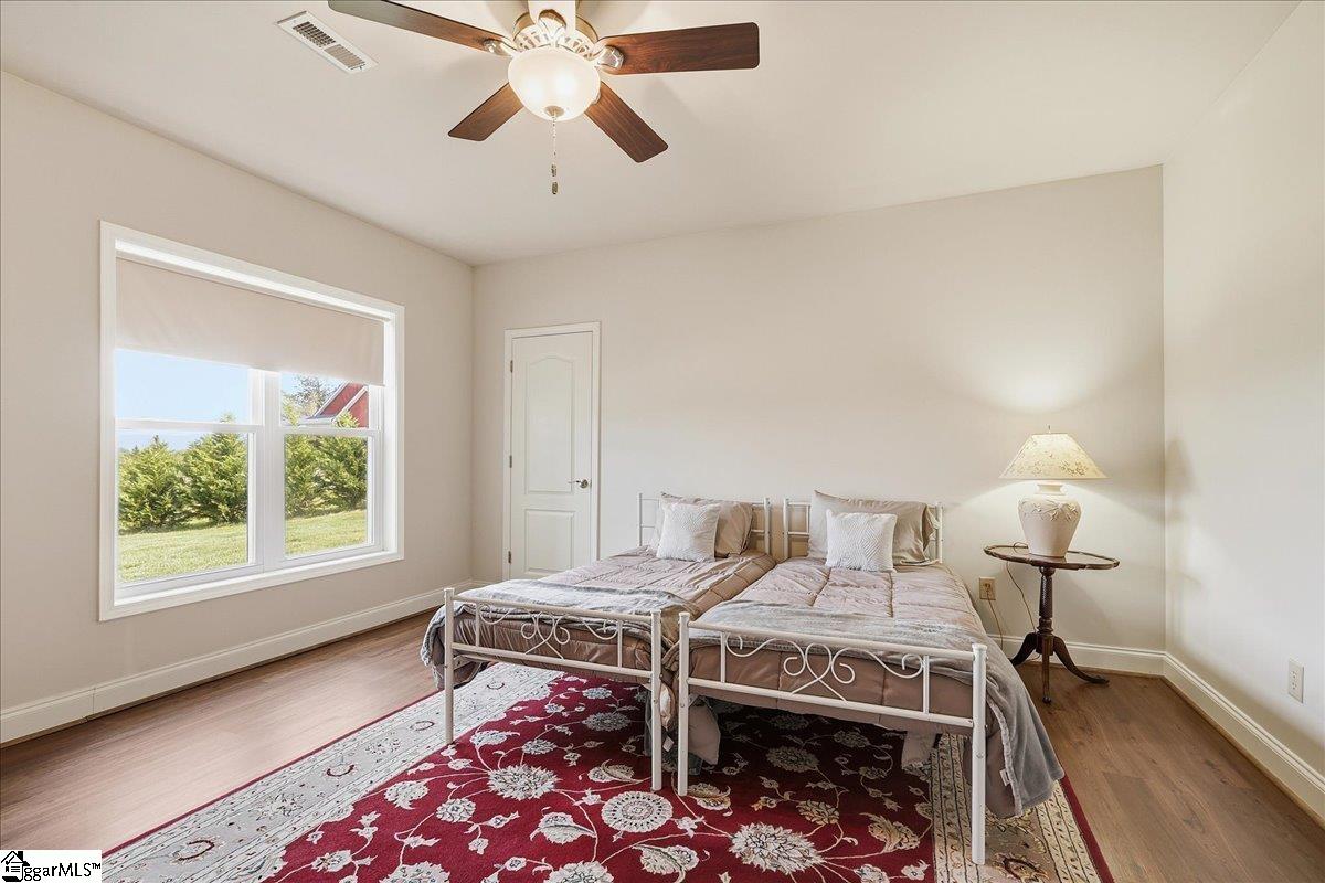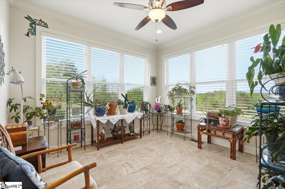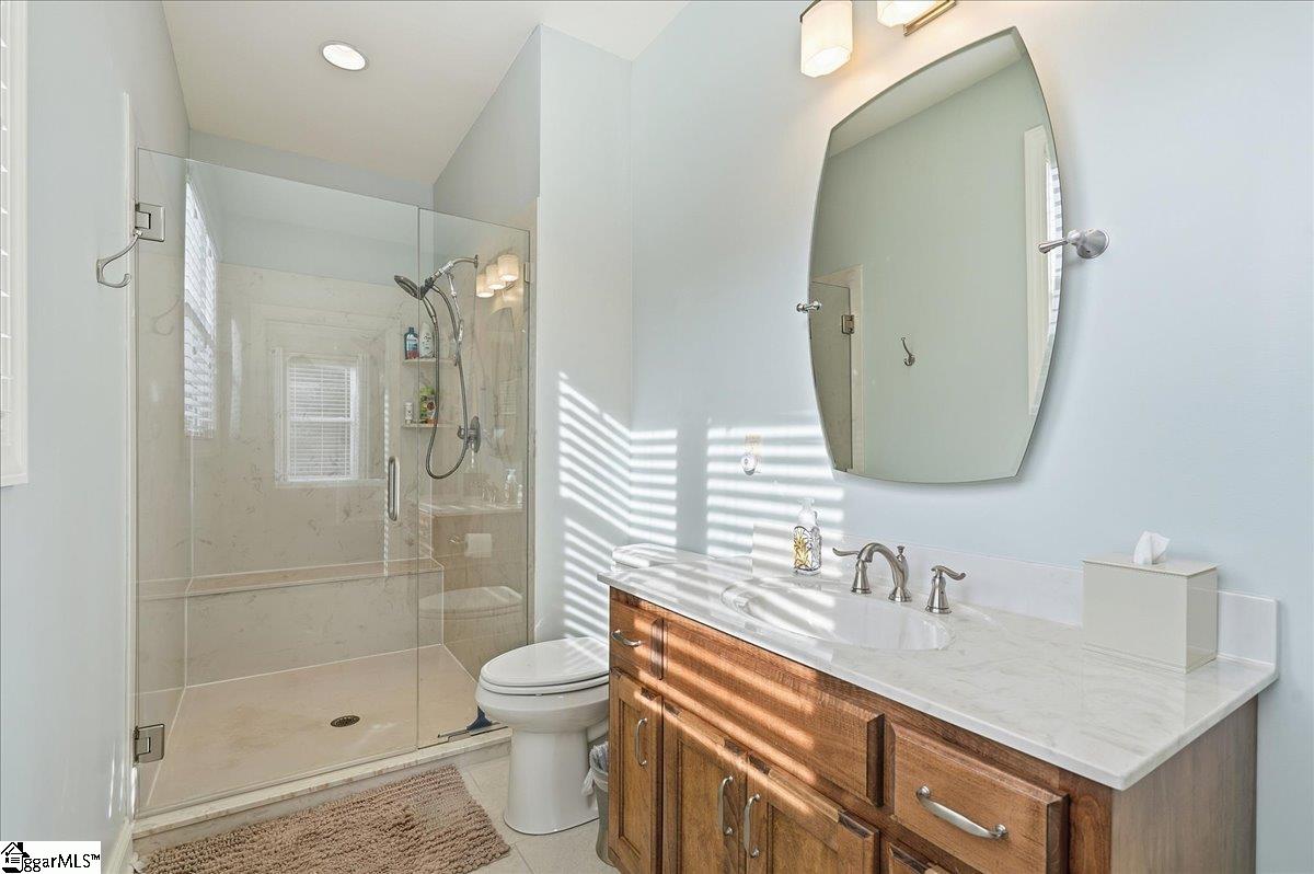 Modern convenience meets serene mountain living in this exceptional custom-built home built in 2016, set on 2 private acres with breathtaking views of Table Rock, Caesar’s Head, and Pinnacle Mountain, all just 25 minutes from downtown Greenville. Upon entry, you’re welcomed into a stunning open-concept living space where soaring ceilings and dramatic floor-to-ceiling windows frame sweeping mountain vistas. Natural light pours in, creating a bright, airy atmosphere that seamlessly blends indoor and outdoor living. Rich hardwood floors extend throughout the main living areas, adding warmth and sophistication. The kitchen is perfectly positioned to capture the views, with the sink overlooking the living room windows, and opens effortlessly to the main living and dining spaces. Thoughtfully designed for both everyday living and entertaining, it features quartz countertops, a spacious island with seating, soft-close cabinetry, a gas range with a custom hood, double ovens, and an oversized walk-in pantry. The main level includes dual primary suites, ideal for multi-generational living or hosting guests in comfort, each offering a generously appointed en-suite bath and expansive walk-in closet—creating two private, tranquil escapes within the home. The sunroom extends from the main living area, offering a sophisticated flex space ideal for a home office or quiet retreat—all while taking in the surrounding scenery. As you descend to the lower level, you’ll be treated to mountain views framed by the stairway windows. The lower level is designed for both privacy and versatility, featuring an additional living area that opens to a beautifully paved patio and gazebo, an ideal setting to relax and enjoy the mountain backdrop while grilling or gathering around the fire pit. Two additional bedrooms and a full bathroom provide comfortable accommodations for guests or family. An additional finished dedicated workshop or storage room connects to over 1, 000 square feet of unfinished storage space. A third garage bay attached to the workshop offers convenient space for a golf cart, mower, or additional equipment. For those who value both adventure and functionality, the impressive 30x50 detached garage is built to accommodate a 45’’ RV with full hookups, including electrical, water, and black water drainage. A second bay provides additional space for a boat, trailer, or workshop for tinkering. Additional highlights include a whole-house generator and a private 100-yard golf practice hole, bringing a touch of resort-style living to your own backyard. This home has been pre-inspected, with repairs already completed, offering peace of mind and move-in-ready confidence. Private, peaceful, and surrounded by natural beauty, this home is designed to enjoy the best of outdoor living in the Upstate.