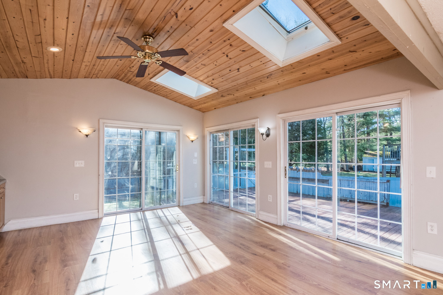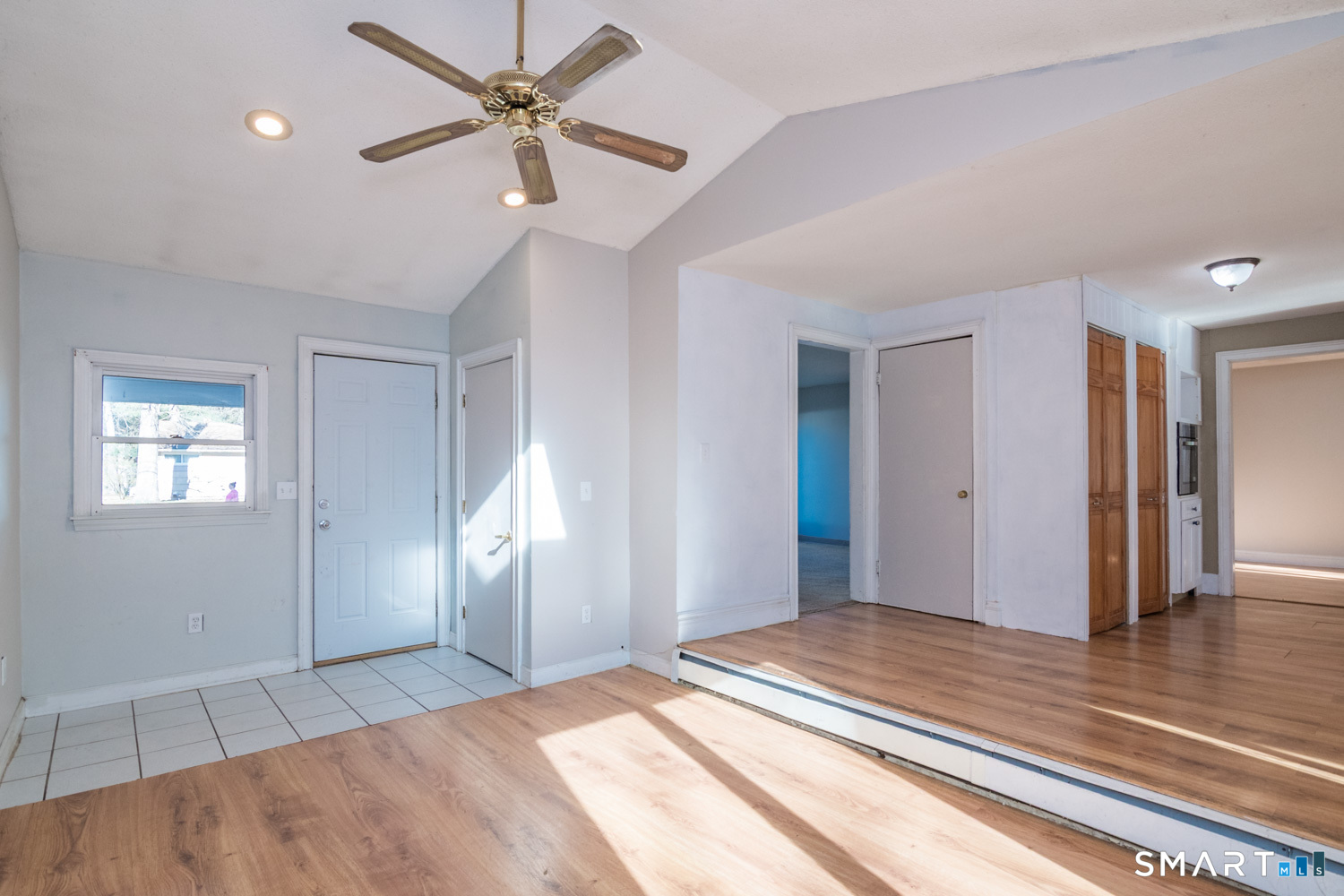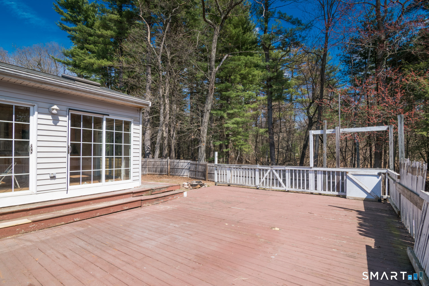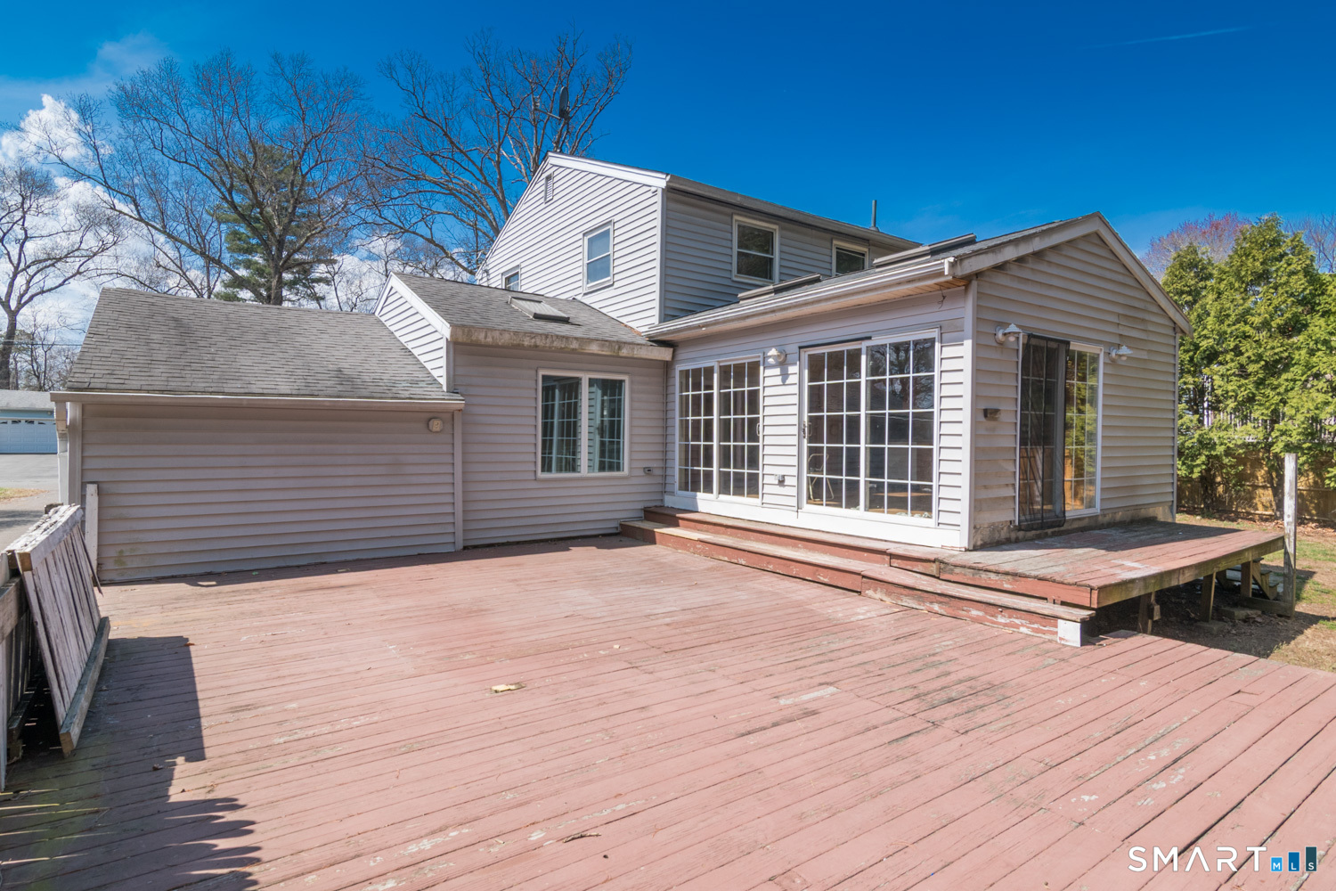Bright and sunny updated country kitchen featuring ample cabinetry, a tongueandgroove cathedral ceiling, two skylights, recessed lighting, and a ceiling fan. Sliding doors open to an oversized deck overlooking level backyard. A stepdown den off the kitchen offers large windows and recessed lighting, creating a comfortable and versatile space. The spacious living room features a bow window that fills the room with natural light. The second floor includes two additional bedrooms. Master bedroom was originally 2 bedrooms. The basement offers a partially finished room with wall to wall carpeting and a separate heating zone, ideal for exercise space or a home office. Additional features include three zone heating, a boiler approximately 10 years old per owner, and some newer windows. Property is being sold as is. Easy to show.