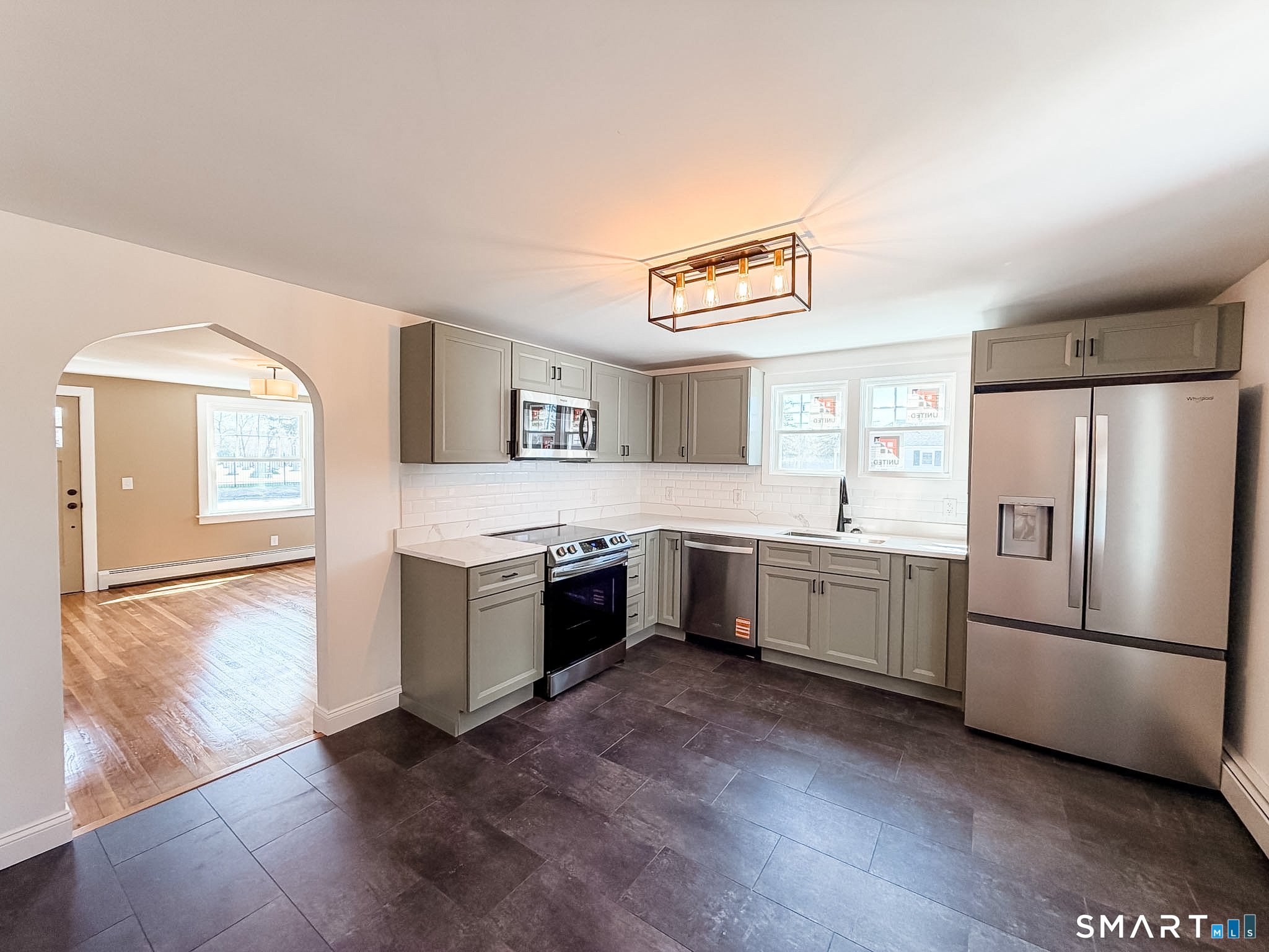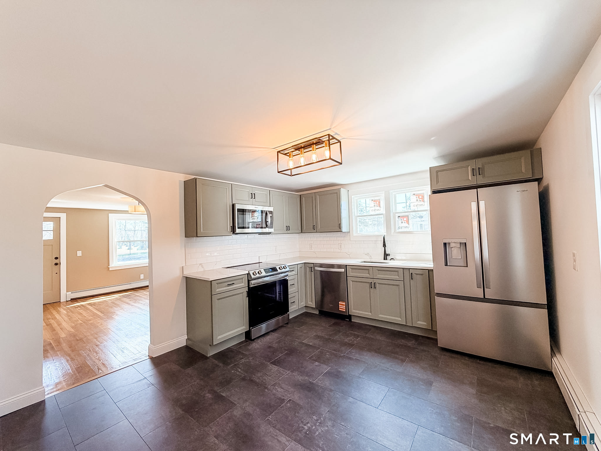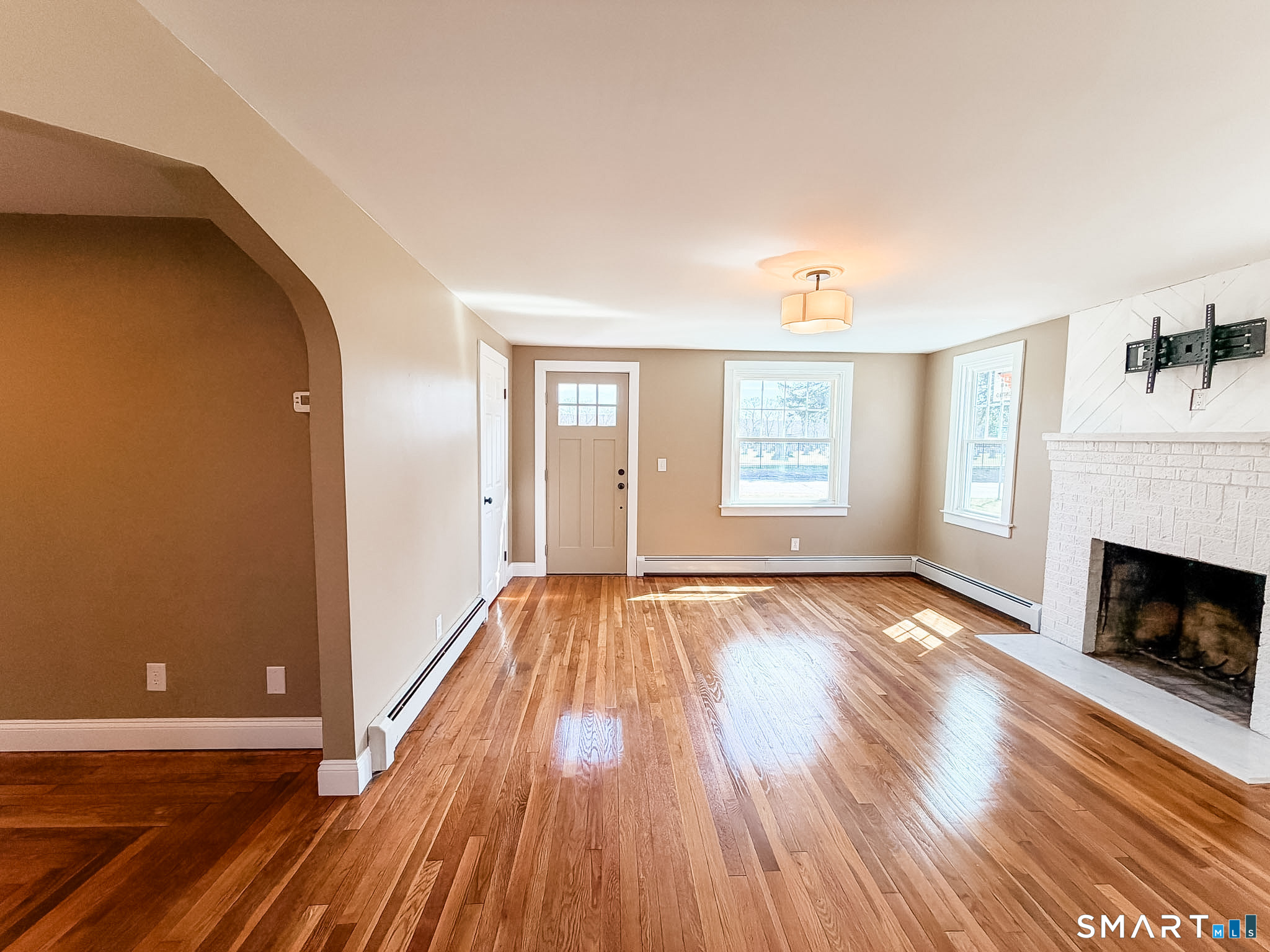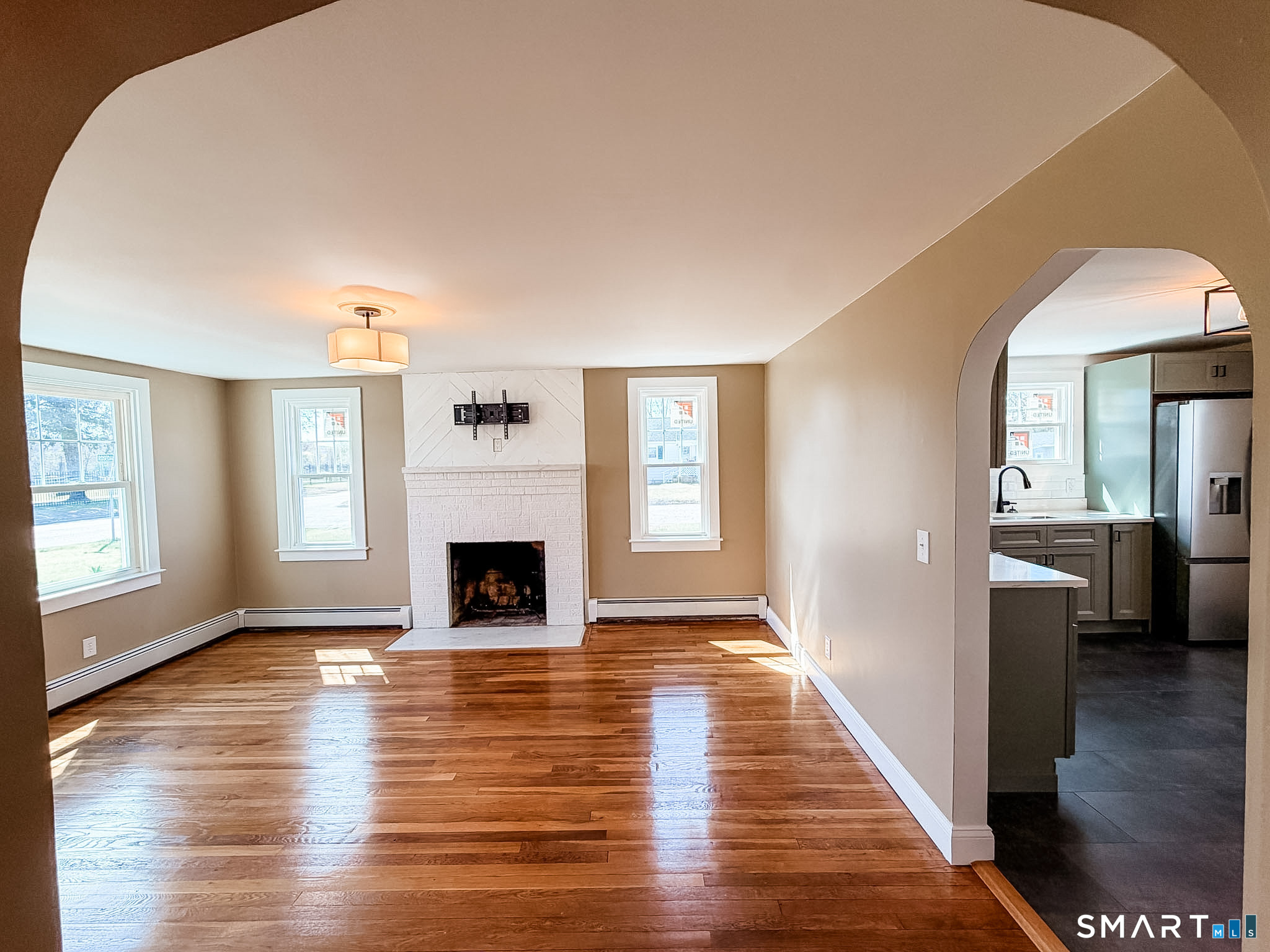 Fully remodeled and rich with character, this 4-bedroom and 1 bath Cape blends classic charm with modern updates. From the moment you enter, you'll appreciate the restored hardwood floors throughout the living room and all bedrooms, along with timeless details like arched openings and a cozy wood-burning fireplace. The updated kitchen features green cabinetry, quartz countertops, a subway tile backsplash, under-mount sink, and brand-new stainless steel appliances. New Durable LVP flooring extends from the kitchen into a spacious mudroom that connects the garage for everyday convenience-and is set up for first-floor laundry. The home offers four nicely sized bedrooms, with two on the main level and two upstairs, providing flexible living options. A fully remodeled main-level bathroom is conveniently located near the bedrooms and features stylish tile flooring, a green vanity with marble top, gold finishes, and a sliding barn door. Natural light fills the home, creating a warm and inviting feel throughout. Additional updates include many newer windows, a new oil tank, new exterior doors, freshly painted exterior and a new garage door. The garage also offers a lofted space for added storage or creative use. Owned solar panels help keep electric costs low. Great basement space ! A move-in ready home that offers character, efficiency, and modern comfort, conveniently located with easy access to Route 6 and I-395.