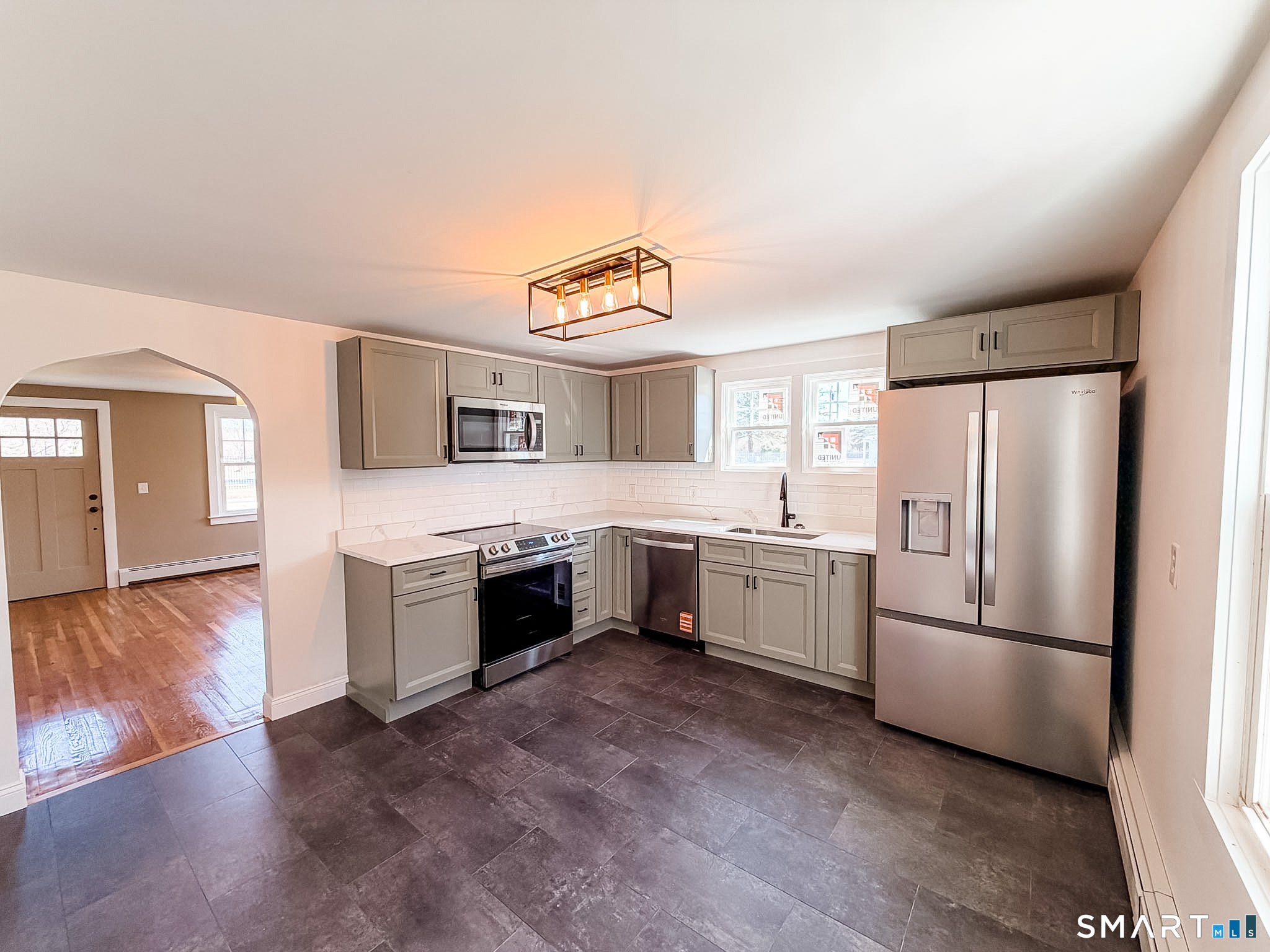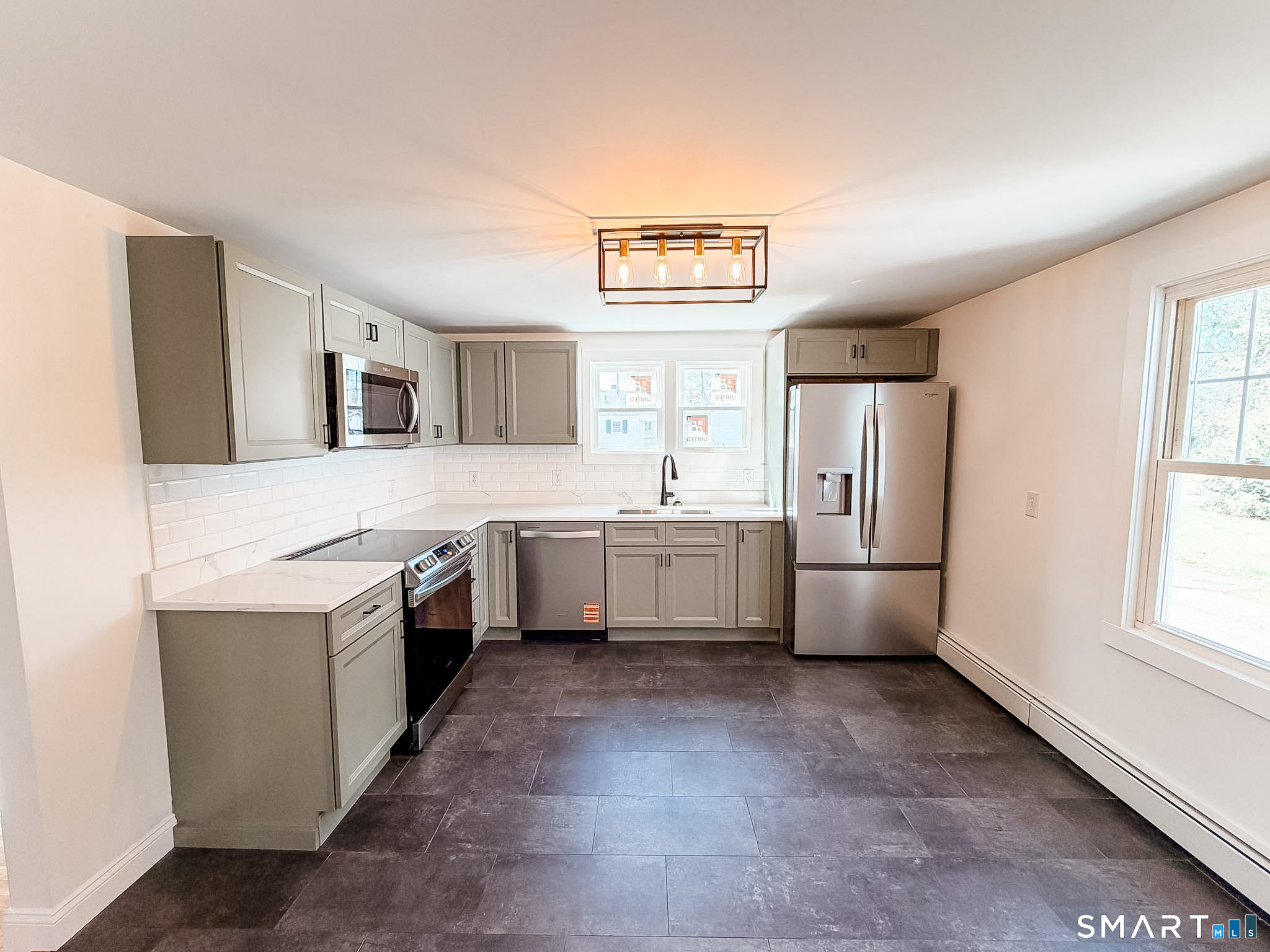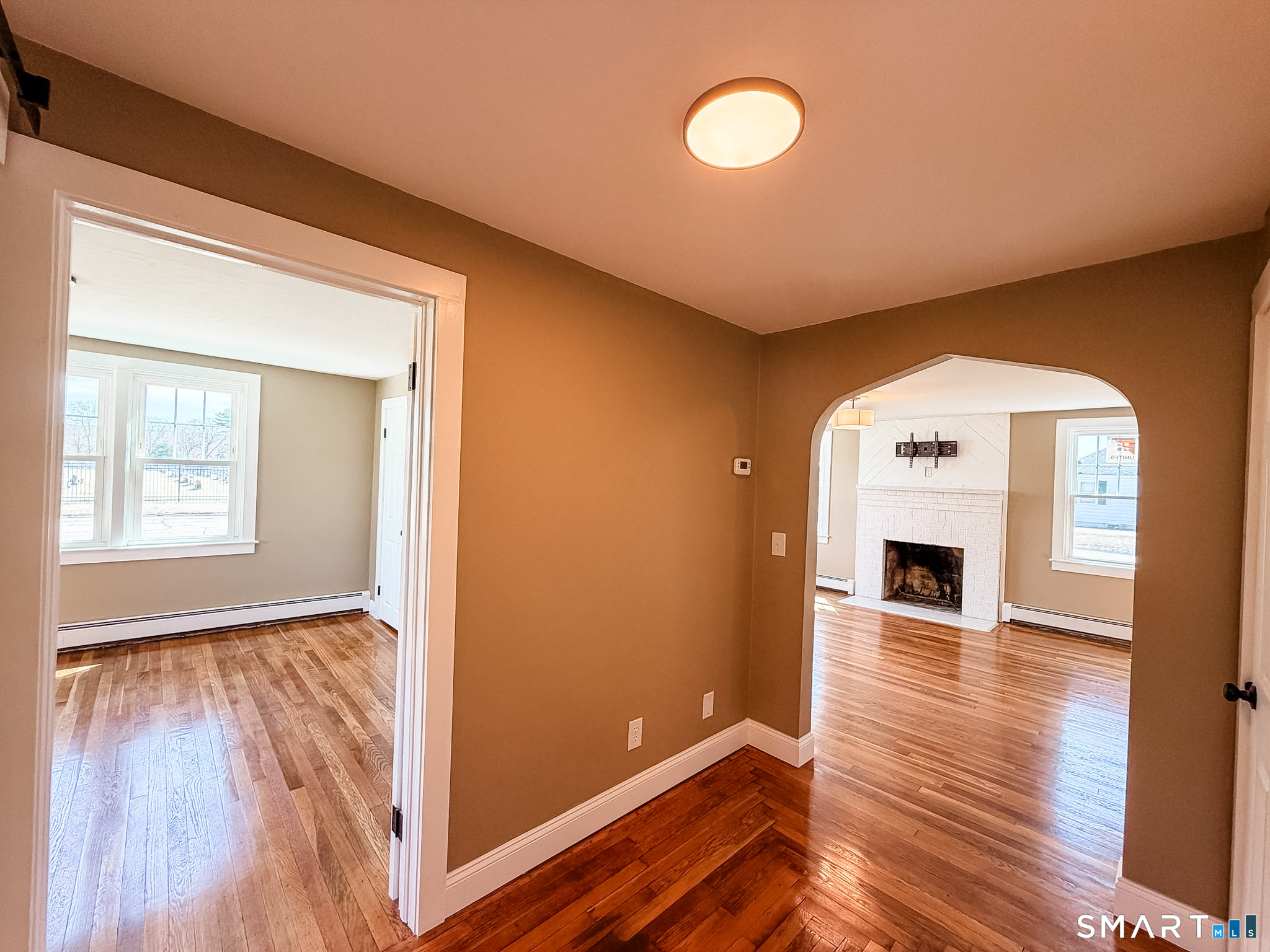 Fully remodeled and rich with character, this 4-bedroom and 1 bath Cape blends classic charm with modern updates. From the moment you enter, you'll appreciate the restored hardwood floors throughout the living room and all bedrooms, along with timeless details like arched openings and a cozy wood-burning fireplace. The updated kitchen features green cabinetry, quartz countertops, a subway tile backsplash, under-mount sink, and brand-new stainless steel appliances. New Durable LVP flooring extends from the kitchen into a spacious mudroom that connects the garage for everyday convenience-and is set up for first-floor laundry. The home offers four nicely sized bedrooms, with two on the main level and two upstairs, providing flexible living options. A fully remodeled main-level bathroom is conveniently located near the bedrooms and features stylish tile flooring, a green vanity with marble top, gold finishes, and a sliding barn door. Natural light fills the home, creating a warm and inviting feel throughout. Additional updates include many newer windows, a new oil tank, new exterior doors, freshly painted exterior and a new garage door. The garage also offers a lofted space for added storage or creative use. Owned solar panels help keep electric costs low. Great basement space ! A move-in ready home that offers character, efficiency, and modern comfort, conveniently located with easy access to Route 6 and I-395.