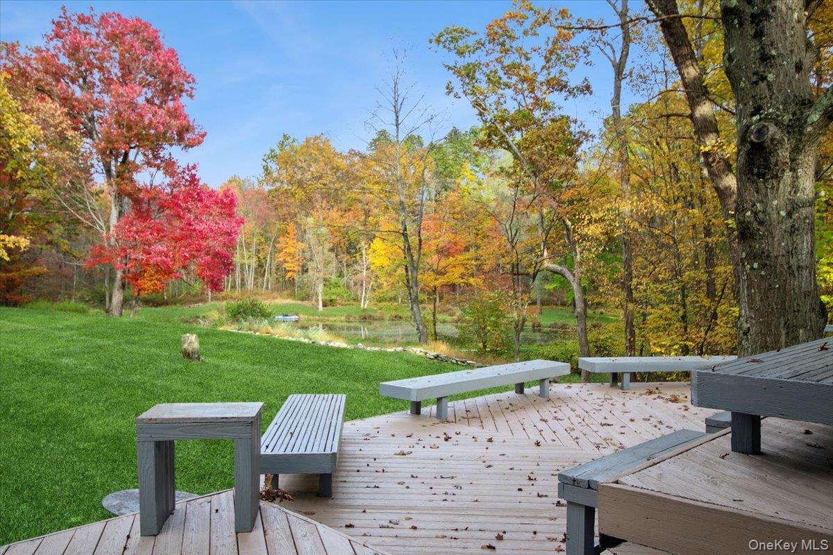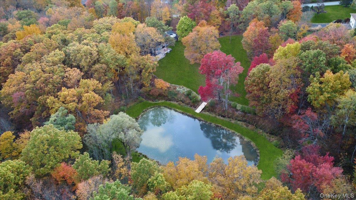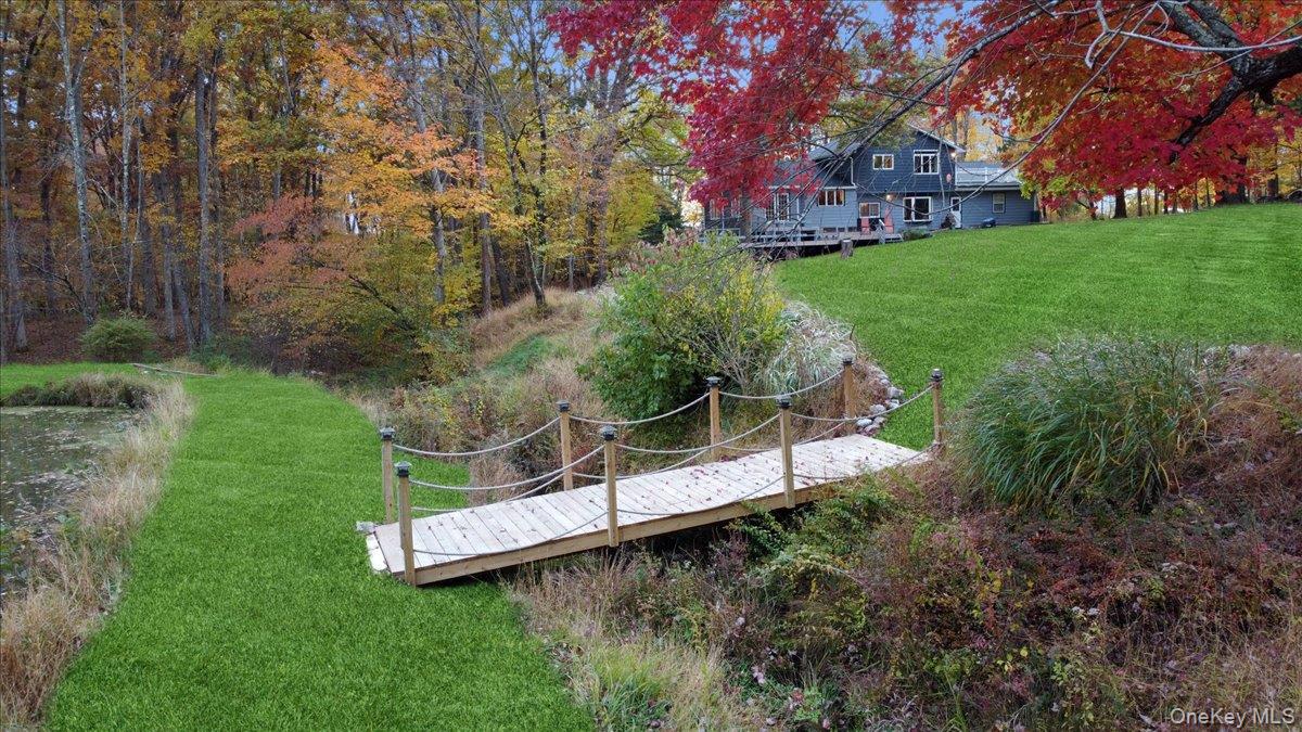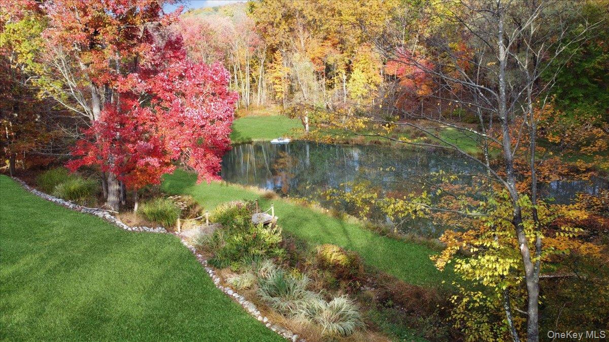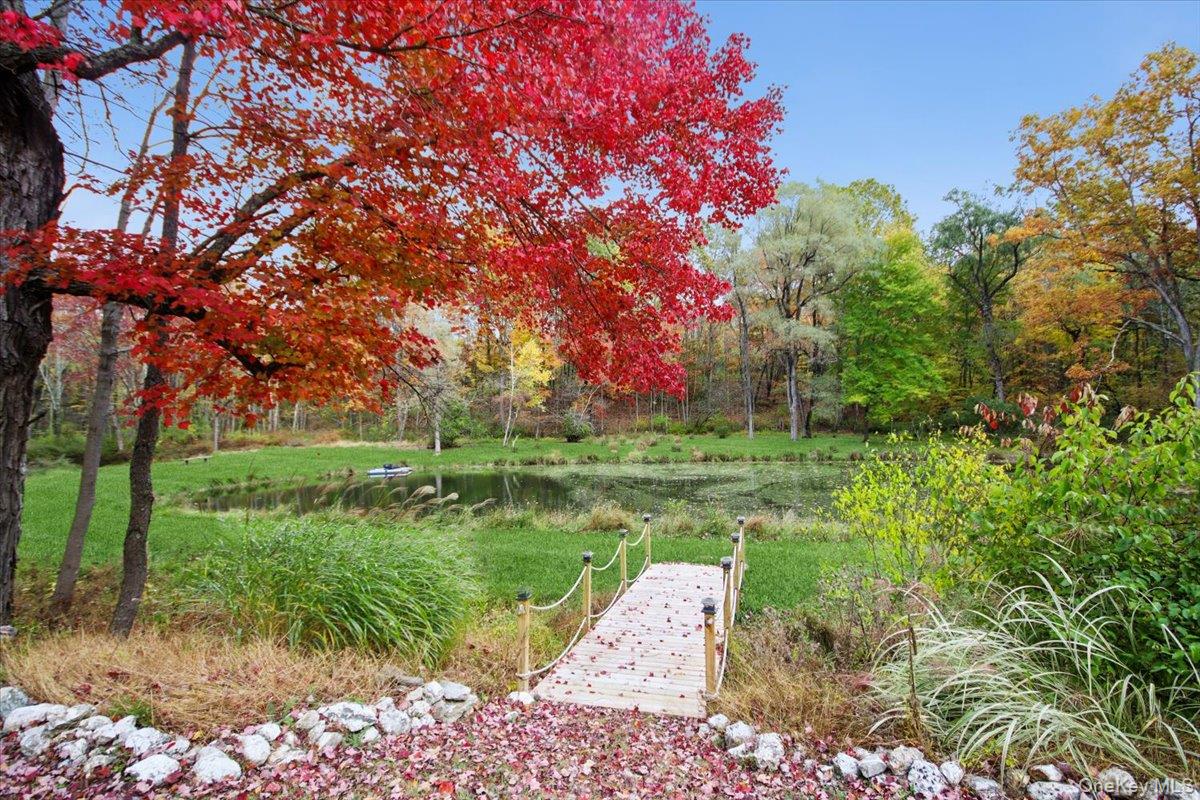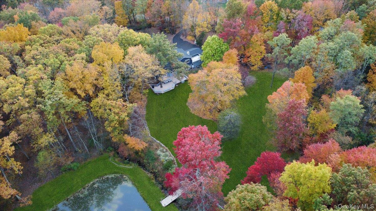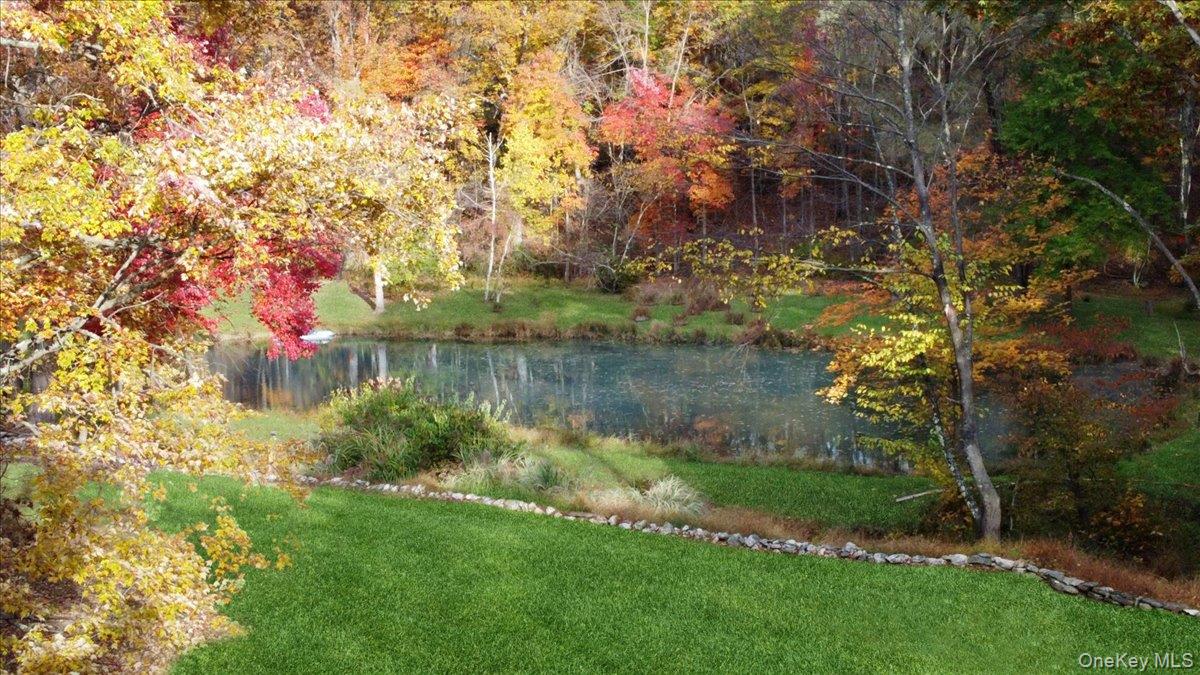 Dream location. . . complete seclusion, yet perfectly central. Tucked away on 6. 7 pristine, private acres, this extraordinary home is a nature-lover’s sanctuary: a 130-foot stocked pond, an all-season babbling brook, and miles of serene forested views create a peaceful backdrop for everyday living and effortless entertaining. Architectural character and warmth define the interior. Soaring knotty-pine ceilings, exposed beams, and rich, beautifully finished hardwoods flow throughout, while walls of windows invite the outdoors in at every turn. Intricate woodwork, built-ins, and custom details combine with an open, airy floor plan to create spaces that feel both grand and intimately welcoming. The eat-in kitchen is a chef’s delight w soft maple cabinetry, elegant Corian counters, a vaulted ceiling opening to the second floor, SS appliances, and a built-in pantry. A gracious open-concept formal DR and LR flow to expansive decking overlooking the pond and grounds. . ideal for morning coffee, sunset cocktails, or al fresco dining. The welcoming family room is a cozy retreat with a wood-burning fireplace and supplemental woodstove, warm bay windows framing the landscape, and abundant space for lounging, reading, or movie nights. A convenient first-floor bedroom and full bath provide flexibility for guests, multigenerational living, or a home office. Upstairs, the private primary ensuite is an impressive haven: a tranquil bedroom with a private balcony that overlooks the pond, shaded by a majestic 100-year-old elephant ear tree. Striking sliding French doors reveal a split spa bath. An equally stunning second bedroom showcases exposed beams and dramatic transom window accents. Recent improvements enhance the property’s beauty and peace of mind: a brand-new roof and updated Andersen windows ensure energy efficiency and durability. Oversized two car garage, workshop, and partially finished walk-out basement. The grounds are a masterpiece of natural and intentional landscaping. . . mature trees, natural rock walls, and tasteful hardscaping create intimate outdoor rooms, meandering paths, and private vantage points across the acreage. The pond is stocked and accessible, offering opportunities for quiet fishing, reflective mornings, or wildlife observation. The brook’s gentle soundtrack changes with the seasons, ensuring year-round enjoyment. Location is exceptional: situated within the highly sought-after Millbrook school district, the home is centrally placed for commuting, shopping, dining, and outdoor recreation. Whether you’re seeking a forever home, a weekend escape, or a property with strong rental potential, this rare offering delivers a unique combination of architectural charm, modern conveniences, and a spectacular natural setting. Don’t miss this once-in-a-lifetime opportunity to own a secluded estate that feels like a perpetual vacation—stunning interiors, remarkable outdoor amenities, and a peaceful pondside panorama.