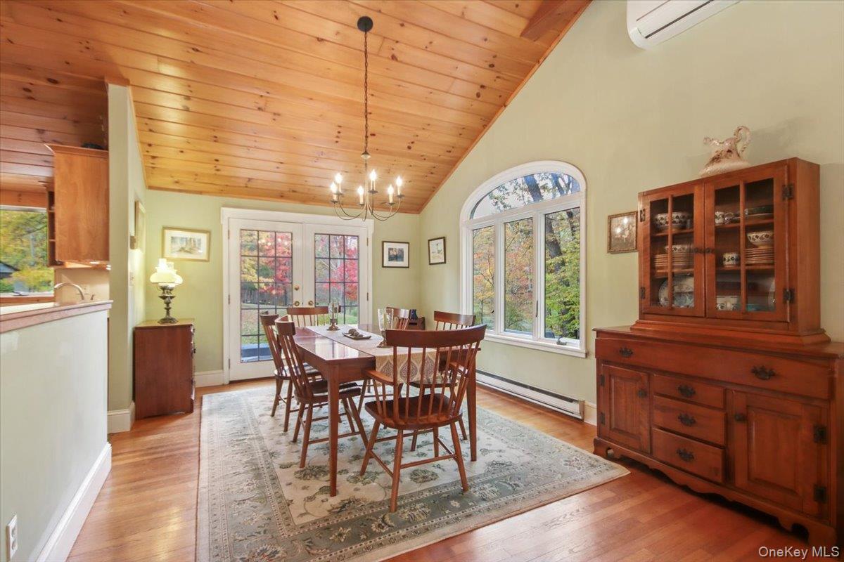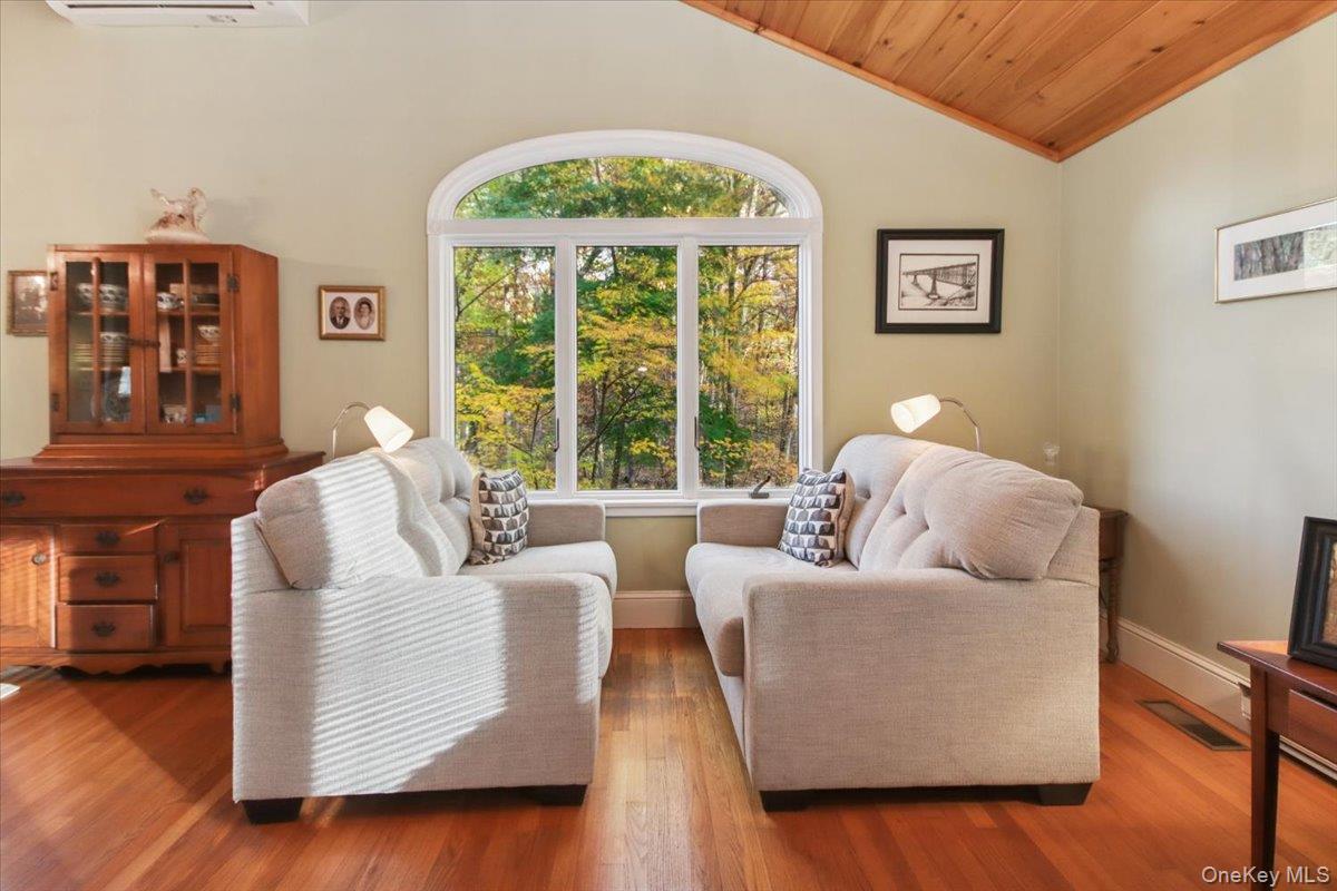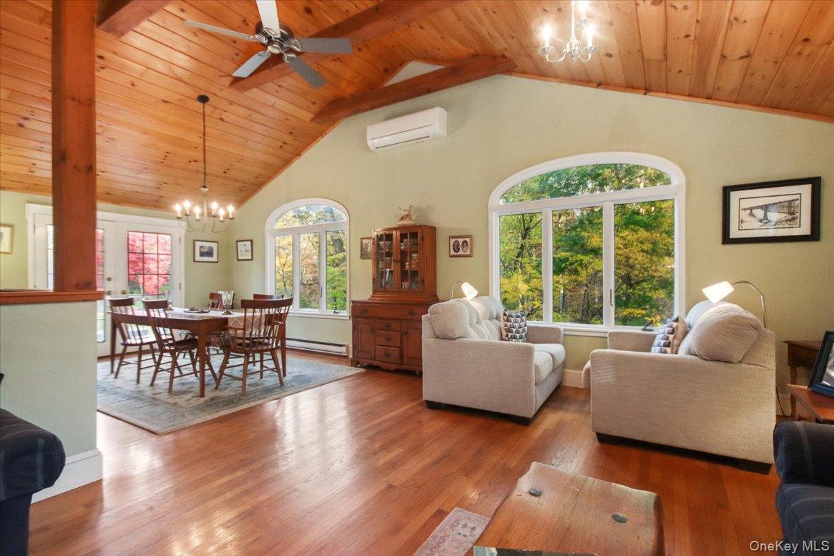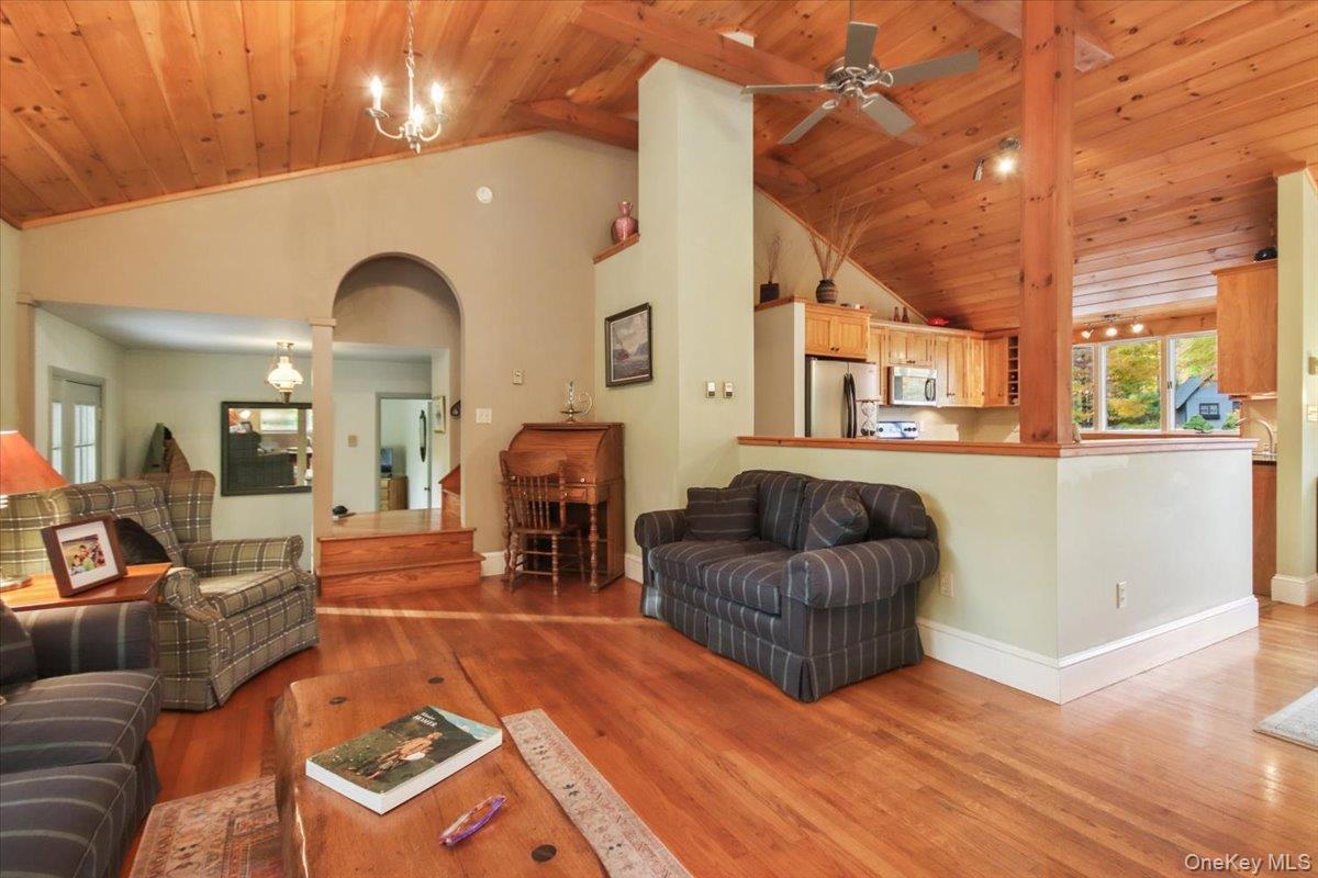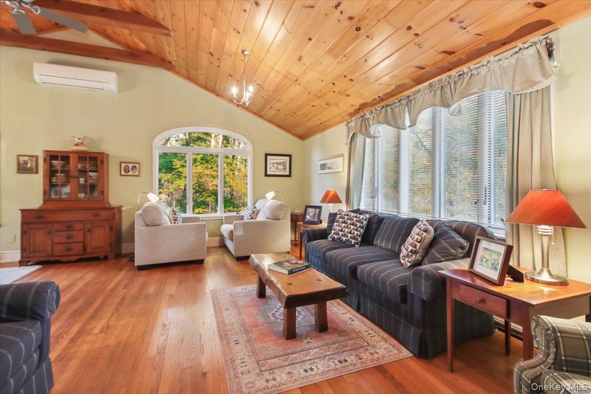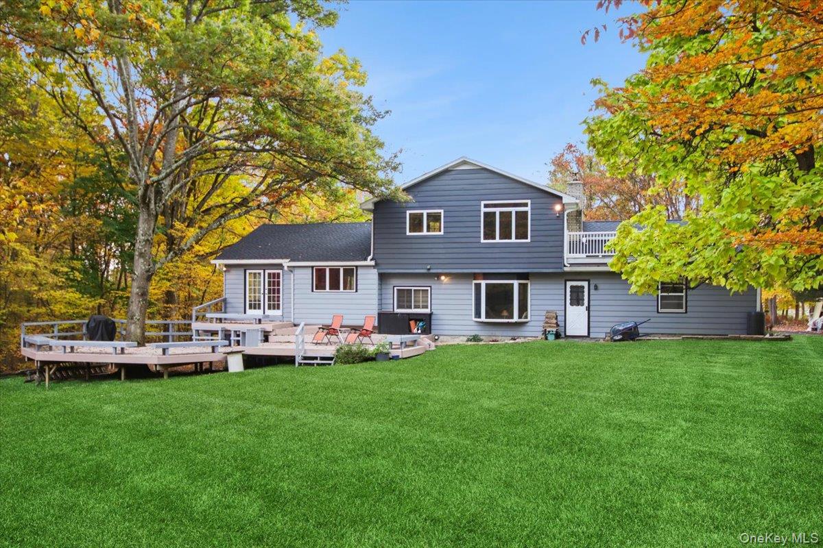 Dream location. . . complete seclusion, yet perfectly central. Tucked away on 6. 7 pristine, private acres, this extraordinary home is a nature-lover’s sanctuary: a 130-foot stocked pond, an all-season babbling brook, and miles of serene forested views create a peaceful backdrop for everyday living and effortless entertaining. Architectural character and warmth define the interior. Soaring knotty-pine ceilings, exposed beams, and rich, beautifully finished hardwoods flow throughout, while walls of windows invite the outdoors in at every turn. Intricate woodwork, built-ins, and custom details combine with an open, airy floor plan to create spaces that feel both grand and intimately welcoming. The eat-in kitchen is a chef’s delight w soft maple cabinetry, elegant Corian counters, a vaulted ceiling opening to the second floor, SS appliances, and a built-in pantry. A gracious open-concept formal DR and LR flow to expansive decking overlooking the pond and grounds. . ideal for morning coffee, sunset cocktails, or al fresco dining. The welcoming family room is a cozy retreat with a wood-burning fireplace and supplemental woodstove, warm bay windows framing the landscape, and abundant space for lounging, reading, or movie nights. A convenient first-floor bedroom and full bath provide flexibility for guests, multigenerational living, or a home office. Upstairs, the private primary ensuite is an impressive haven: a tranquil bedroom with a private balcony that overlooks the pond, shaded by a majestic 100-year-old elephant ear tree. Striking sliding French doors reveal a split spa bath. An equally stunning second bedroom showcases exposed beams and dramatic transom window accents. Recent improvements enhance the property’s beauty and peace of mind: a brand-new roof and updated Andersen windows ensure energy efficiency and durability. Oversized two car garage, workshop, and partially finished walk-out basement. The grounds are a masterpiece of natural and intentional landscaping. . . mature trees, natural rock walls, and tasteful hardscaping create intimate outdoor rooms, meandering paths, and private vantage points across the acreage. The pond is stocked and accessible, offering opportunities for quiet fishing, reflective mornings, or wildlife observation. The brook’s gentle soundtrack changes with the seasons, ensuring year-round enjoyment. Location is exceptional: situated within the highly sought-after Millbrook school district, the home is centrally placed for commuting, shopping, dining, and outdoor recreation. Whether you’re seeking a forever home, a weekend escape, or a property with strong rental potential, this rare offering delivers a unique combination of architectural charm, modern conveniences, and a spectacular natural setting. Don’t miss this once-in-a-lifetime opportunity to own a secluded estate that feels like a perpetual vacation—stunning interiors, remarkable outdoor amenities, and a peaceful pondside panorama.