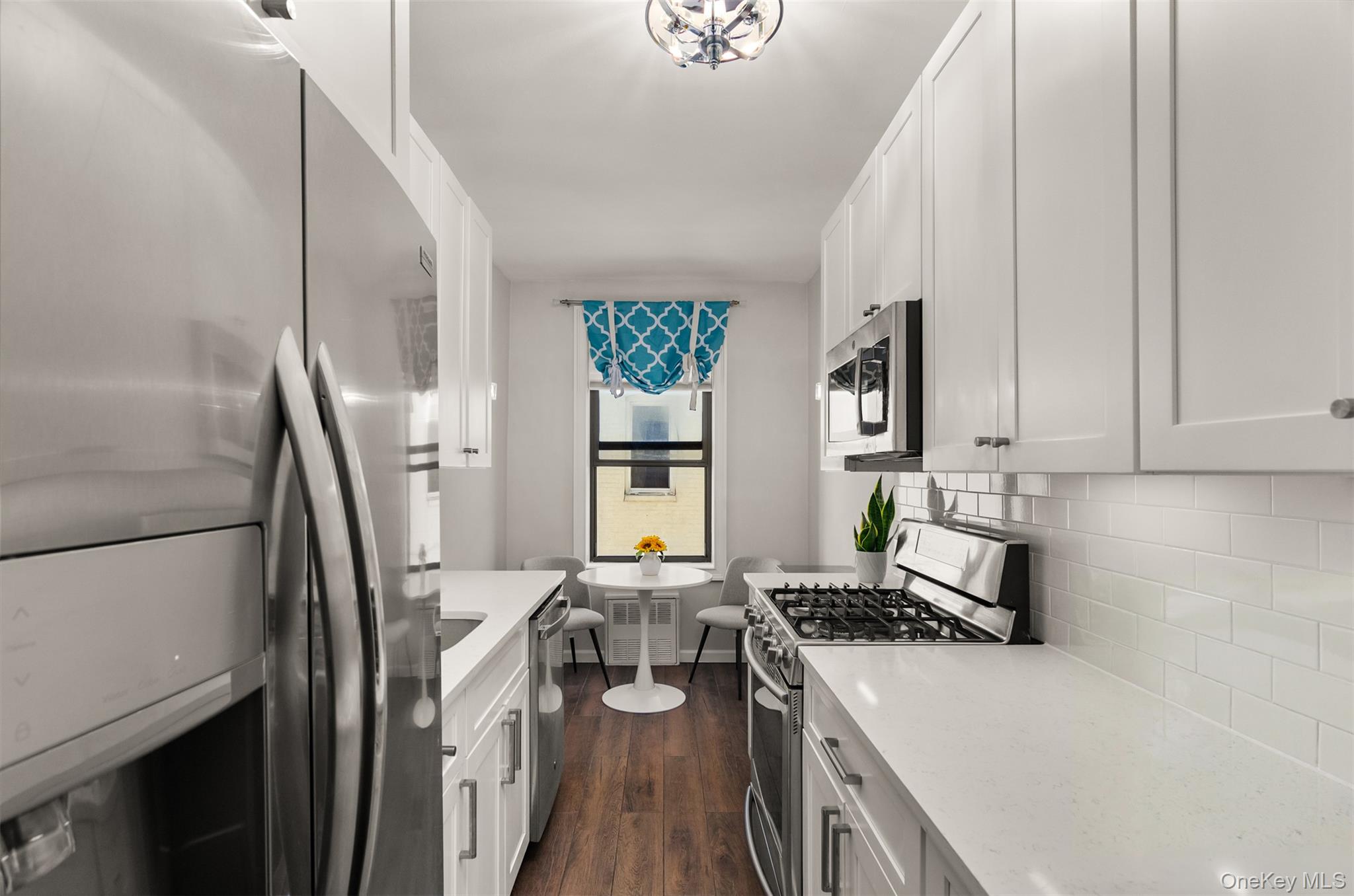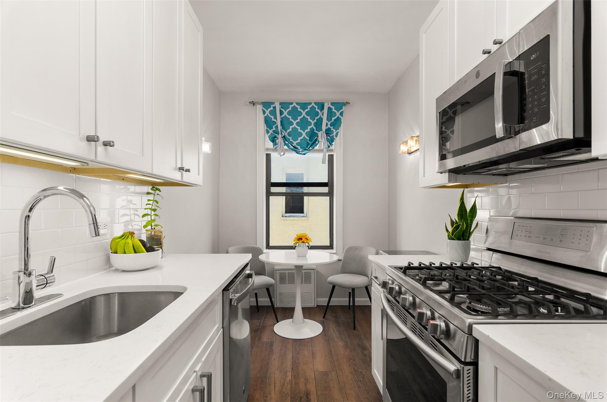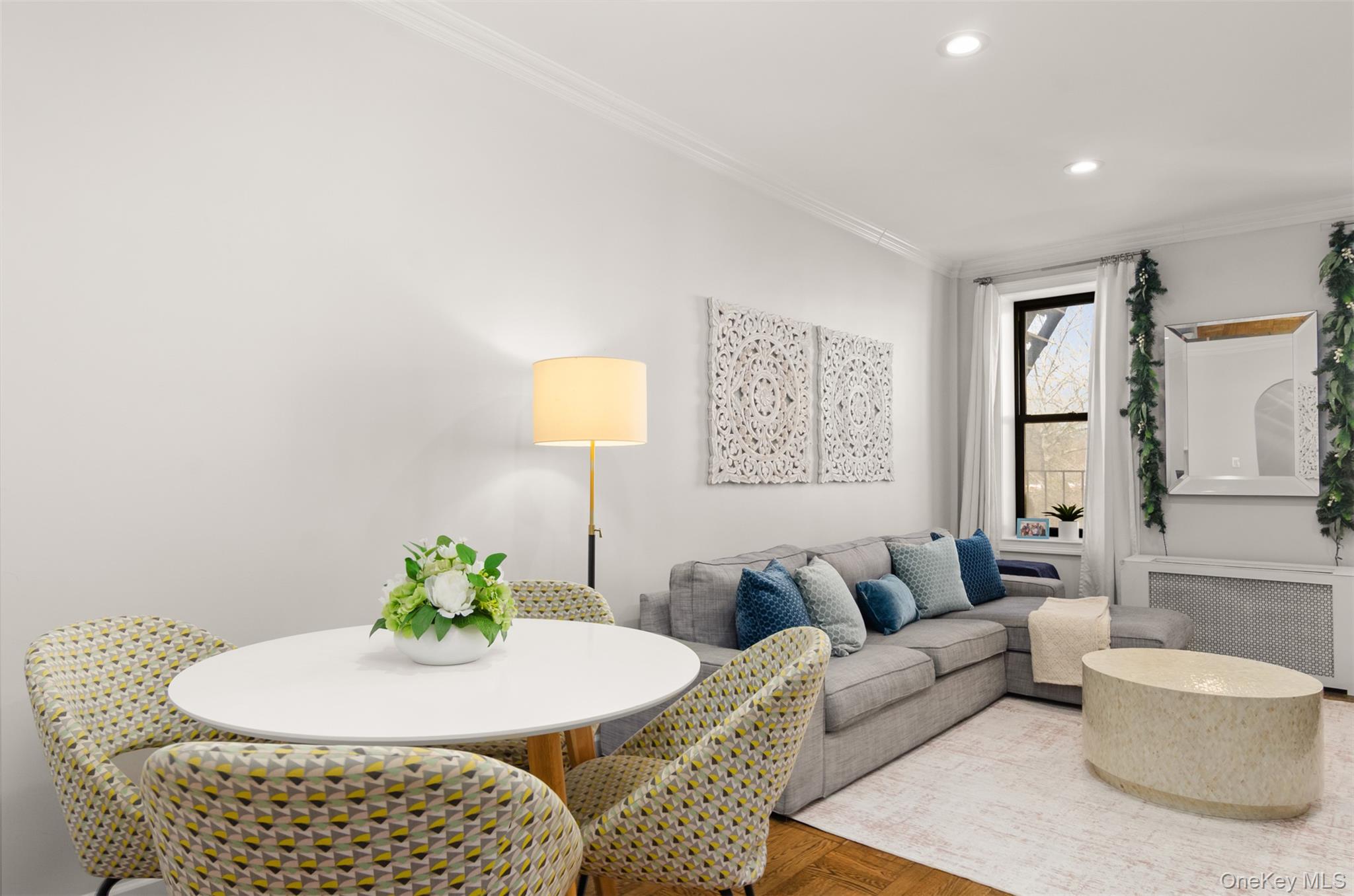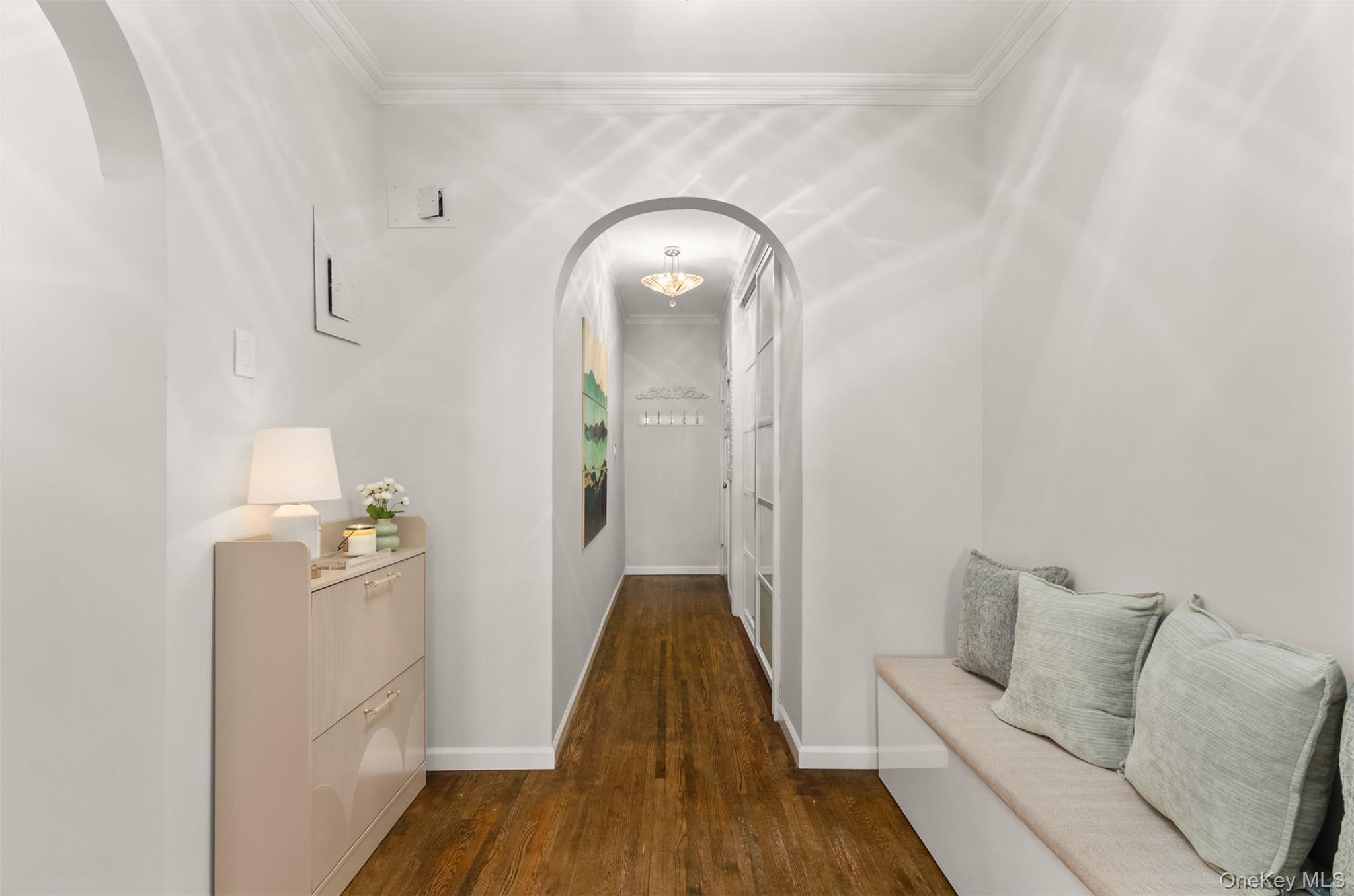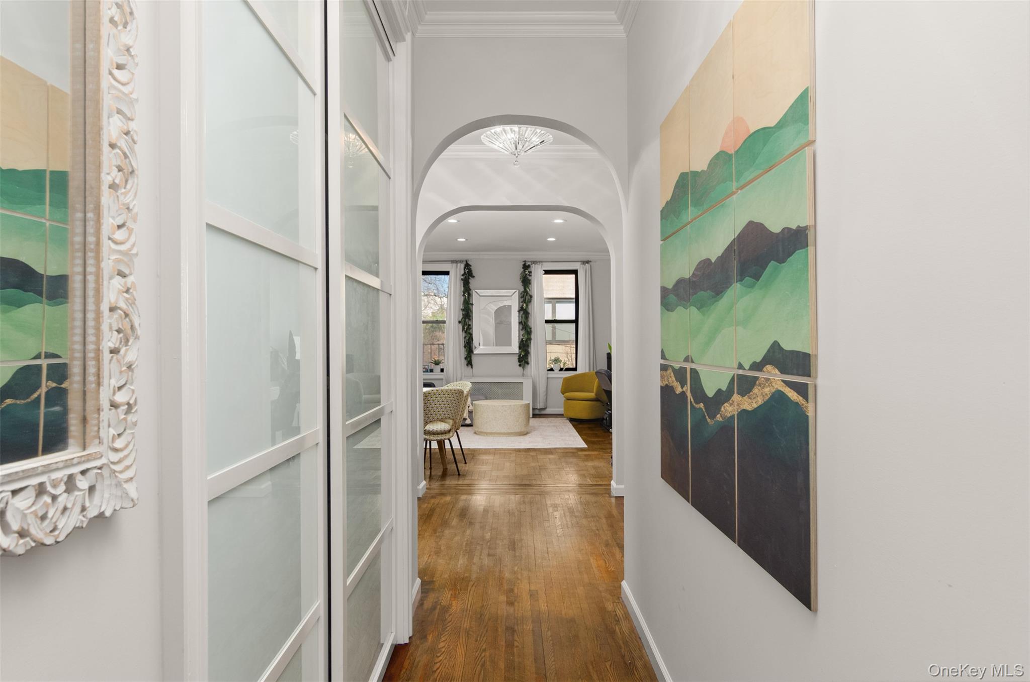Spacious Corner One-Bedroom in Prime Bay Ridge with Low Maintenance This bright and expansive pre-war corner residence offers an exceptional combination of space, light, and value in the heart of Bay Ridge. Situated on the second floor and spanning approximately 900 square feet, the home enjoys abundant natural light from northern and eastern exposures, creating a warm and inviting atmosphere throughout. The well-proportioned layout is ideal for both everyday living and entertaining, featuring a generously sized living room, a defined dining area, and a large foyer that can easily function as a home office or additional seating space. The newly renovated kitchen is thoughtfully designed with contemporary white shaker cabinetry with LED under-lighting, custom white Quartz countertops, white subway-tiles and stainless-steel appliances including a dishwasher, seamlessly connecting to the living area while maintaining functionality and flow. The oversized bedroom offers excellent flexibility, comfortably accommodating a king-sized bed along with additional furniture, and is complemented by multiple closets with custom shelving/ built-ins. A windowed bathroom provides both light and ventilation, while classic pre-war details-including high ceilings, hardwood and parquet floors, and original archways-add timeless character throughout. Located in a well-maintained and charming Pre-War, elevator co-op, the building features a live-in superintendent, laundry facilities, bike storage, additional storage, and a large, fully equipped state-of-the-art gym. The exceptionally low monthly maintenance adds to the overall appeal. Perfectly positioned near Shore Road Promenade, the Narrows Botanical Gardens, and waterfront parks, this home offers easy access to scenic walking, running and biking paths along New York Harbor and the Verrazano Bridge Waterfront. Transportation options are excellent, with the Bay Ridge NYC Ferry Pier, X27 and X37 express and B9 and B64 local buses, the 77th Street R train and Citi Bike stations all nearby, providing convenient access to Manhattan and beyond. The neighborhood also offers a vibrant mix of local cafés, shops, gourmet grocers and Michelin Guide rated restaurants including Tanoreen, Yemenat, East Harbor Seafood Palace, Chuan Tian Xia and many more.