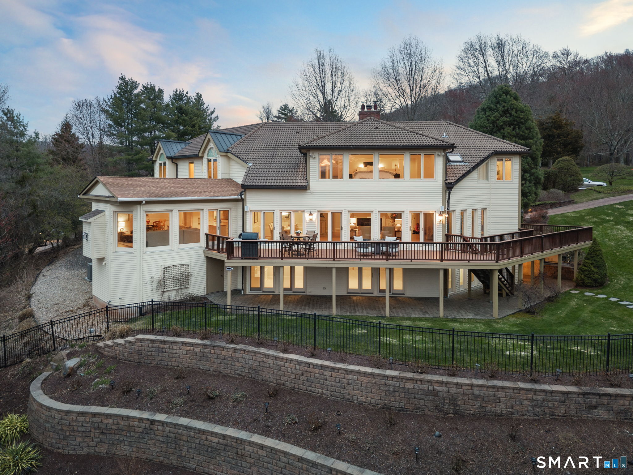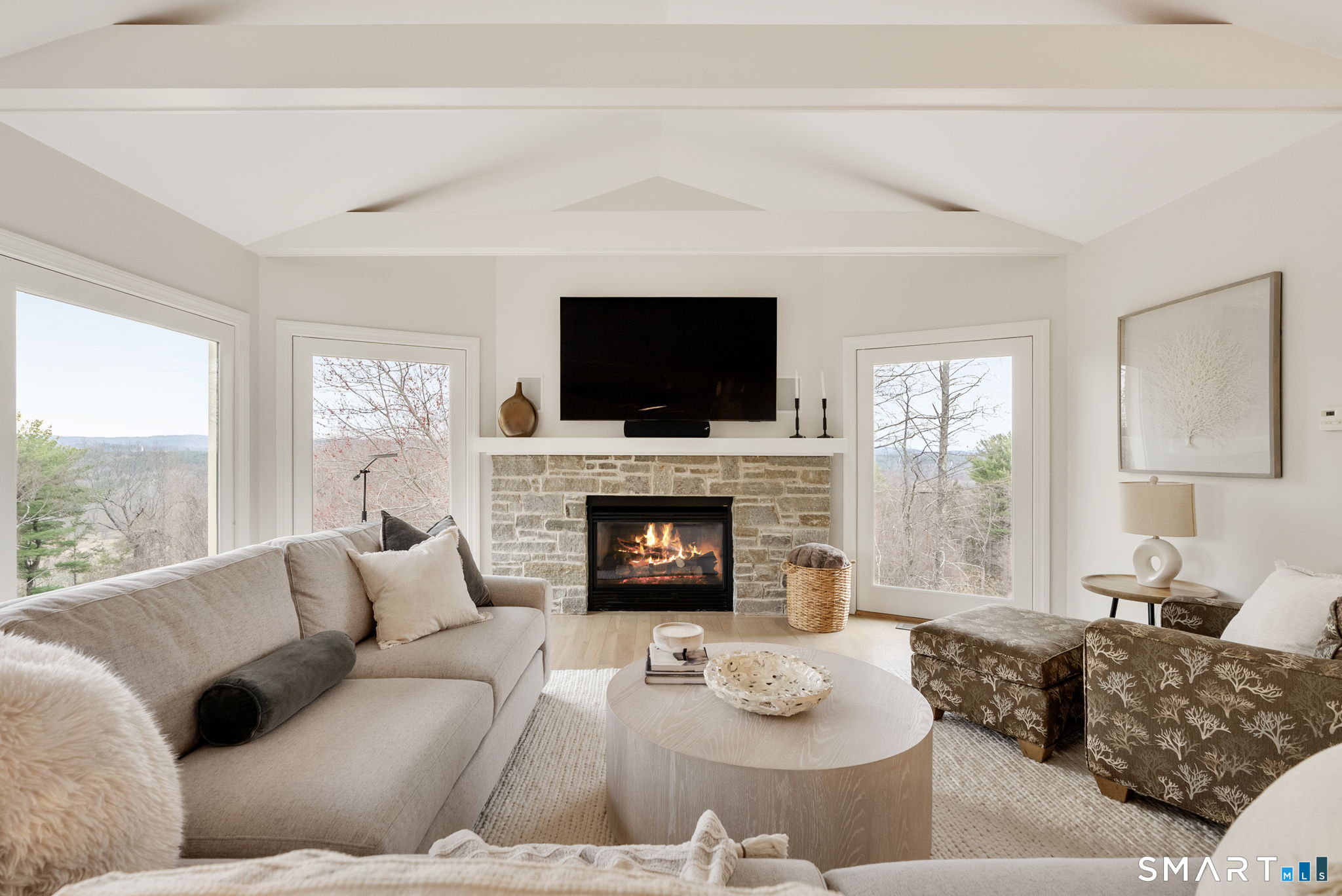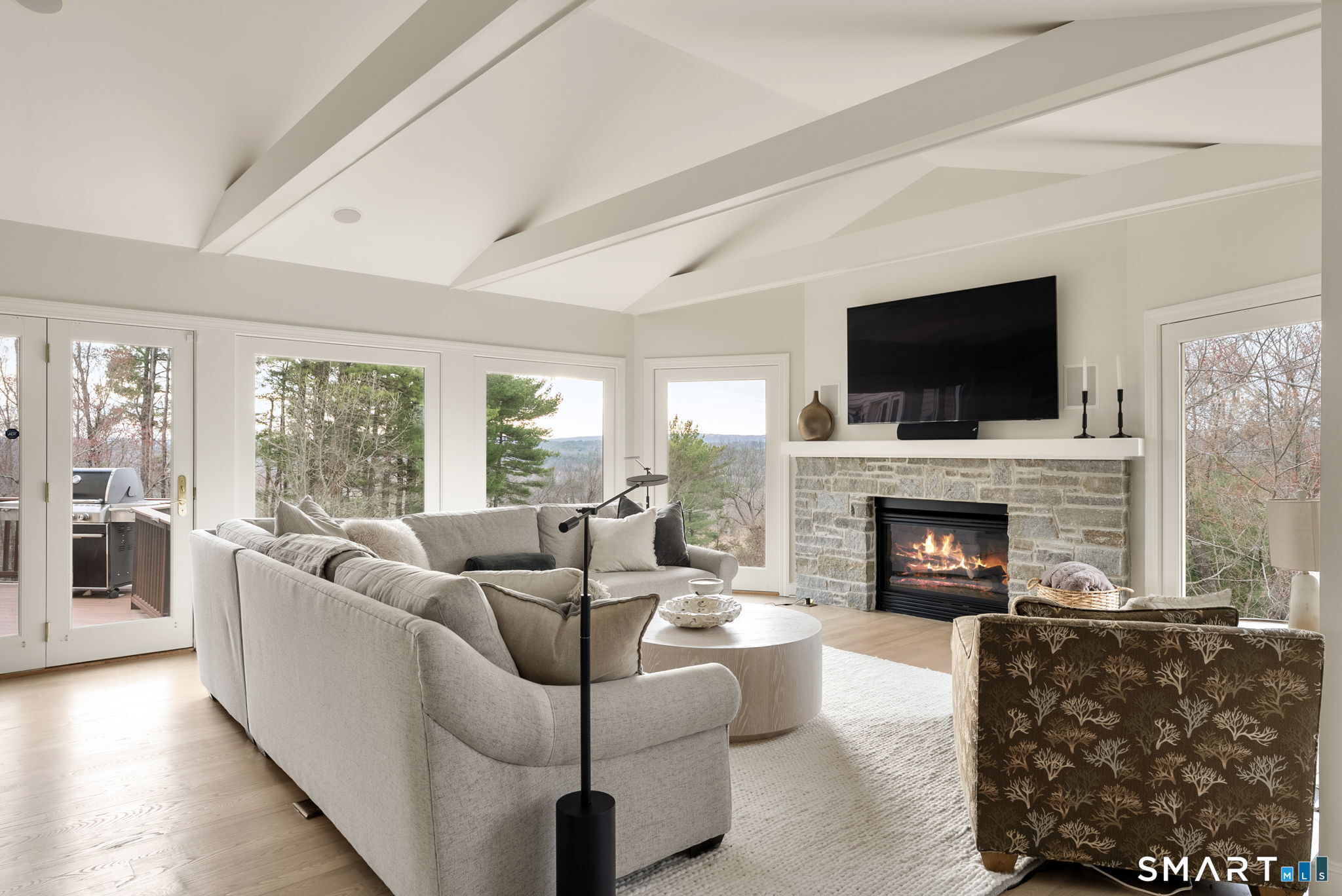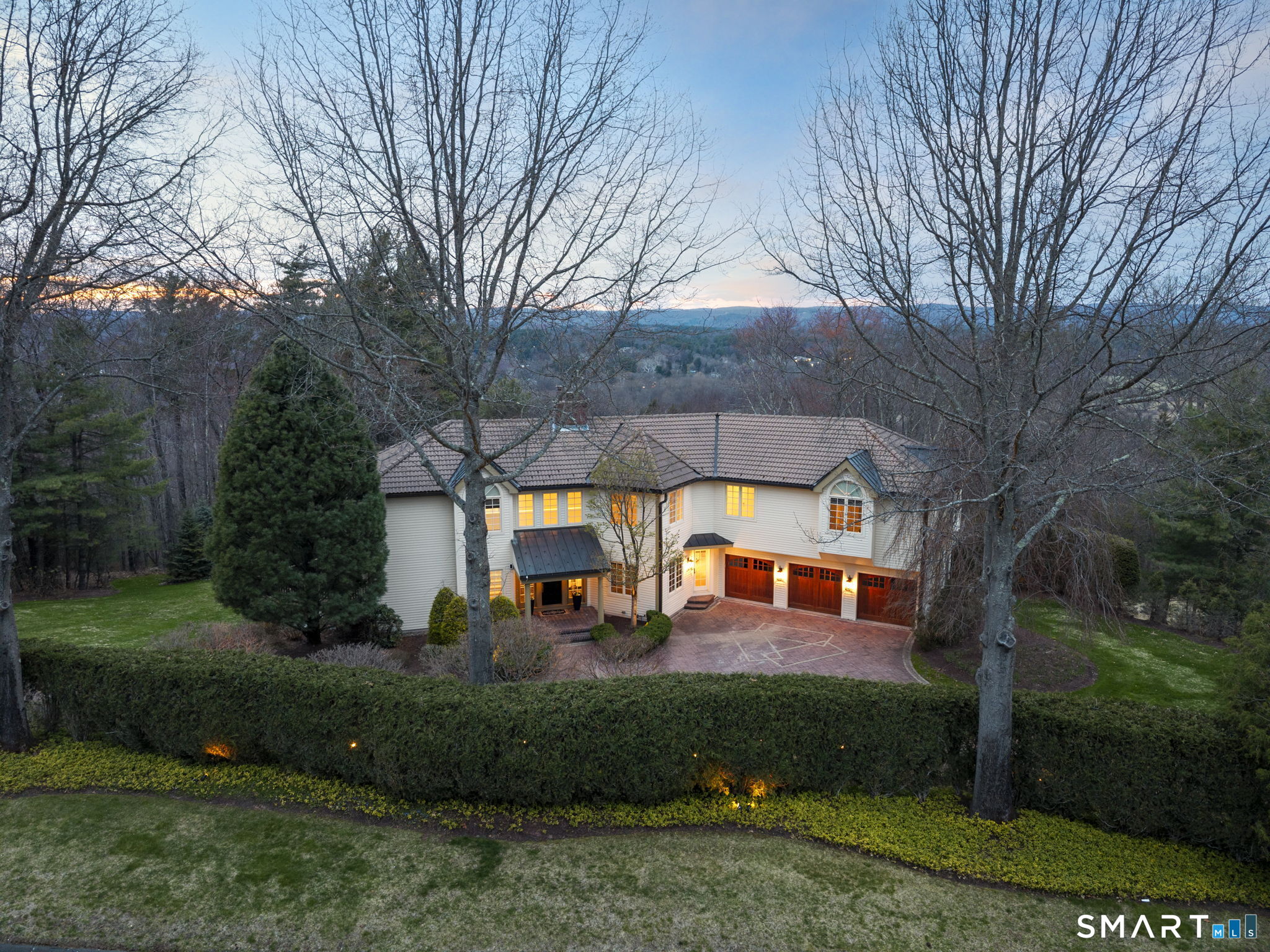 Stately yet inviting, this beautiful Colonial is set along one of Simsbury's most picturesque streets, offering manicured grounds, timeless architecture, and sweeping views. An elegant paver driveway, lush landscaping, and a striking mix of rooflines with metal and tile accents create a memorable first impression. A welcoming foyer with detailed tilework opens to expansive, light-filled living spaces. The living room features a fireplace, ceiling beams, and oversized windows, while nearly every room captures the surrounding views an ever-present backdrop that defines the home. The kitchen is both refined and functional, featuring Gaggenau and Thermador appliances, granite countertops, a large island with sink, pot filler, walk-in pantry, and a coffee bar. It opens to the family room with a gas fireplace, vaulted ceilings, and a dramatic wall of windows and an adjacent casual dining area. The formal dining room leads to a wraparound deck overlooking the property. The office has floor-to-ceiling built-ins with direct outdoor access. Upstairs, the primary suite offers a raised sleeping area with beautiful views, a cozy sitting area with a fireplace, and a spa-like bath. Secondary bedrooms are spacious with ample storage, plus two updated baths and a convenient laundry area. The lower level includes a 5th bedroom/office, fireplace, full bath, patio access, and storage. Outside, enjoy a multi-tiered yard with magnificent views, pool, and hot tub-perfect for relaxing and gathering. .