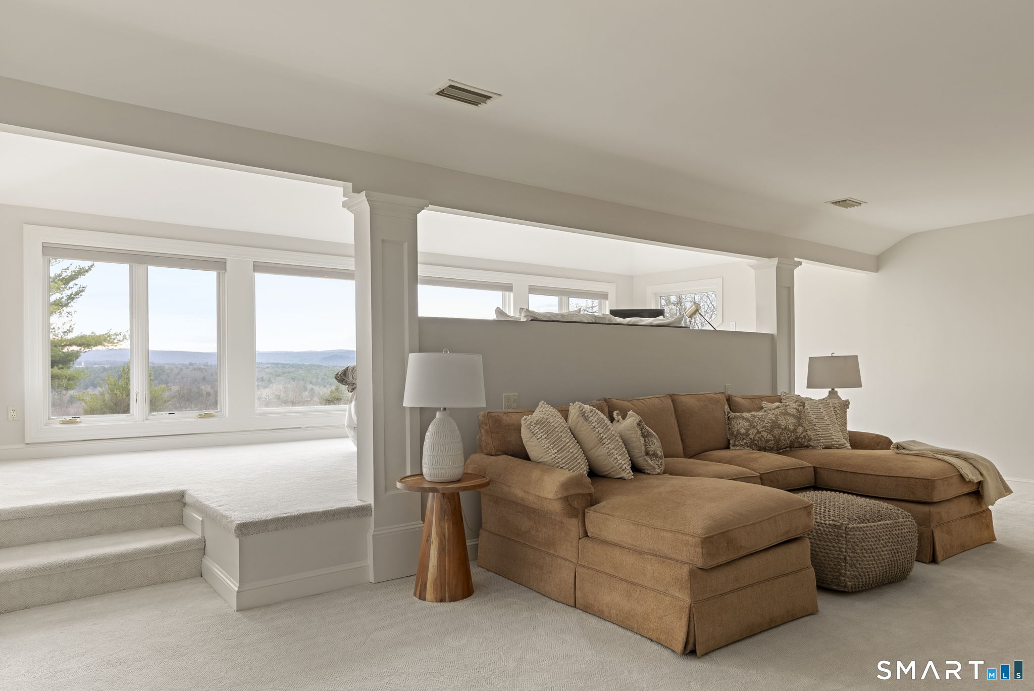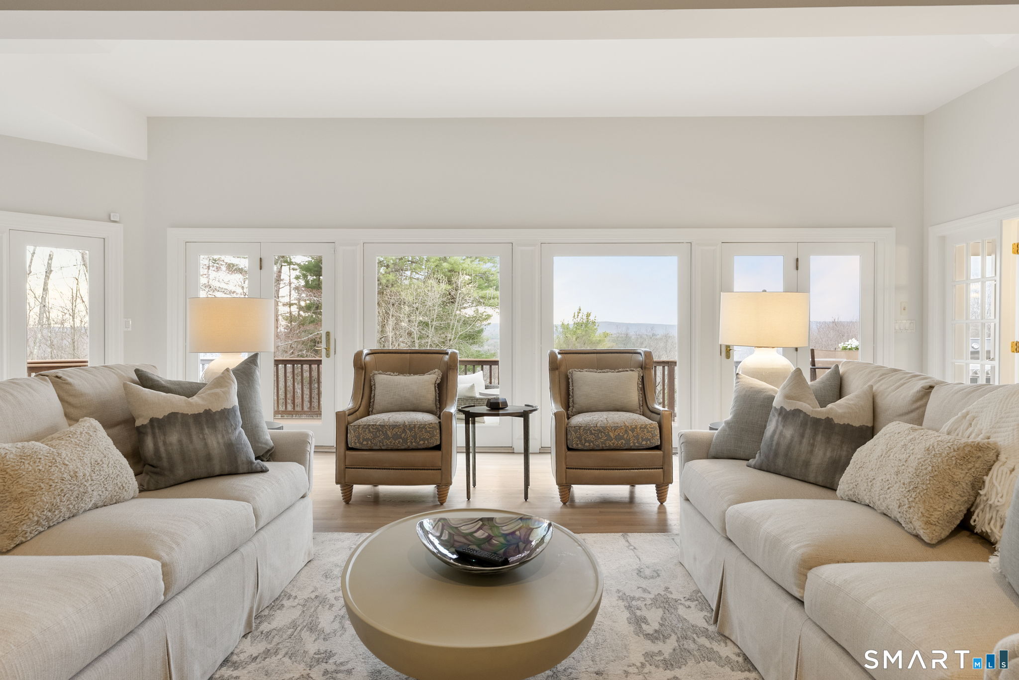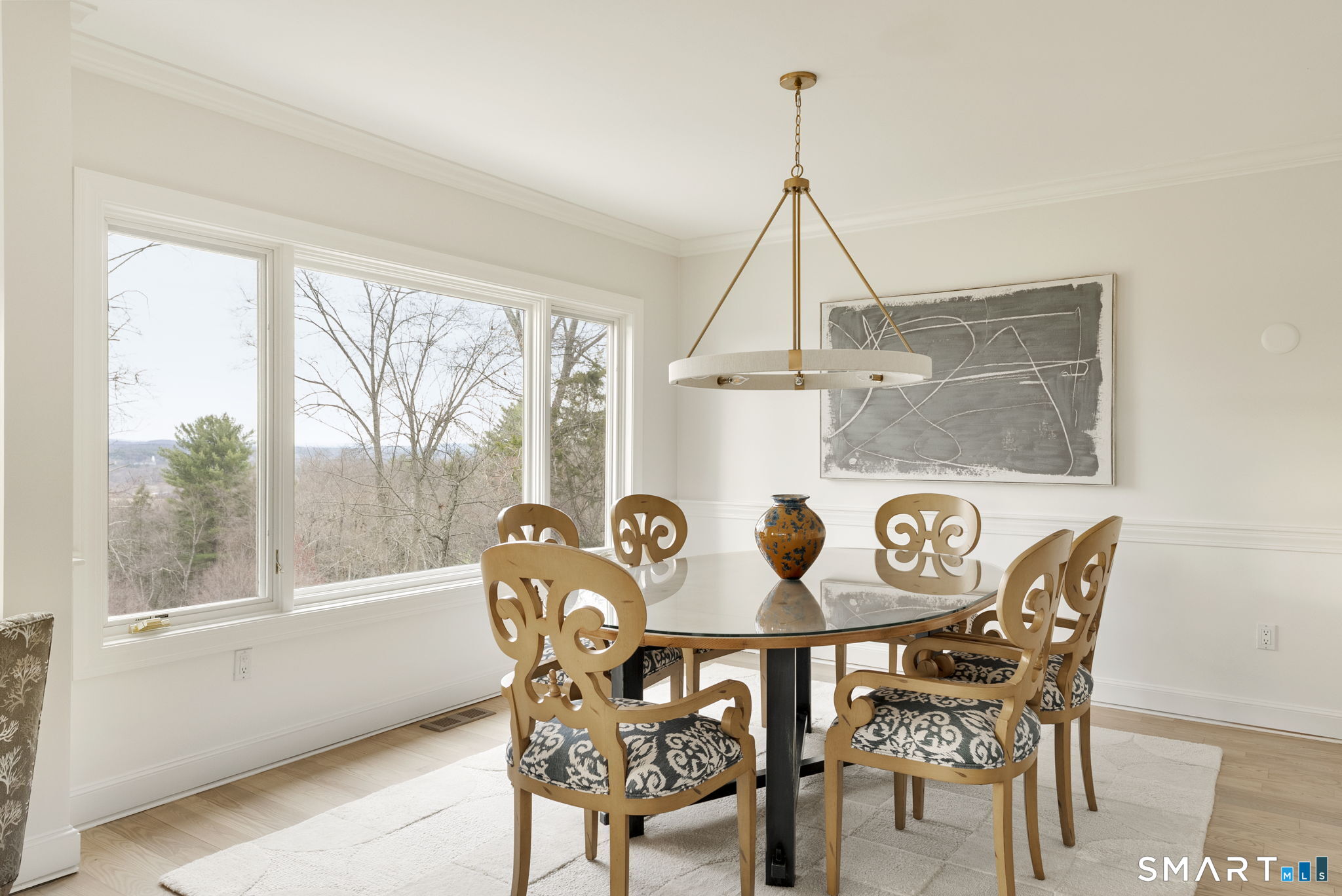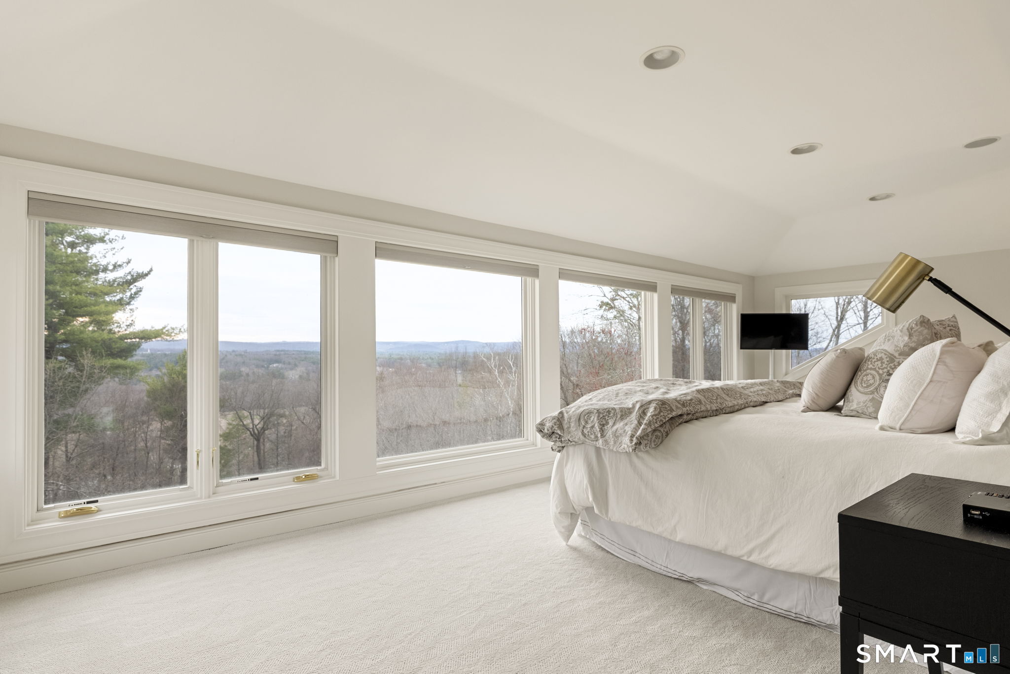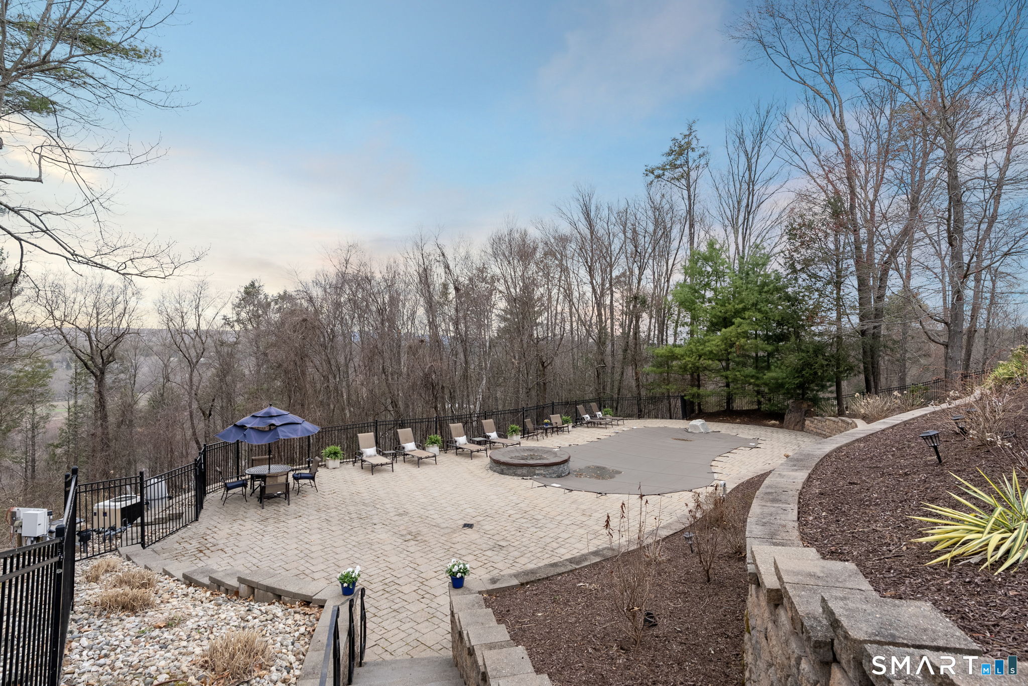Stately yet inviting, this beautiful Colonial is set along one of Simsbury's most picturesque streets, offering manicured grounds, timeless architecture, and sweeping views. An elegant paver driveway, lush landscaping, and a striking mix of rooflines with metal and tile accents create a memorable first impression. A welcoming foyer with detailed tilework opens to expansive, light-filled living spaces. The living room features a fireplace, ceiling beams, and oversized windows, while nearly every room captures the surrounding views an ever-present backdrop that defines the home. The kitchen is both refined and functional, featuring Gaggenau and Thermador appliances, granite countertops, a large island with sink, pot filler, walk-in pantry, and a coffee bar. It opens to the family room with a gas fireplace, vaulted ceilings, and a dramatic wall of windows and an adjacent casual dining area. The formal dining room leads to a wraparound deck overlooking the property. The office has floor-to-ceiling built-ins with direct outdoor access. Upstairs, the primary suite offers a raised sleeping area with beautiful views, a cozy sitting area with a fireplace, and a spa-like bath. Secondary bedrooms are spacious with ample storage, plus two updated baths and a convenient laundry area. The lower level includes a 5th bedroom/office, fireplace, full bath, patio access, and storage. Outside, enjoy a multi-tiered yard with magnificent views, pool, and hot tub-perfect for relaxing and gathering. .
