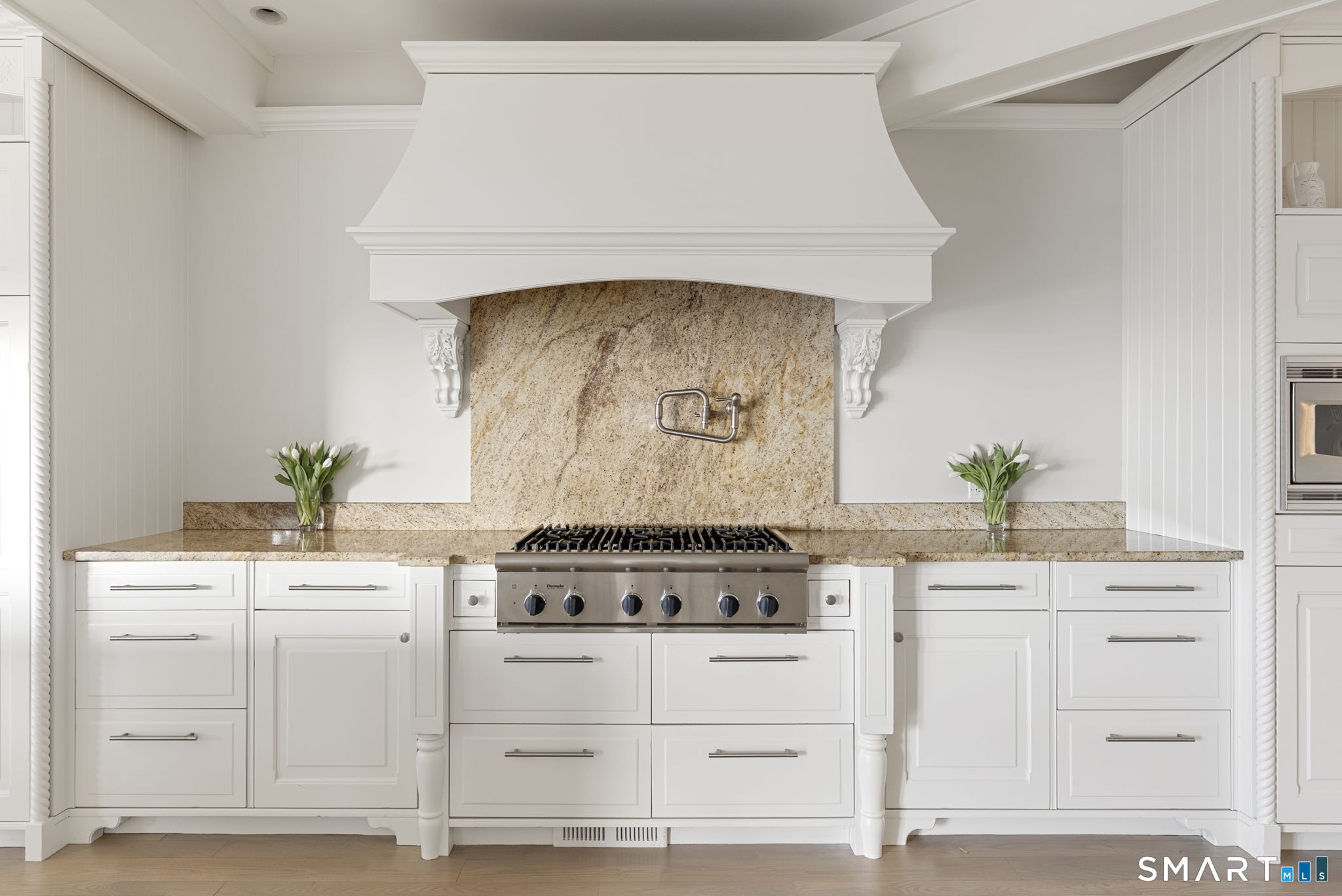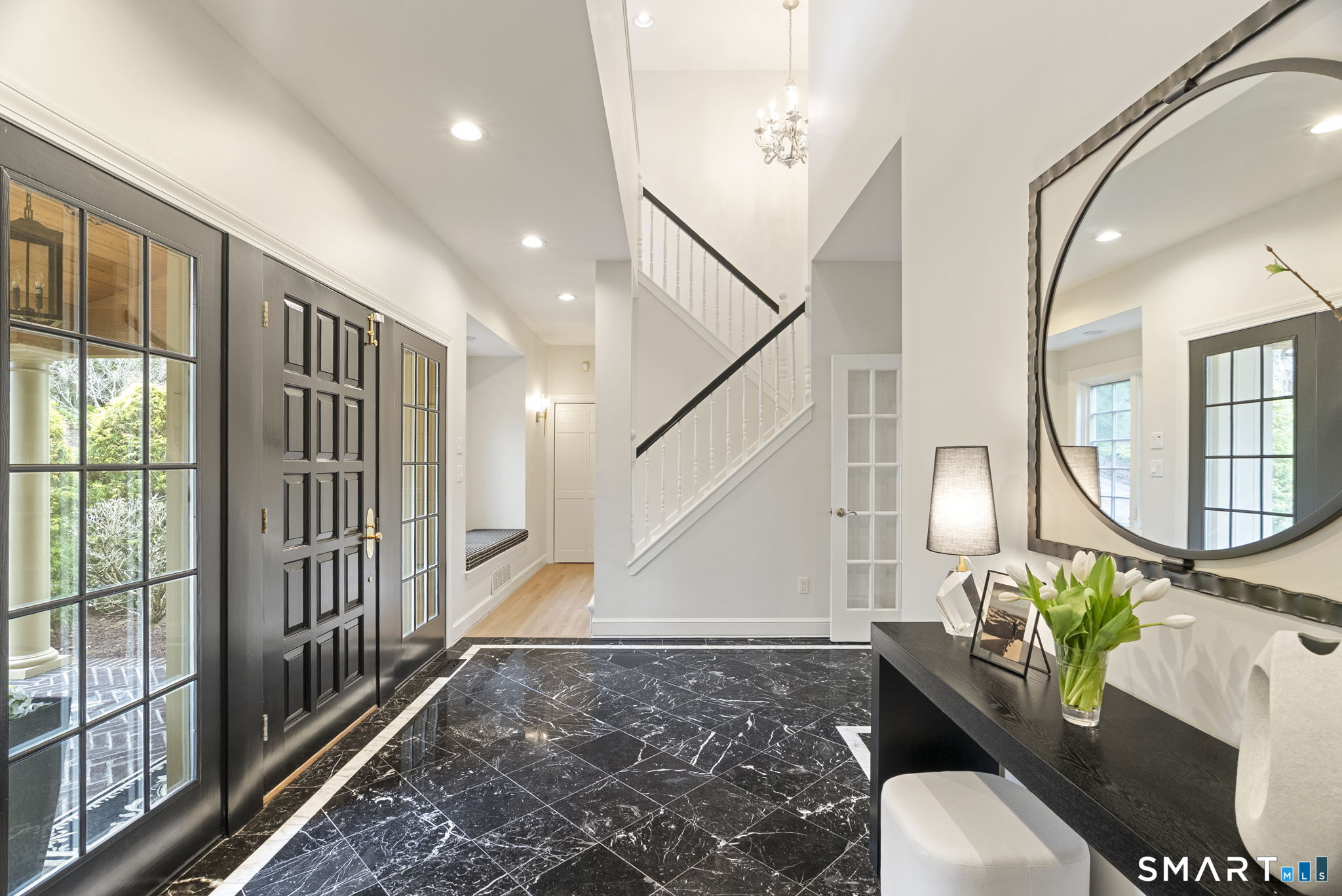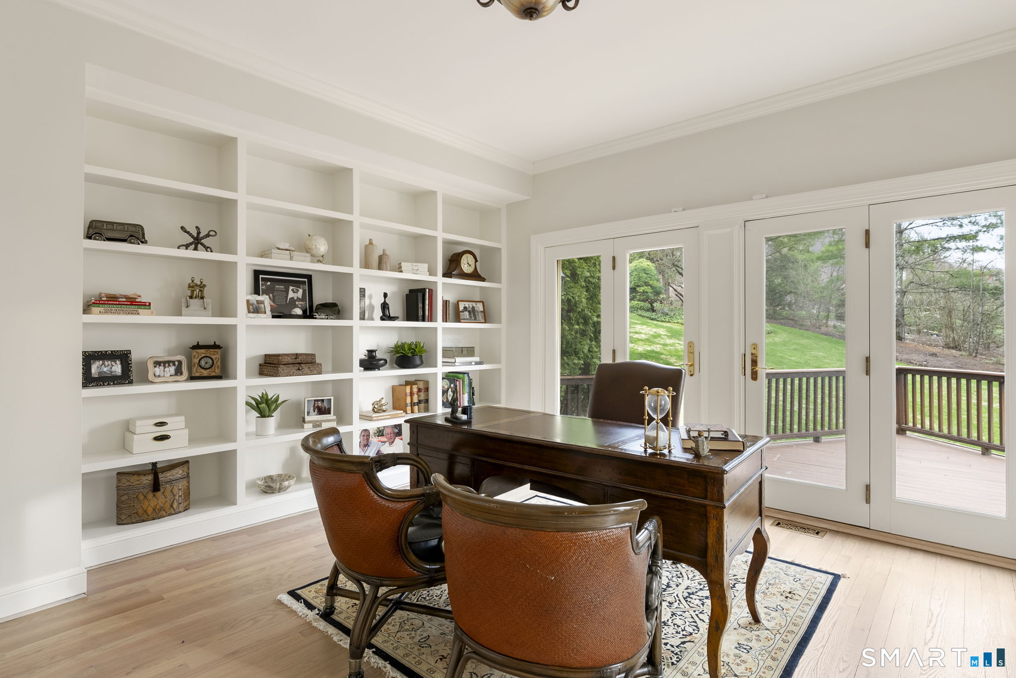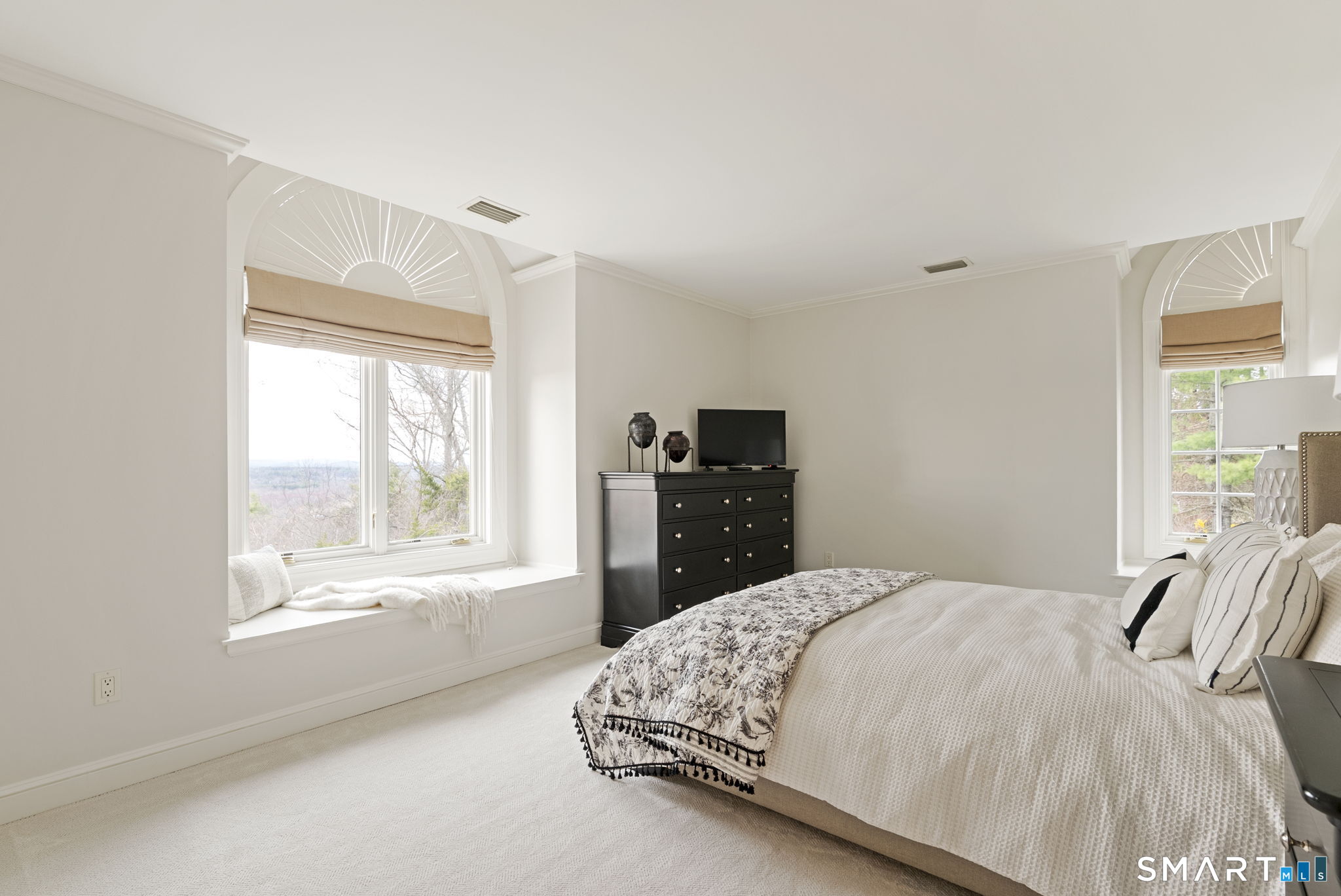 Stately yet inviting, this beautiful Colonial is set along one of Simsbury's most picturesque streets, offering manicured grounds, timeless architecture, and sweeping views. An elegant paver driveway, lush landscaping, and a striking mix of rooflines with metal and tile accents create a memorable first impression. A welcoming foyer with detailed tilework opens to expansive, light-filled living spaces. The living room features a fireplace, ceiling beams, and oversized windows, while nearly every room captures the surrounding views an ever-present backdrop that defines the home. The kitchen is both refined and functional, featuring Gaggenau and Thermador appliances, granite countertops, a large island with sink, pot filler, walk-in pantry, and a coffee bar. It opens to the family room with a gas fireplace, vaulted ceilings, and a dramatic wall of windows and an adjacent casual dining area. The formal dining room leads to a wraparound deck overlooking the property. The office has floor-to-ceiling built-ins with direct outdoor access. Upstairs, the primary suite offers a raised sleeping area with beautiful views, a cozy sitting area with a fireplace, and a spa-like bath. Secondary bedrooms are spacious with ample storage, plus two updated baths and a convenient laundry area. The lower level includes a 5th bedroom/office, fireplace, full bath, patio access, and storage. Outside, enjoy a multi-tiered yard with magnificent views, pool, and hot tub-perfect for relaxing and gathering. .