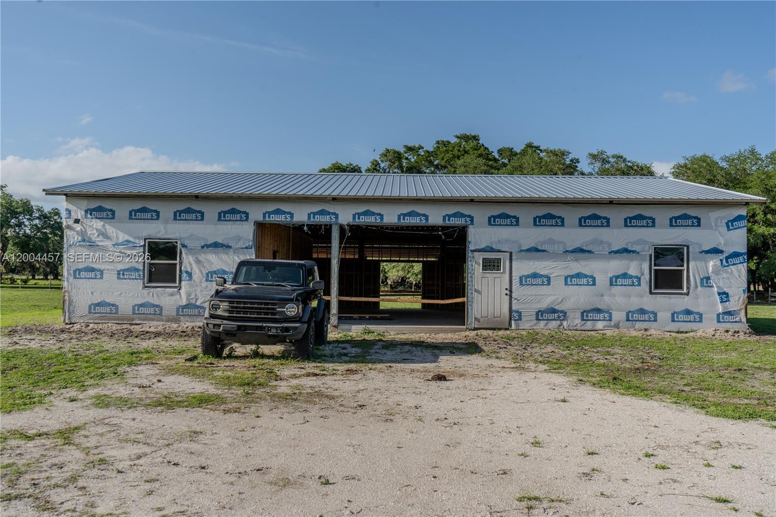 Originally started as a pole barn, the existing structure is constructed on an 8-inch slab, providing a strong foundation for future completion. The unfinished building already features a durable metal Galvalume roof and hurricane-impact windows. With county permitting, it can be finished to suit your needs as a custom home, BARNDOMINIUM, barn, or workshop.