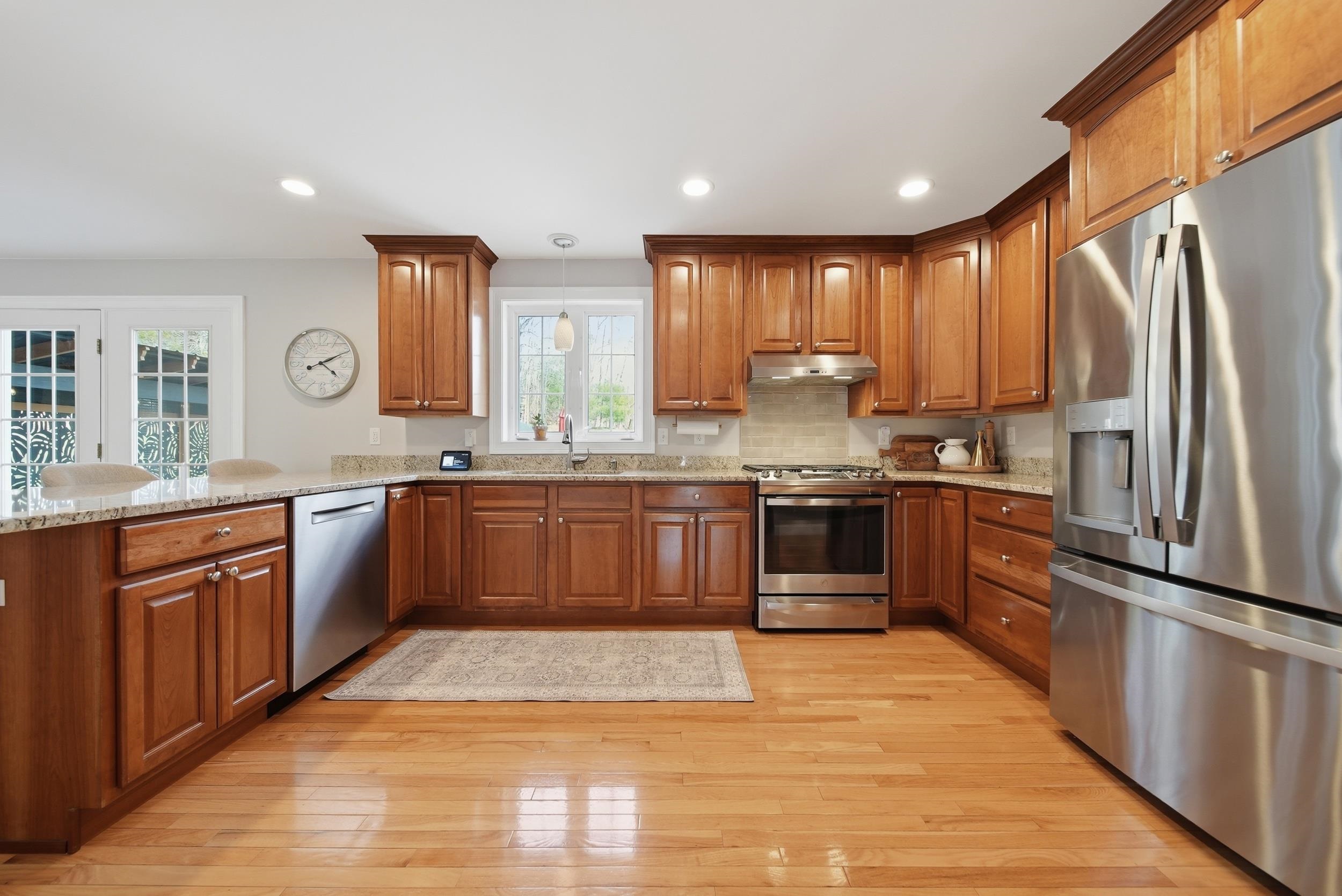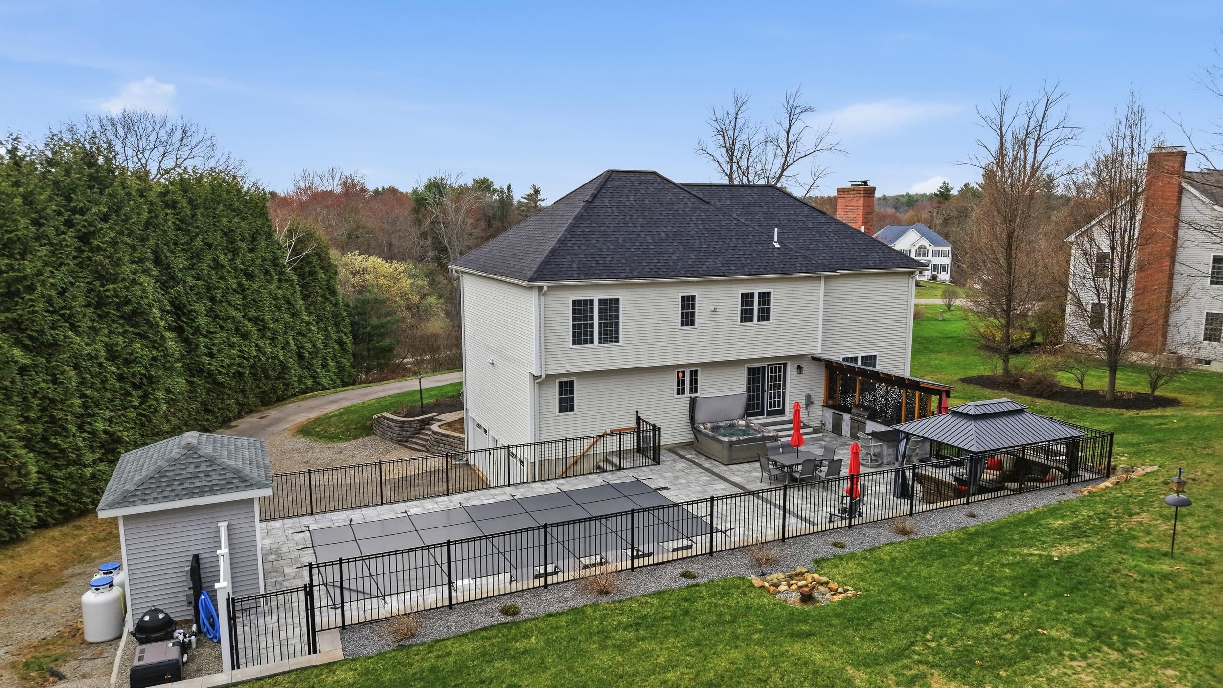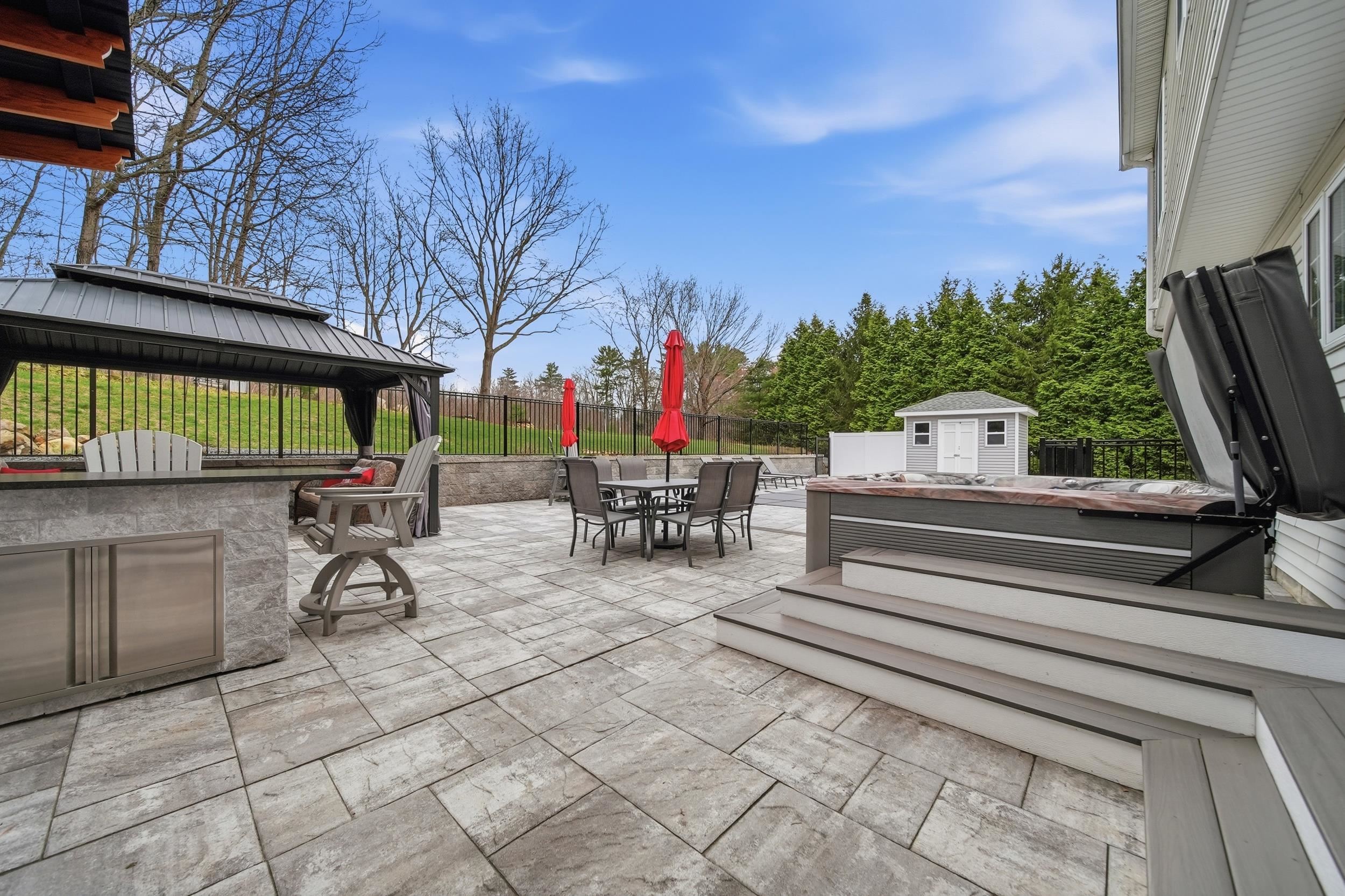 If you’ve been searching for the perfect home to entertain and unwind, 5 Zoe Lane delivers just in time for summer. This immaculate Colonial offers a true backyard oasis, complete with an in-ground heated pool, hot tub, and a stunning outdoor kitchen, ideal for hosting or simply relaxing in your own private retreat. Inside, the first floor features gleaming hardwood flooring and a beautifully appointed kitchen with granite countertops, tiled backsplash, stainless steel appliances, a breakfast bar, and a wine fridge. The kitchen flows seamlessly into a sunny breakfast nook and a spacious living room with a cozy gas fireplace. A formal dining room with detailed wainscoting adds charm for special gatherings, while a private office with French doors, a convenient half bath with laundry, and a slider leading to the backyard complete the main level. Upstairs, you’ll find four generously sized bedrooms, including a luxurious primary suite. This inviting space features a wood-burning fireplace with a stone surround, tray ceilings, two closets including a large walk-in and a dream en suite bath with a glass-enclosed tiled shower, soaking tub, double sinks, and quartz countertops. A walk-up attic provides abundant storage or potential for future expansion. Additional highlights include a full basement, two-car garage, on-demand hot water, and a new roof. And then there’s the backyard, truly the star of the show. Designed for both relaxation and entertainment, it boasts a beautifully crafted patio, custom covered outdoor kitchen with built-in gas grill and fridge, & gazebo. A shed offers convenient storage for pool equipment and toys, while the private setting invites you to enjoy gardening, birdwatching, evenings by the fire pit, and peaceful outdoor living all season long. The location is great for commuters, plenty of shopping, restaurants and more, all in a sub-division setting. This is more than a home, it’s a lifestyle.