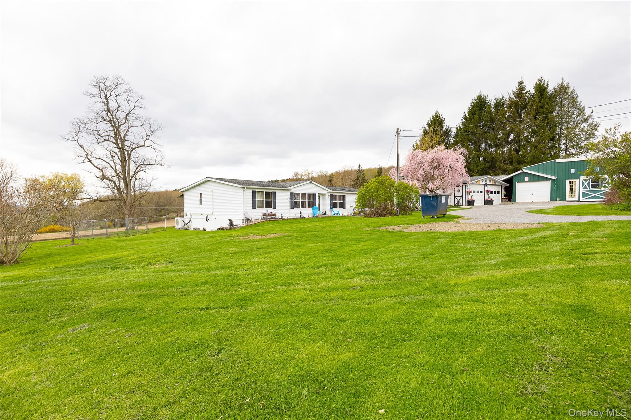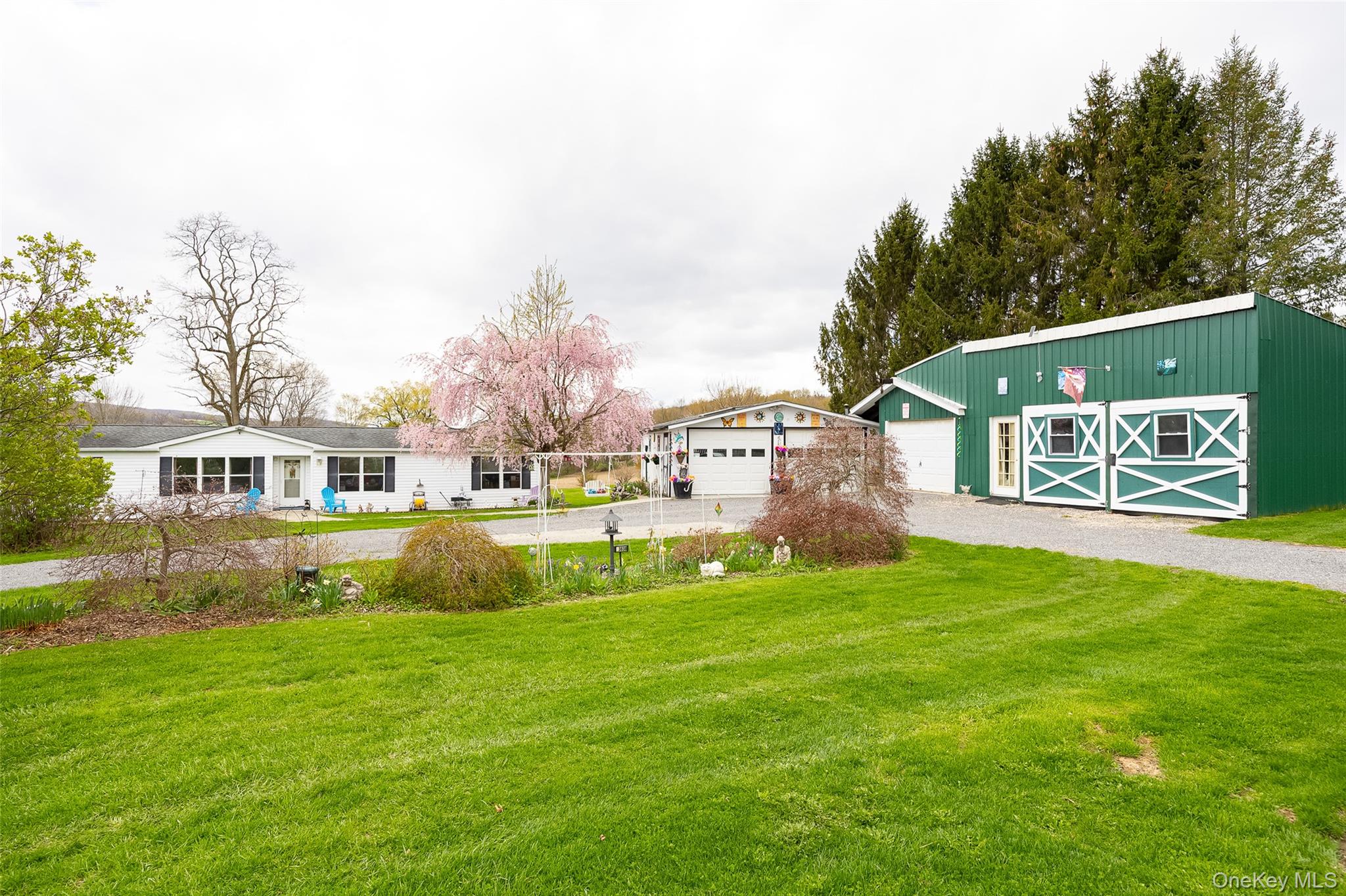 Sweet and solid, one level Ranch home on a bucolic setting with rolling hills and farmland framing your homestead. Walk into your open living room with built ins and lovely bay window. Through to the dining room and eat in kitchen, perfect for hosting with ease. Sliders to the back covered porch off the dining room allows for al fresco living and enjoying your coffee while watching the sunrise. Laundry room off the kitchen for convenience. Back off the living room is your primary suite, room for all your furniture and has a massive ensuite bathroom with soaking tub and shower, skylights bathe the room in sunlight. Off the dining room is a large living room with room for all. Two guest bedrooms stretch off the living room. Full guest Bathroom with tub on this wing of the home. High efficiency Split Units keep the home cool and supplement heat. Outside there is a world of possibilities for the craftsman, car enthusiast, or artist or artisan for Studio space, with an oversized two car garage with lofted storage, heat and electric in here. Then enter the massive 1287 square foot Garage with space for all your needs, storage or uses. In there there is electric, heat, and water. Additional Shed outside for storage, . Yard is perfect for all your needs, and is already outfitted with an invisible fence for your Furry family members. In the heart of Pulvers Corner, 5 minutes to Pine Plains Village, 10 minutes to Stanfordville and Millerton this is a fabulous location.