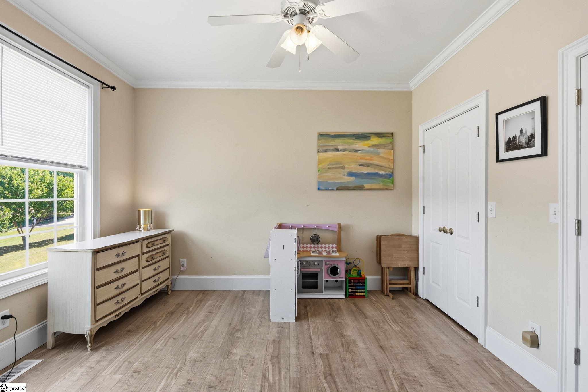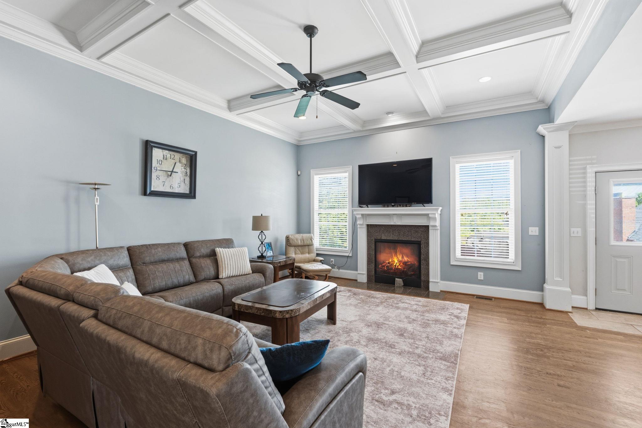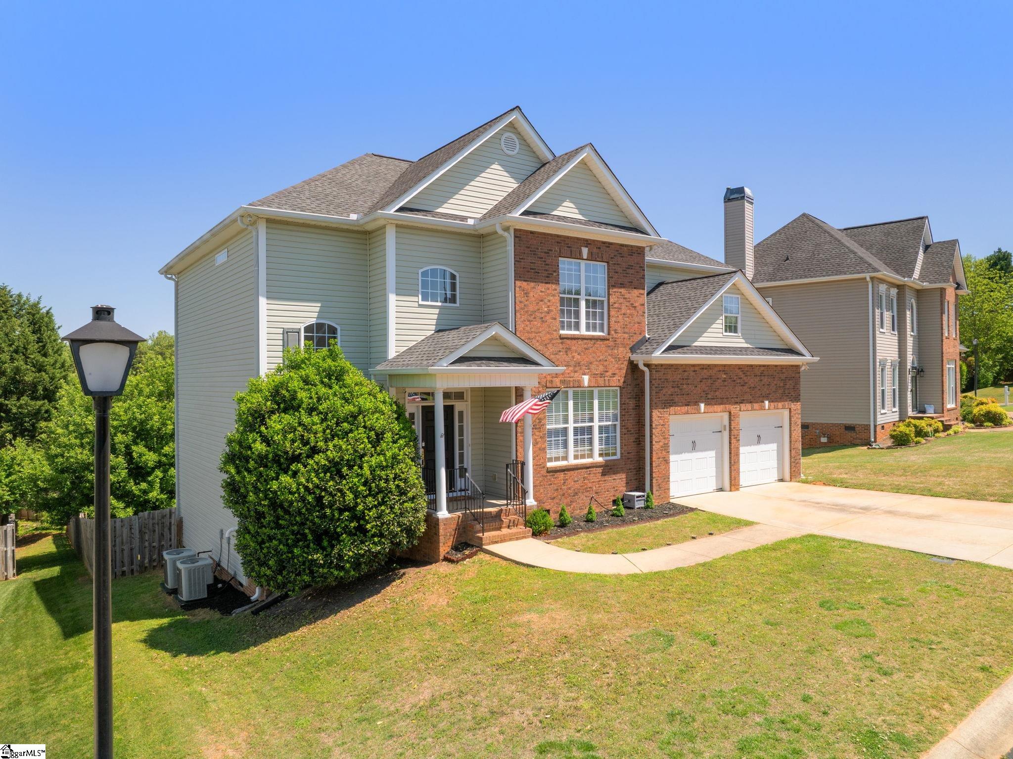 Relocating to the Upstate? This spacious 4-bedroom, 4-bath home in the highly sought-after Riverside School District offers the space, flexibility, and location today's buyers are searching for. With 11-foot ceilings and site-laid hardwood floors throughout most of the main level, the home feels open, elevated, and move-in ready. The thoughtfully designed layout includes a main-level bedroom and full bath; ideal for guests, multigenerational living, or a private work-from-home setup. The family room features coffered ceilings and flows easily into the main living areas, creating a comfortable space for both everyday living and entertaining. Upstairs, the primary suite includes a dedicated office or nursery, giving you the flexibility to adapt the space to your needs. Step outside to a fully fenced backyard; perfect for pets, play, or unwinding after a long day. Located within walking distance to Riverside High School, to shopping, dining, and a short drive to major commuting routes, this home makes settling into the Upstate seamless.