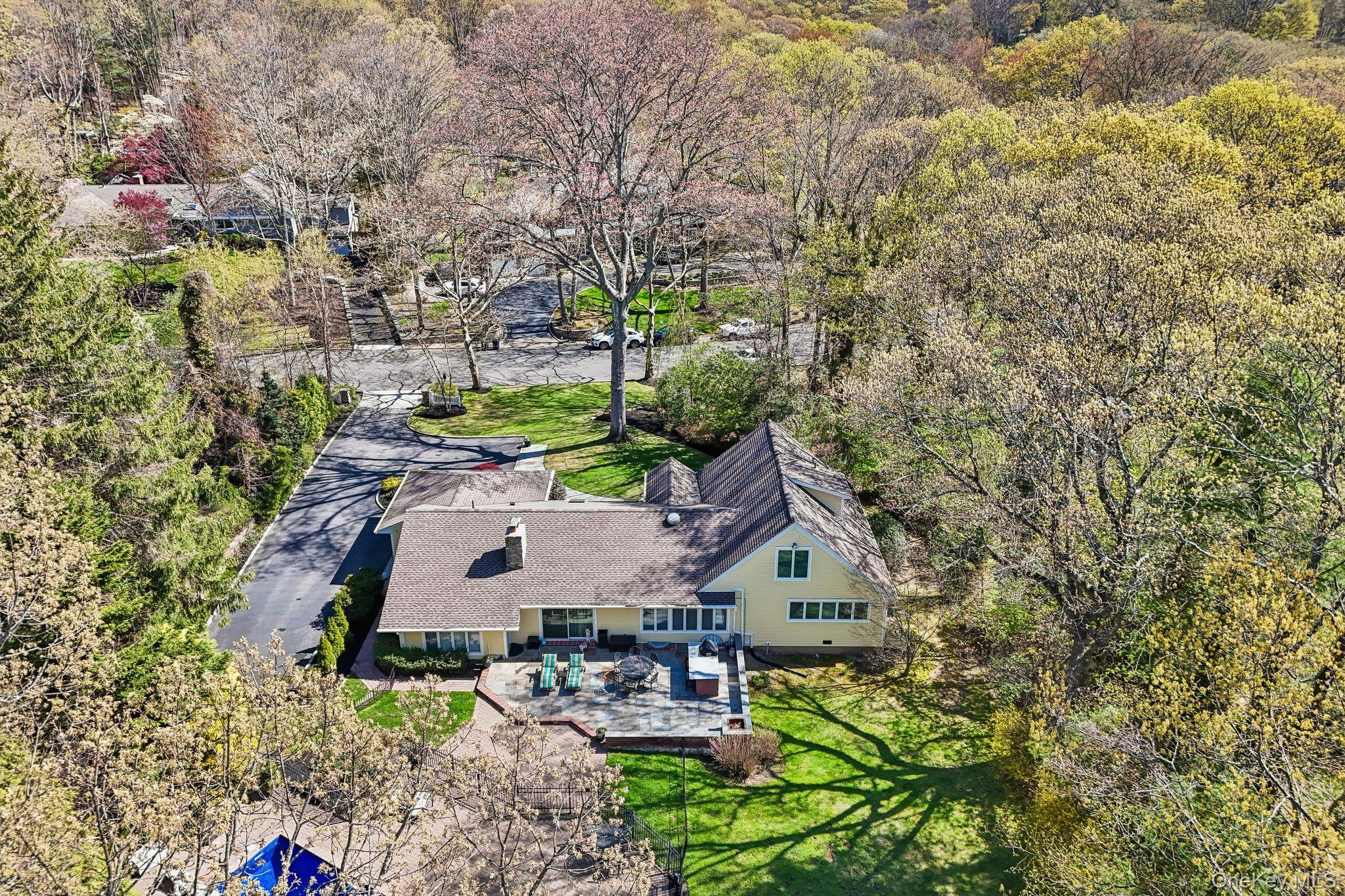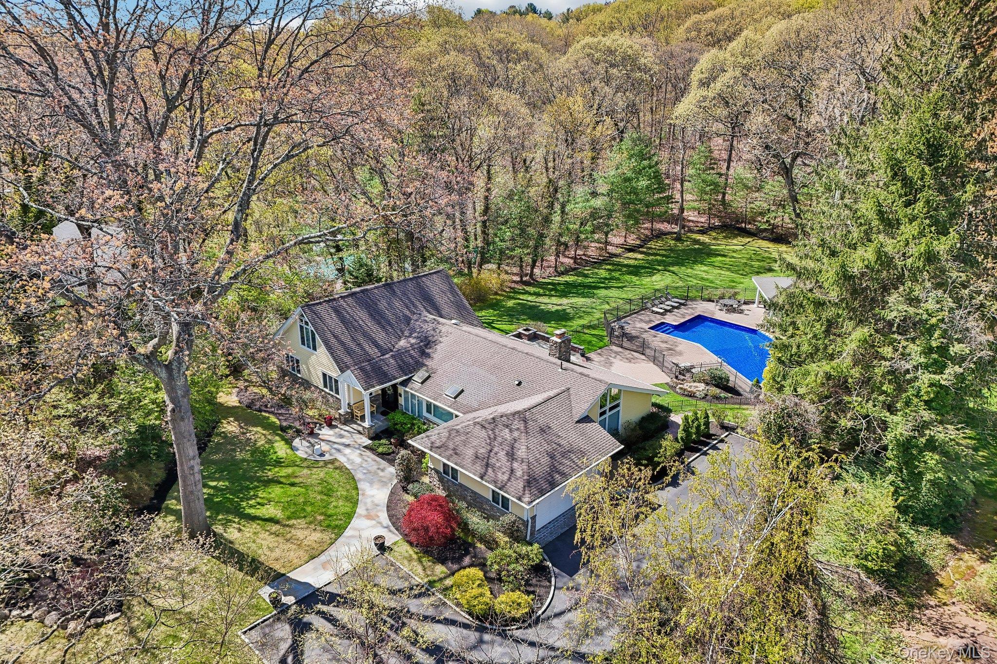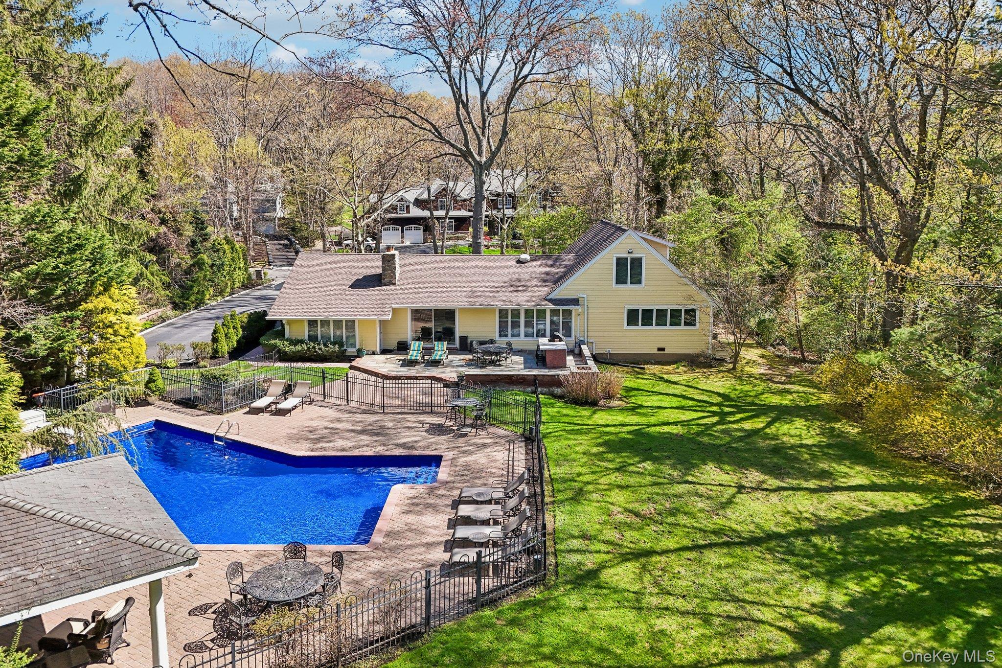 Welcome to this spacious and beautifully updated Farm Ranch set on a flat 1-acre property in desirable Melville, located within the Half Hollow Hills School District. This home offers 5 generously sized bedrooms - equipped with custom closet organization for optimal storage and convenience, 3 full bathrooms, and 1 half bath, providing plenty of room for comfortable living and entertaining. The main level features a beautifully updated eat-in kitchen with exquisite two-tone cabinetry, a large center island great for serving or casual dining, and amazing natural light pours through the skylights and wall of windows. The dining room is equipped with a custom built-in buffet and bar area. The spacious living room overlooks the backyard while the family room has a fireplace - perfect for gatherings year-round. Hardwood flooring flows throughout these main living areas, adding warmth and character. The second floor offers two additional large bedrooms with another full bathroom. The exterior of the home as been updated as well with Hardie Siding and Connecticut rock walls. The roof features architectural style shingles and Andersen windows throughout. Step outside to enjoy your private backyard oasis featuring an in-ground pool with a newer liner installed in 2023, ideal for summer relaxation. Get some shade under the large pool-side pavillion or hangout on the large bluestone patio offering a built-in BBQ and bar area with ample space for dining and relaxing. Conveniently located near shopping, major parkways, and the LIRR, this home combines space, updates, and location in one exceptional offering.