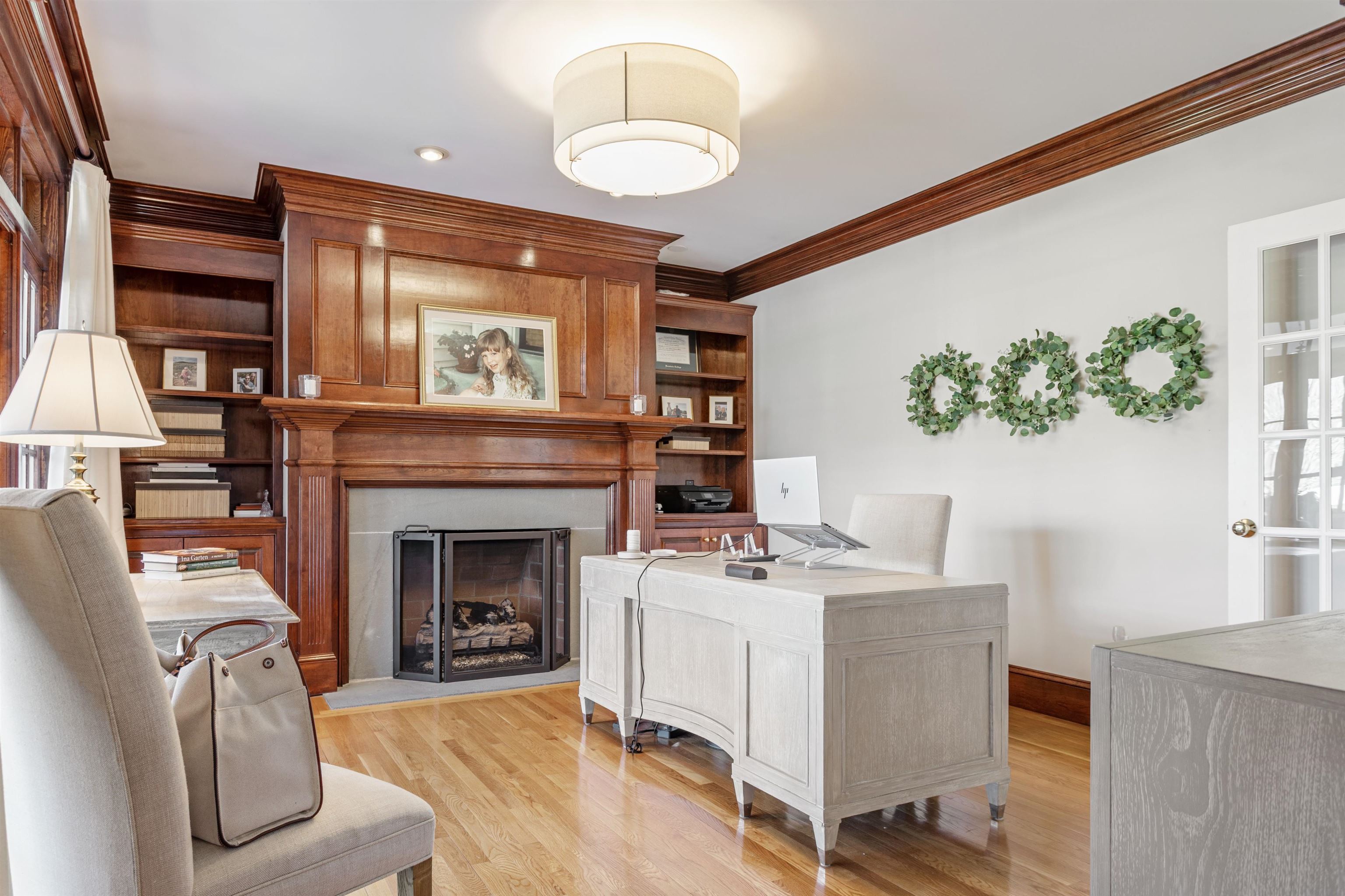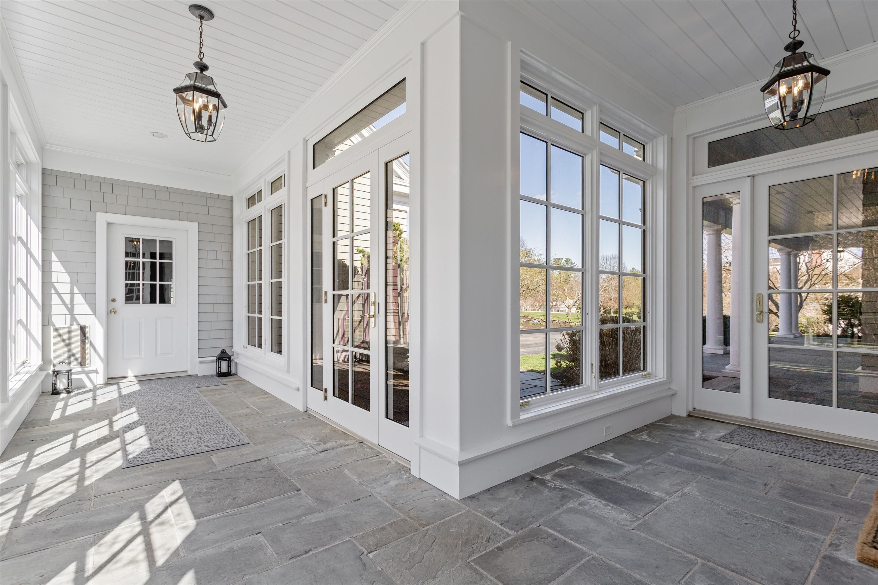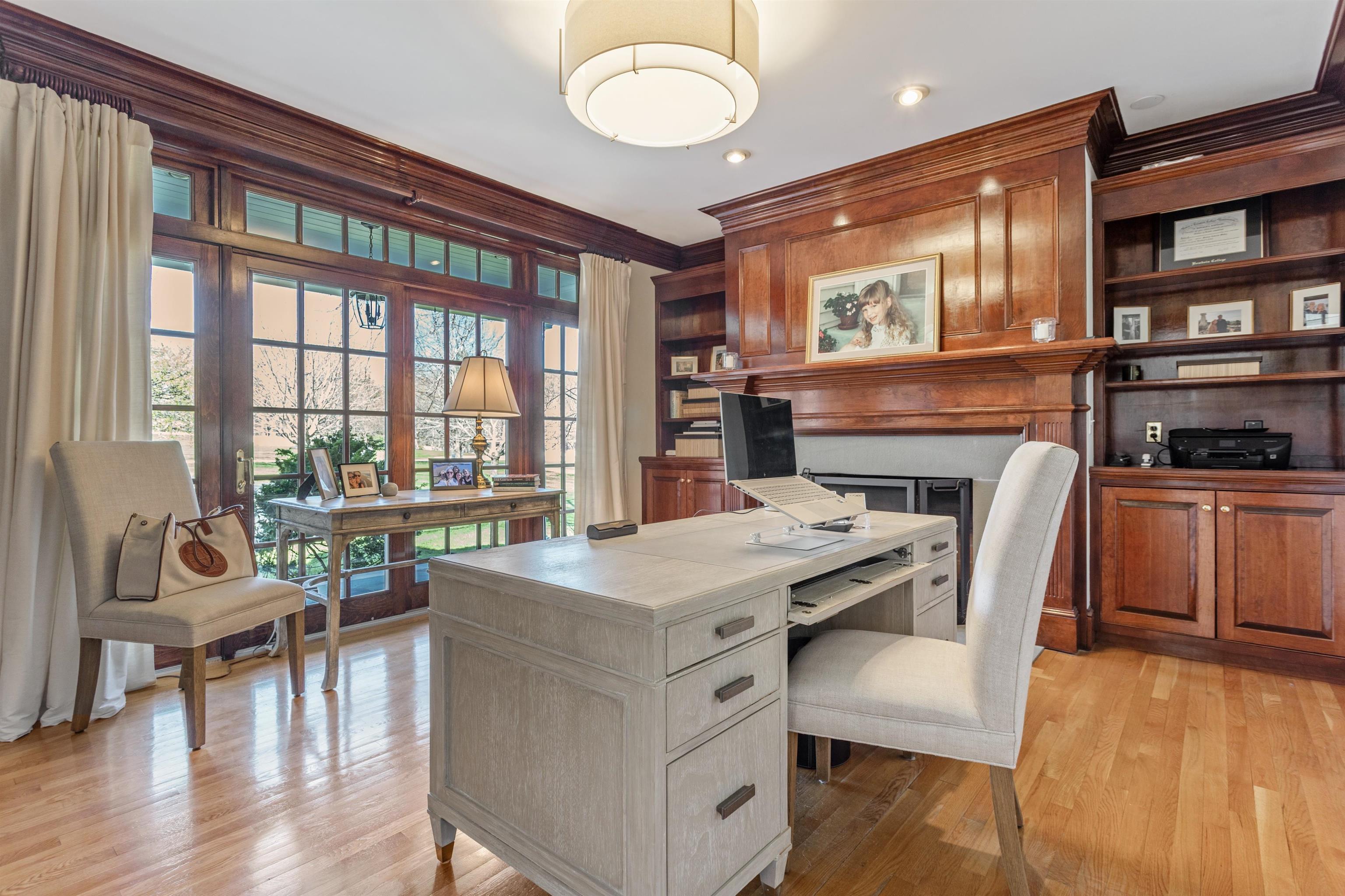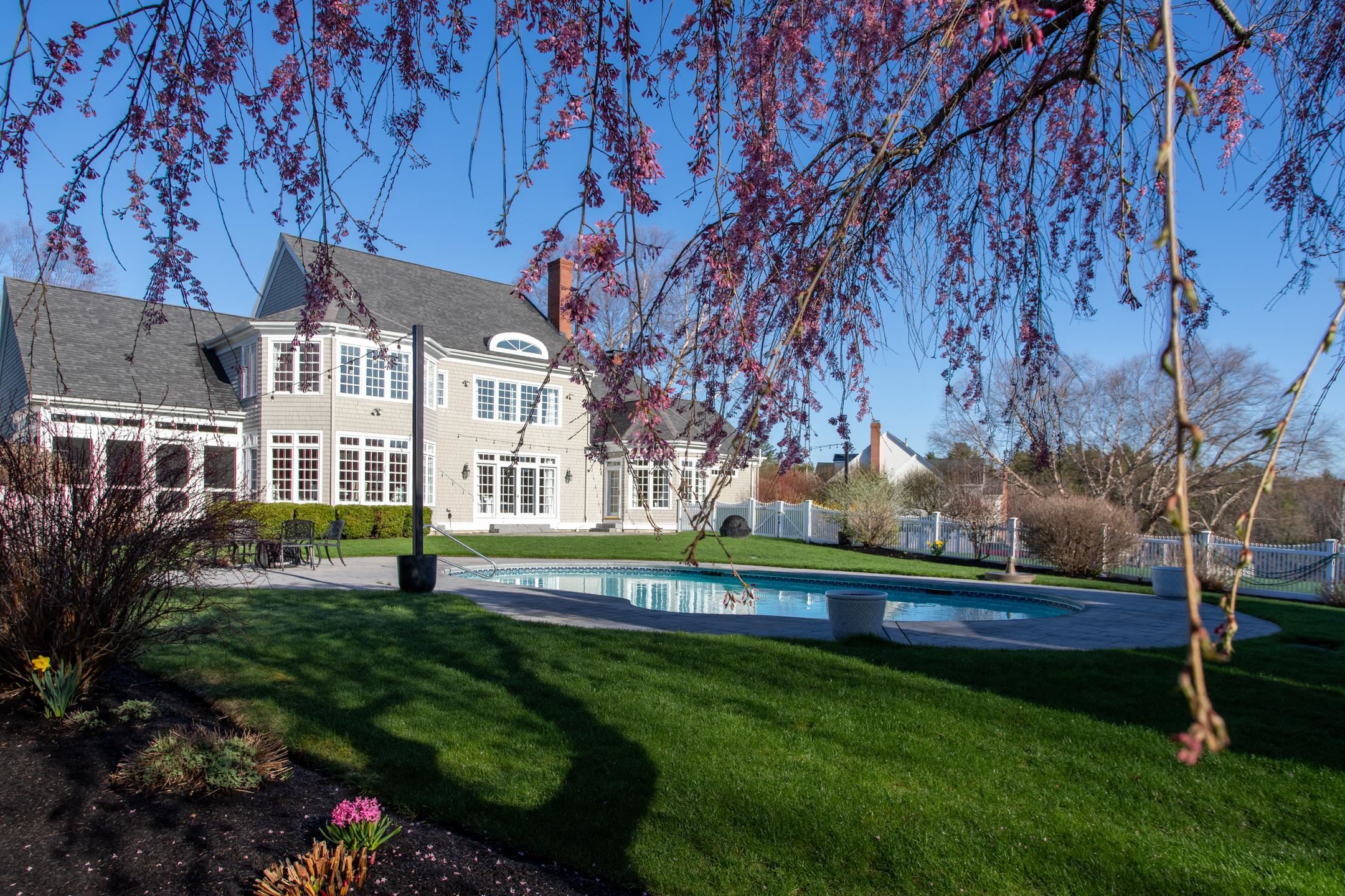 Rural Hampton Falls provides the setting for this DeStefano Architect–designed, colonial-style fifteen-room, four-bedroom residence, sited majestically on a professionally landscaped 2. 29-acre lot. A lush lawn, fenced gunite pool, and serene cul-de-sac location—shared with just three other homes—create a private retreat, all just minutes from I95, shopping, and local schools. From the moment you enter the circular driveway, it’s clear this is an architecturally distinctive home. Striking double mahogany doors welcome you inside, where more than 750 square feet of bluestone-covered porches seamlessly connect indoor and outdoor living, offering shelter from the elements and access to the garage and private office suites above. The two-story foyer showcases exceptional finish work and design detail. A generous formal dining room sits just off the epicurean-inspired custom kitchen, featuring hand-crafted cabinetry, a substantial island, and Subzero refrigeration. The home chef will appreciate the impressive 60" Garland range with six gas burners, griddle, double ovens, Salamander broiler, and a commercial-grade stainless steel hood with warming shelf. An outstanding butler’s pantry with a farmer’s sink and abundant cabinetry adds both function and charm. The kitchen’s breakfast bar opens to a sun-filled breakfast room with built-in seating. The great room, complete with a gas fireplace and custom built-ins, overlooks the rear grounds and heated pool. A luxurious first-floor primary suite offers a gas fireplace, walk-in closet, and spa-like bath with an 8' x 4' steam shower. The richly appointed library, with its own fireplace and extraordinary millwork, is truly one of a kind. Located less than an hour from Logan International Airport and downtown Boston, this home offers an ideal commuting location while remaining just ten minutes from New Hampshire’s beaches and historic downtown Exeter, and only twenty minutes from Portsmouth and Newburyport. Showings begin 4/24/25