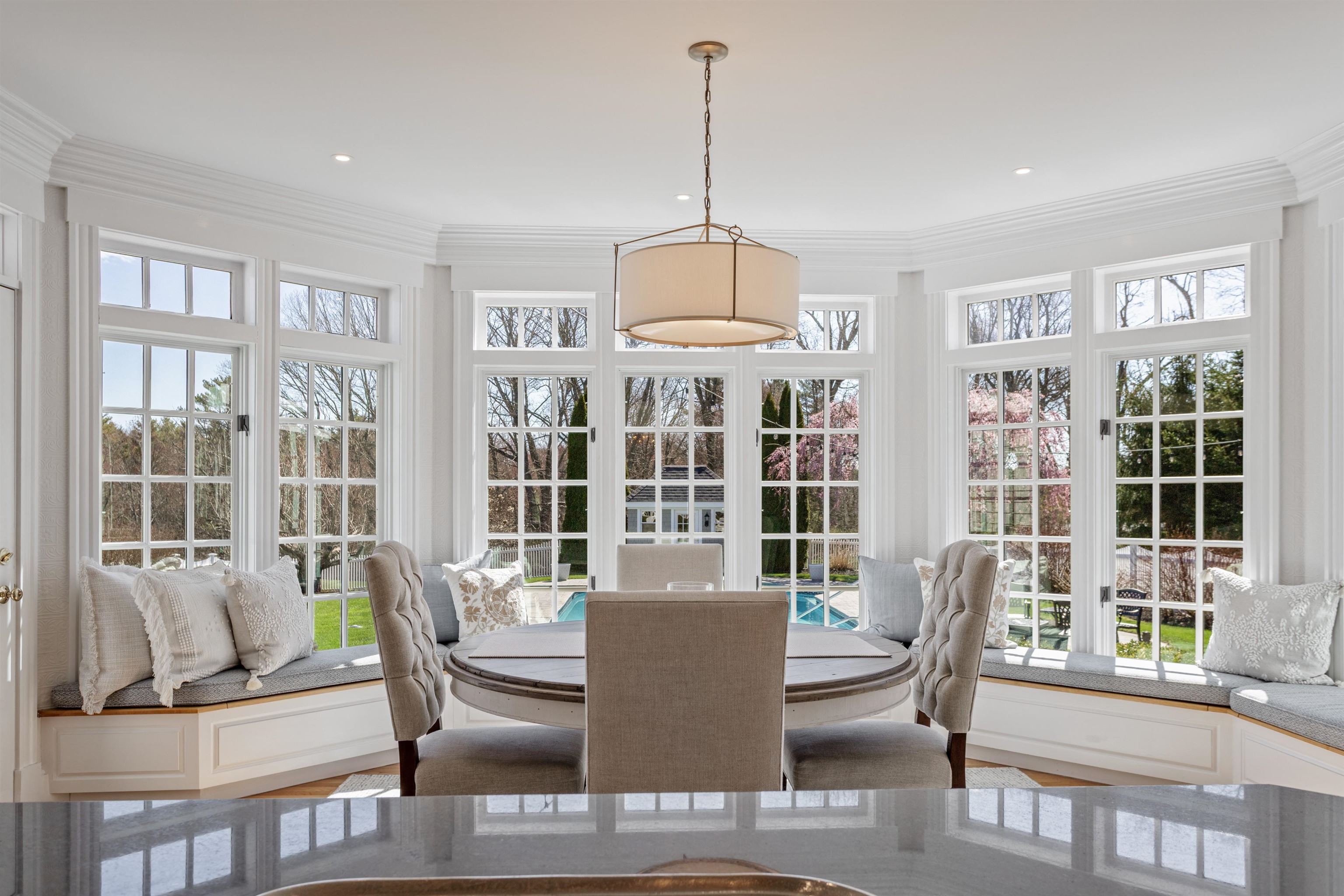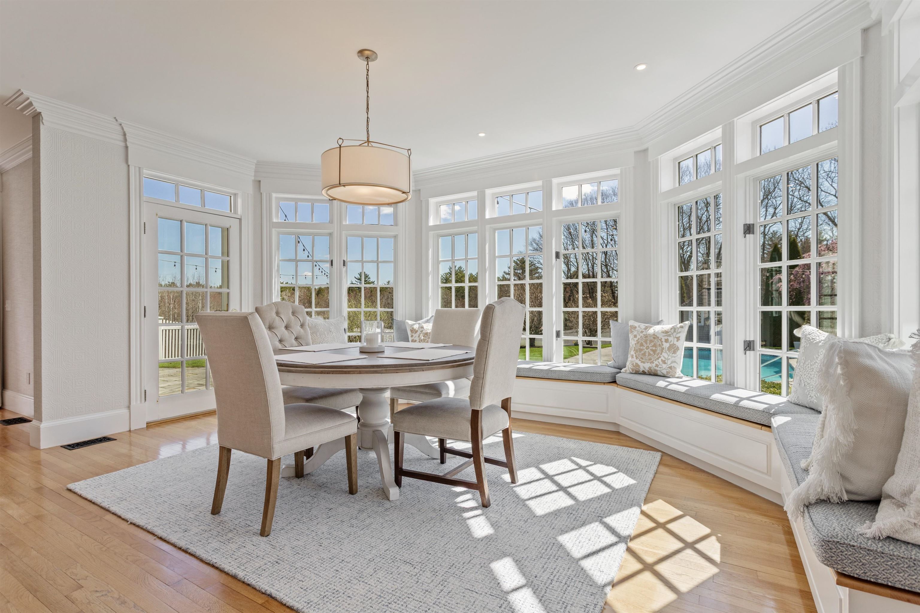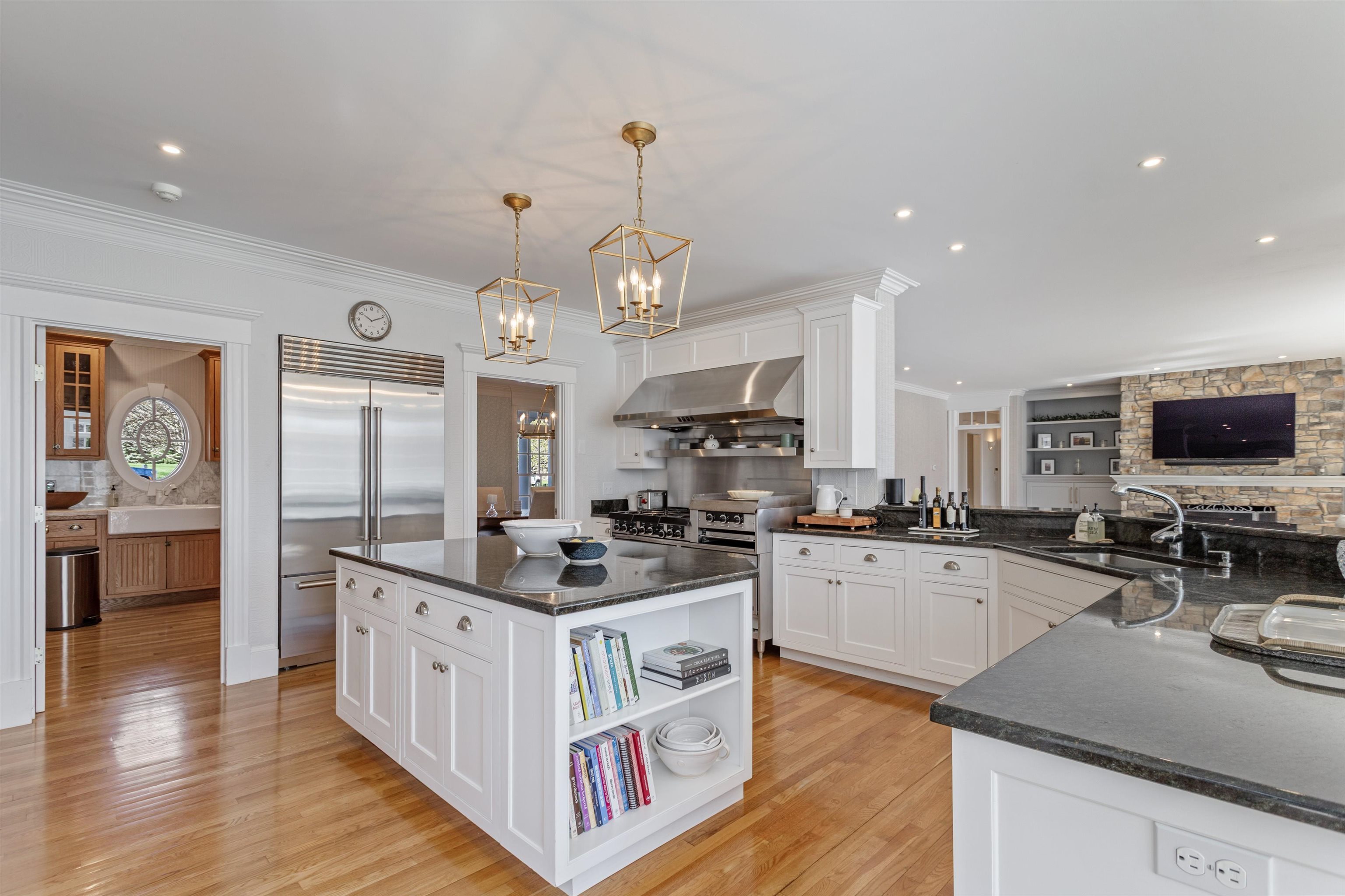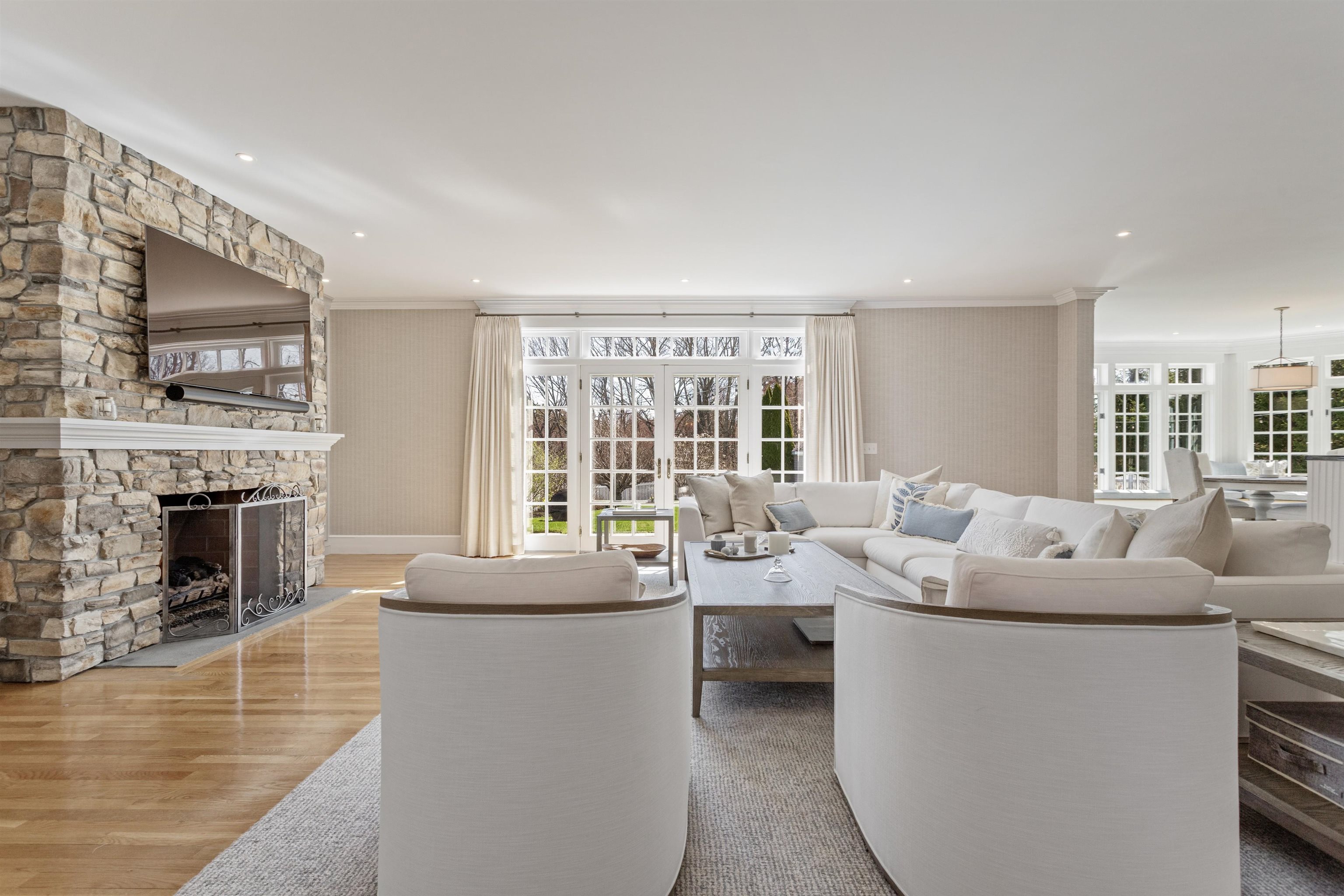Rural Hampton Falls provides the setting for this DeStefano Architect–designed, colonial-style fifteen-room, four-bedroom residence, sited majestically on a professionally landscaped 2. 29-acre lot. A lush lawn, fenced gunite pool, and serene cul-de-sac location—shared with just three other homes—create a private retreat, all just minutes from I95, shopping, and local schools. From the moment you enter the circular driveway, it’s clear this is an architecturally distinctive home. Striking double mahogany doors welcome you inside, where more than 750 square feet of bluestone-covered porches seamlessly connect indoor and outdoor living, offering shelter from the elements and access to the garage and private office suites above. The two-story foyer showcases exceptional finish work and design detail. A generous formal dining room sits just off the epicurean-inspired custom kitchen, featuring hand-crafted cabinetry, a substantial island, and Subzero refrigeration. The home chef will appreciate the impressive 60" Garland range with six gas burners, griddle, double ovens, Salamander broiler, and a commercial-grade stainless steel hood with warming shelf. An outstanding butler’s pantry with a farmer’s sink and abundant cabinetry adds both function and charm. The kitchen’s breakfast bar opens to a sun-filled breakfast room with built-in seating. The great room, complete with a gas fireplace and custom built-ins, overlooks the rear grounds and heated pool. A luxurious first-floor primary suite offers a gas fireplace, walk-in closet, and spa-like bath with an 8' x 4' steam shower. The richly appointed library, with its own fireplace and extraordinary millwork, is truly one of a kind. Located less than an hour from Logan International Airport and downtown Boston, this home offers an ideal commuting location while remaining just ten minutes from New Hampshire’s beaches and historic downtown Exeter, and only twenty minutes from Portsmouth and Newburyport. Showings begin 4/24/25