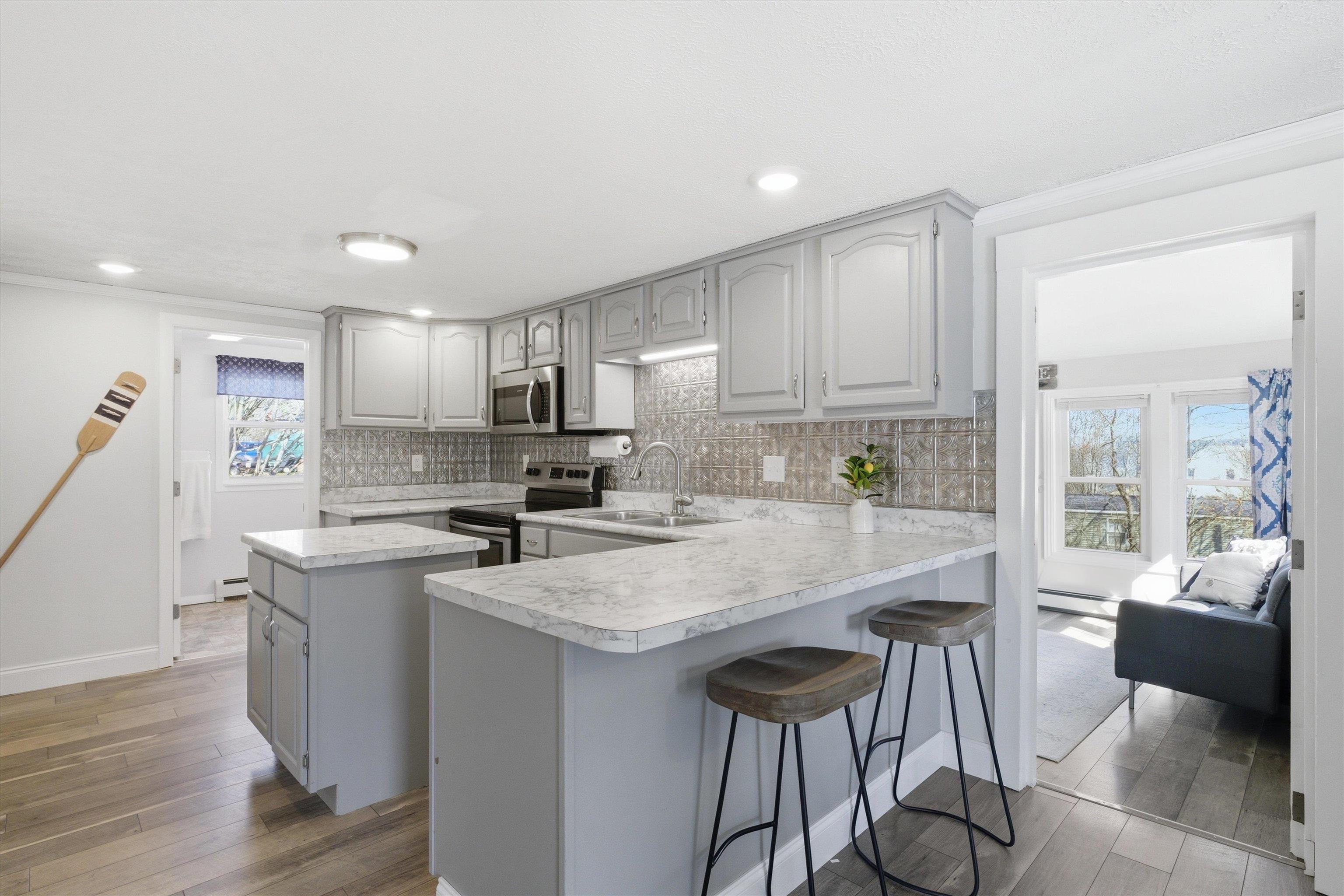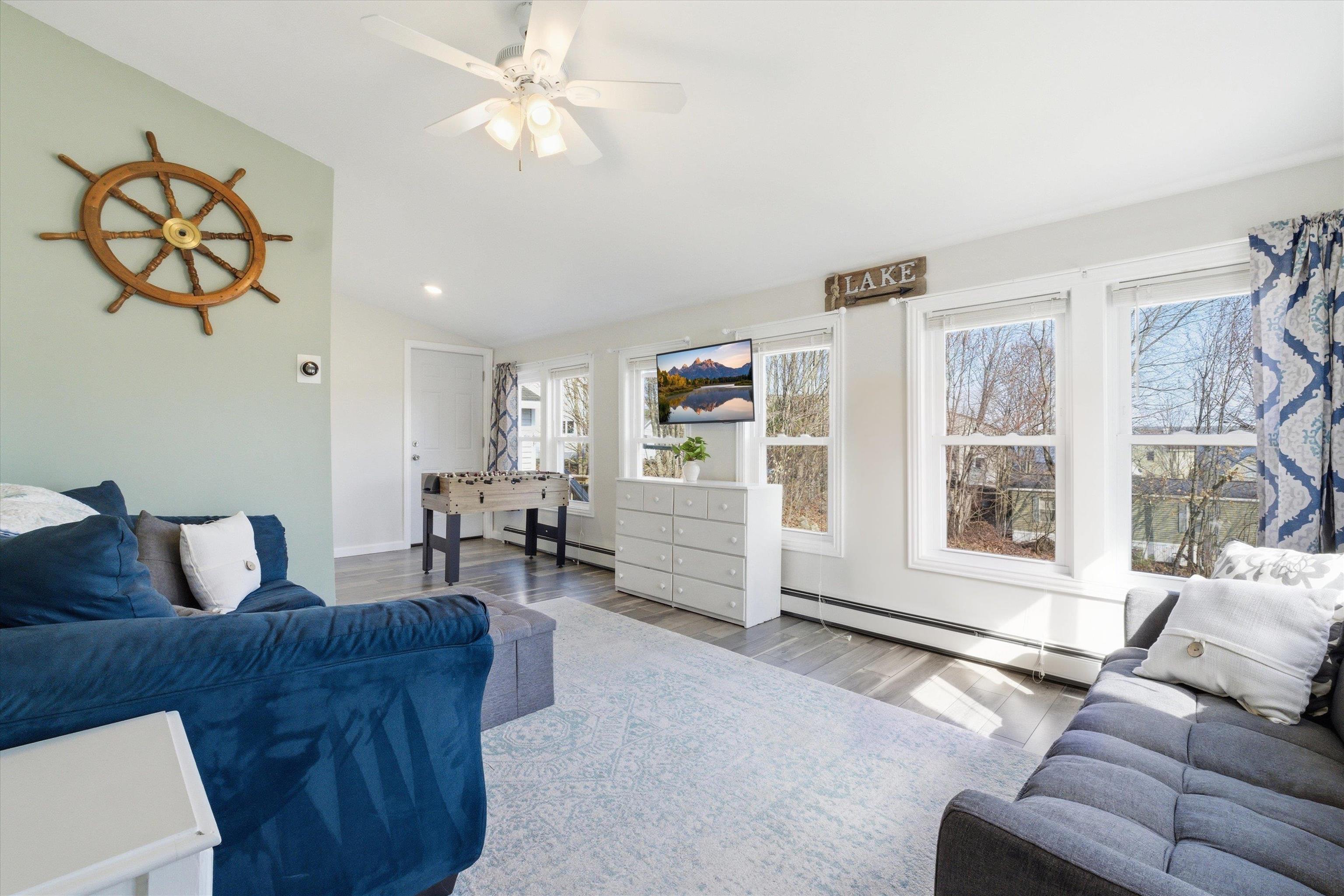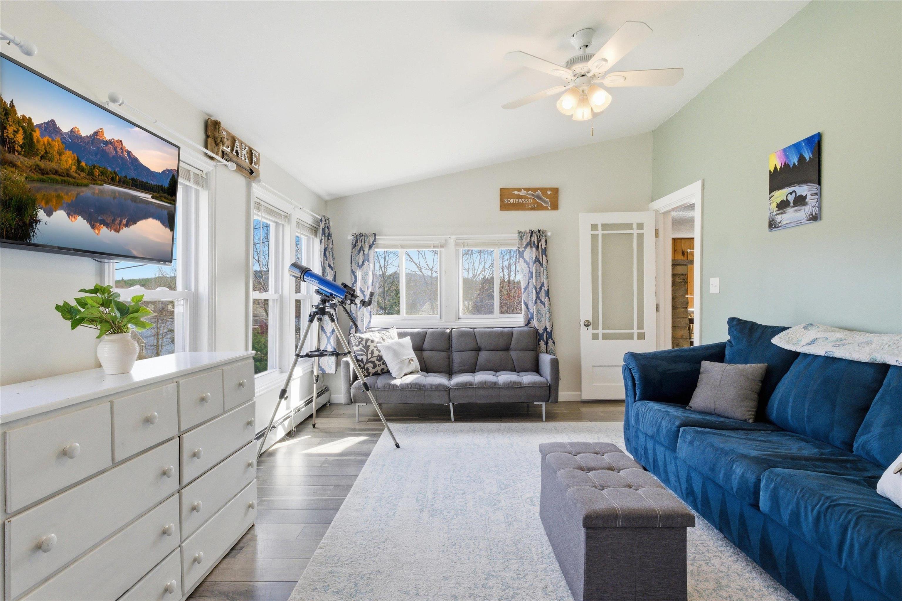 Lakefront opportunity on Northwood Lake, this waterfront property offers the kind of getaway people look for in every season. Set on almost 1/2 an acre, the property features private waterfront with a beach area, dock, gazebo, multiple patios, deck space, and plenty of room for boats, trailers, and guest parking. The home is served by a 2-bedroom septic system and is currently configured with 3 bedrooms. Inside, the open-concept layout brings the lake into everyday living, with a spacious living room, dining/office area, and remodeled kitchen with center island, plus a bonus sunroom that creates flexible space for guests, play, or extra sleeping options. Many rooms enjoy beautiful lake views. Recent improvements include high-efficiency tankless combi-boilers for heat and hot water, replacement windows, updated sliders to the deck and exterior door, added closed-cell foam and batt insulation, remodeled kitchen and bathrooms, and luxury vinyl plank flooring throughout. Enjoy days on the water boating, fishing, kayaking, paddleboarding, or swimming, then relax by the lake as the sun goes down. Ideal for summer fun, fall foliage, and winter recreation, with convenient access to restaurants, shopping, the Seacoast, skiing, and Boston, plus walking-distance access to pizza, ice cream, and drinks. Offered furnished is a possibility, creating a truly turnkey opportunity for personal use or rental income. Excellent option for a vacation home or investment. Seller reports the property has averaged $17, 522 annually on VRBO over the past 3 years.