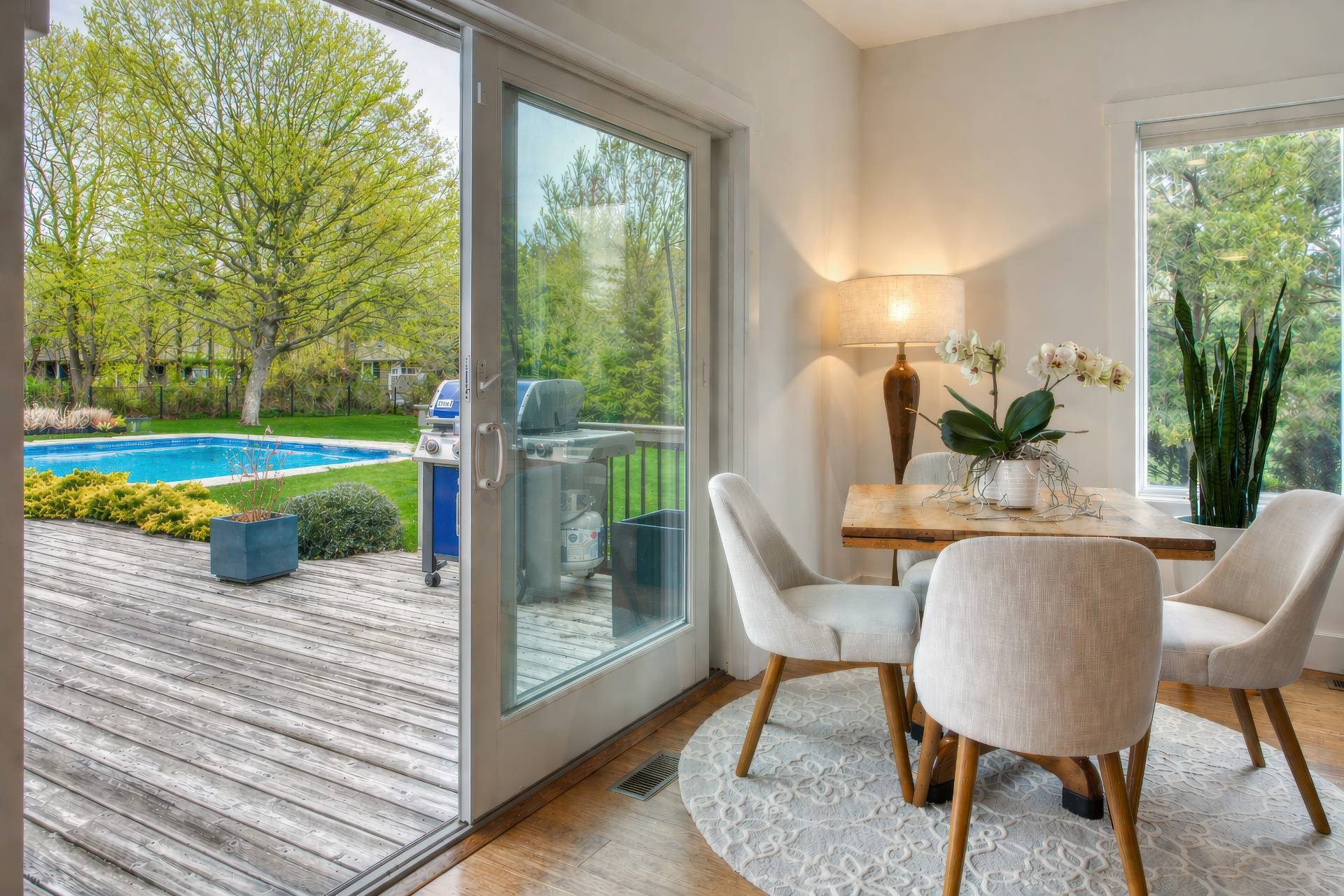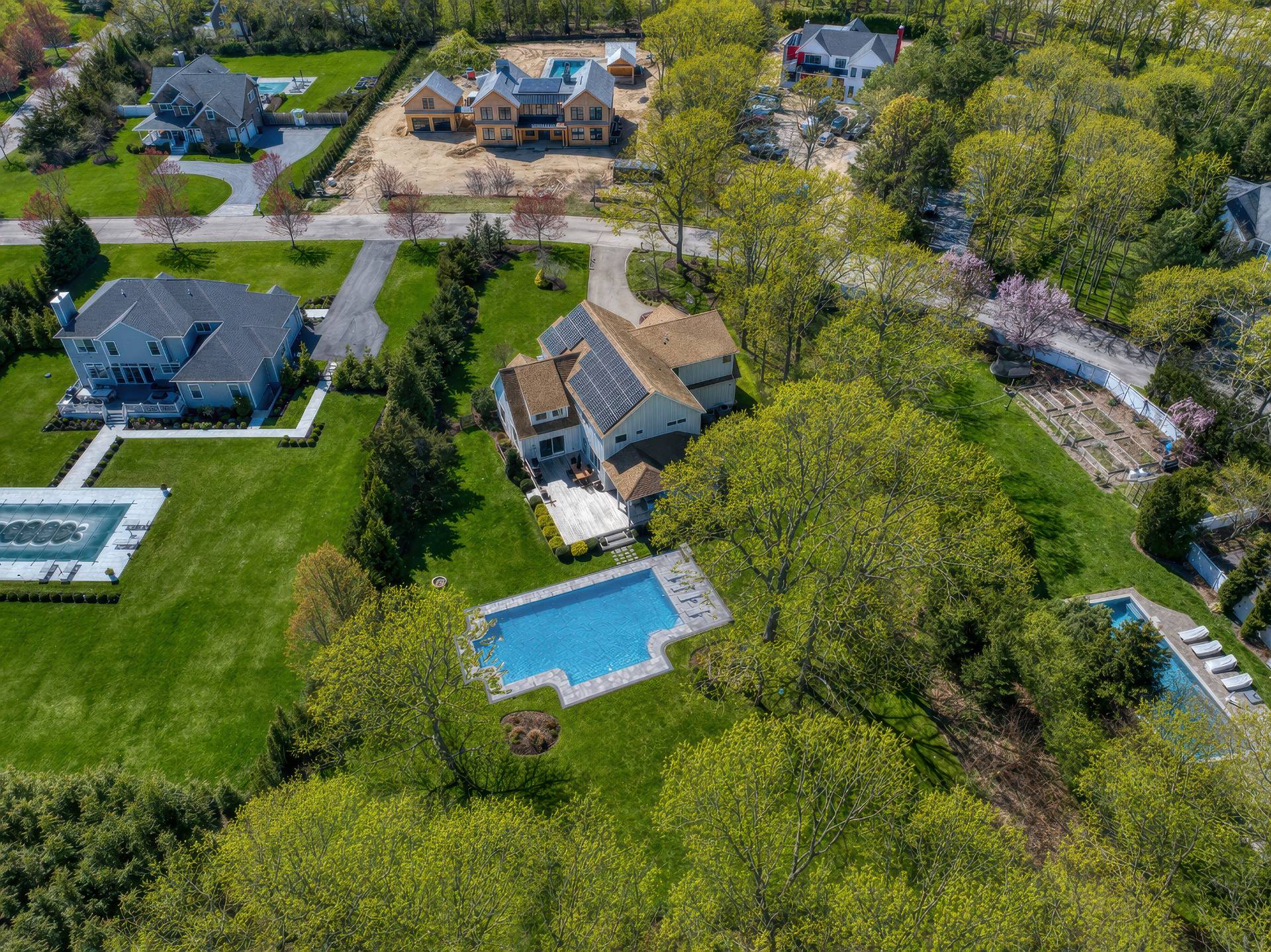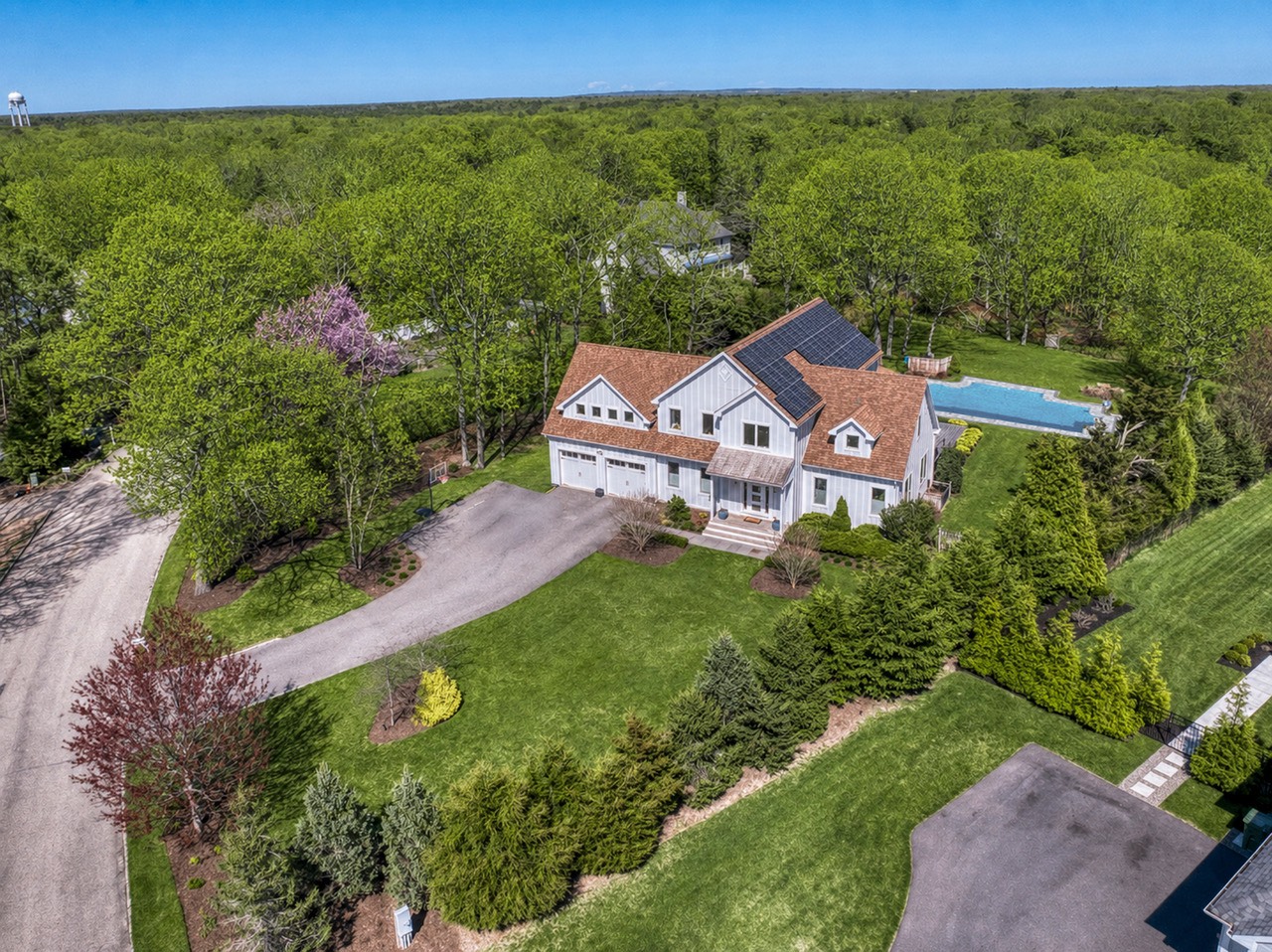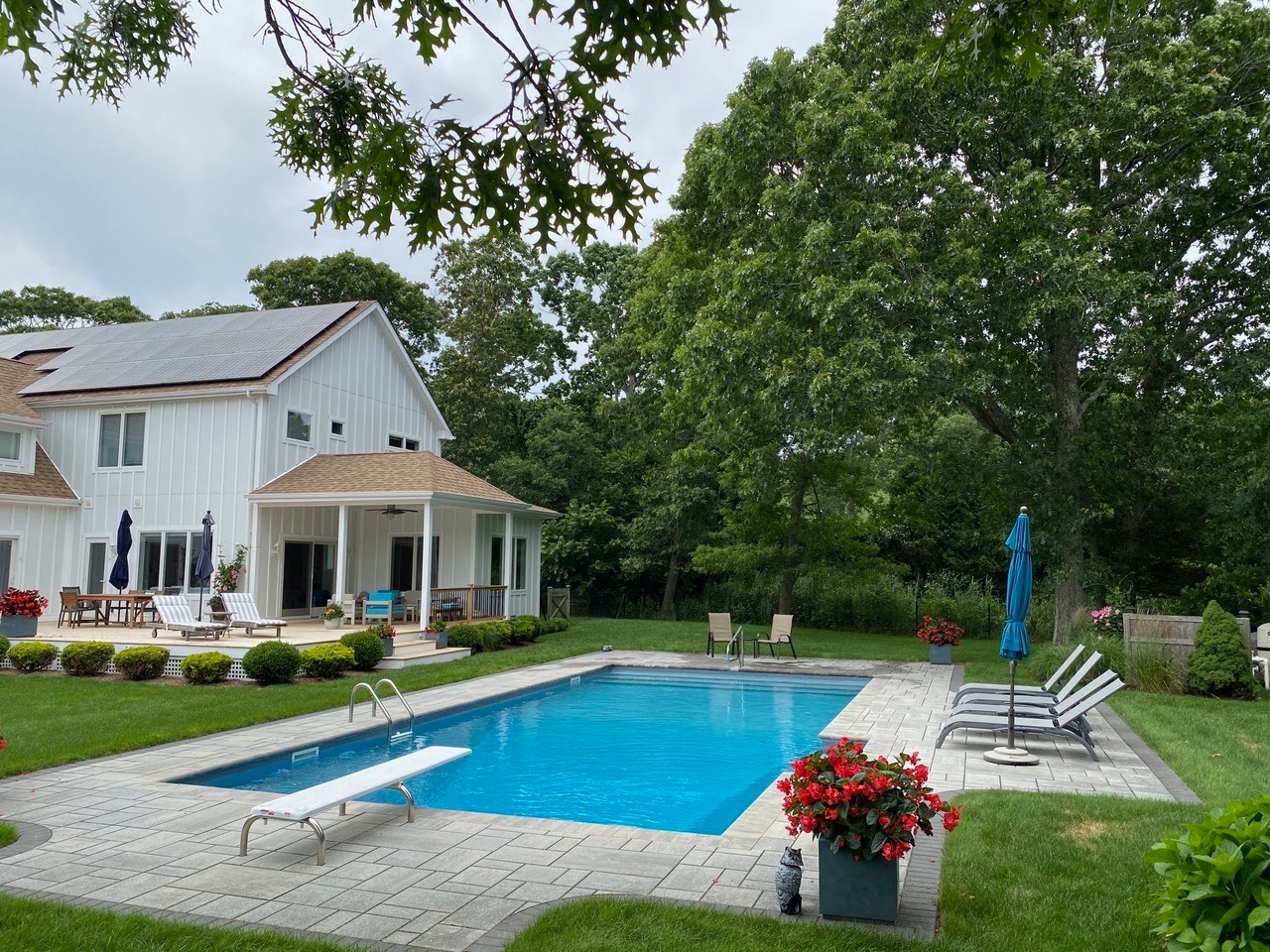 This exceptional home at 17 Willowood Court in Westhampton is a rare offering showcasing high quality construction on a private one-acre lot. Thoughtfully designed with southern exposure, the home is filled with natural light, creating bright and inviting main living spaces throughout the day. The outdoor setting is a true highlight, featuring an oversized 18' x 40' heated saltwater pool, perfectly positioned for all-day sun and endless enjoyment. Overlooking the pool is an expansive 800-square-foot deck-ideal for entertaining, outdoor dining, or simply relaxing in a peaceful, private setting. Inside, the home offers a comfortable open-concept floor plan with extensive views of the surrounding natural landscape from every room. The chef's kitchen is equipped with all-new stainless-steel appliances and a generous 6-foot center island, serving as the perfect gathering space. The first floor includes a spacious primary suite with a walk-in closet, offering both comfort and convenience. Upstairs, you'll find three additional bedrooms and a multi use family room. Above the garage is a 16' x 24' vaulted bonus room with a full bathroom, providing exceptional additional space for recreation, work, exercise, or relaxation. Additional features include solar panels, radiant heat in bathroom floors and a basement with high ceilings and egress windows, offering excellent potential to create additional finished living space if desired. Blending modern design, thoughtful layout, and resort-style outdoor living, this home delivers an exceptional Westhampton retreat.
