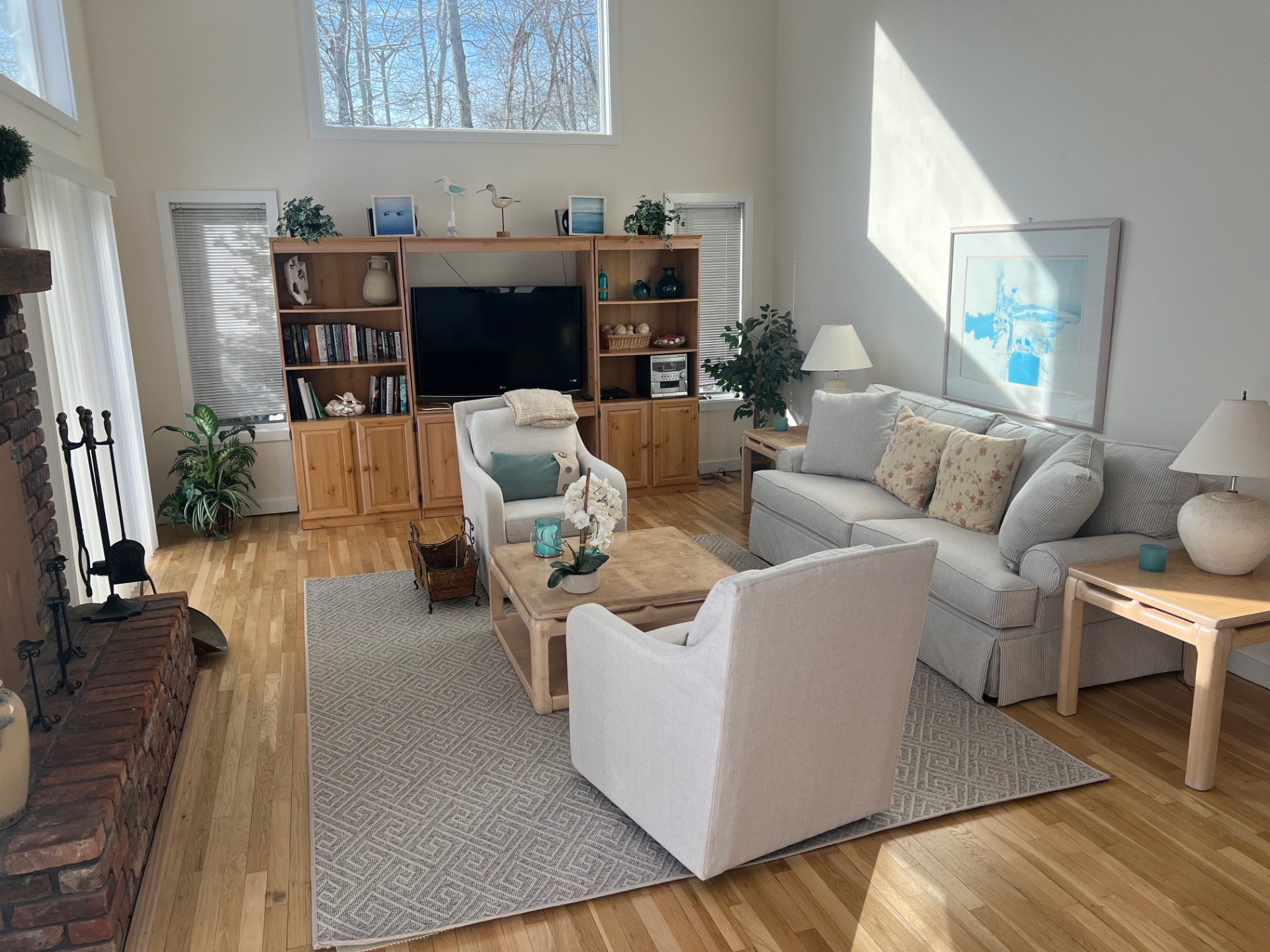 RR# 22-919 Edge of East Hampton Village. Great value and currently available. One story open plan contemporary has three bedrooms, two baths, one ensuite, open plan brand new kitchen, living room with fireplace and sliders to deck and pool. Newly refinished floors, just painted and very clean. Situated on one acre at the end of a private drive. Convenient to shopping, restaurants, village and ocean.